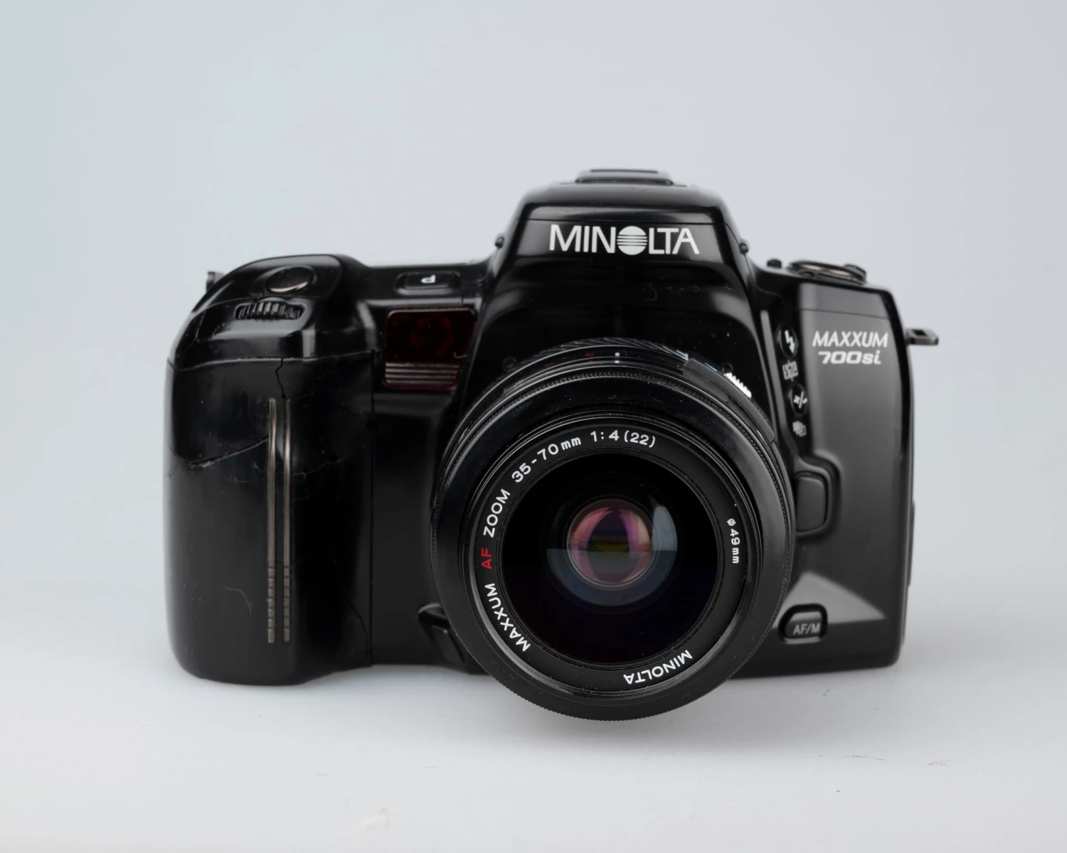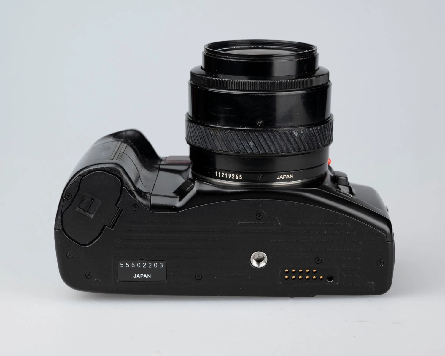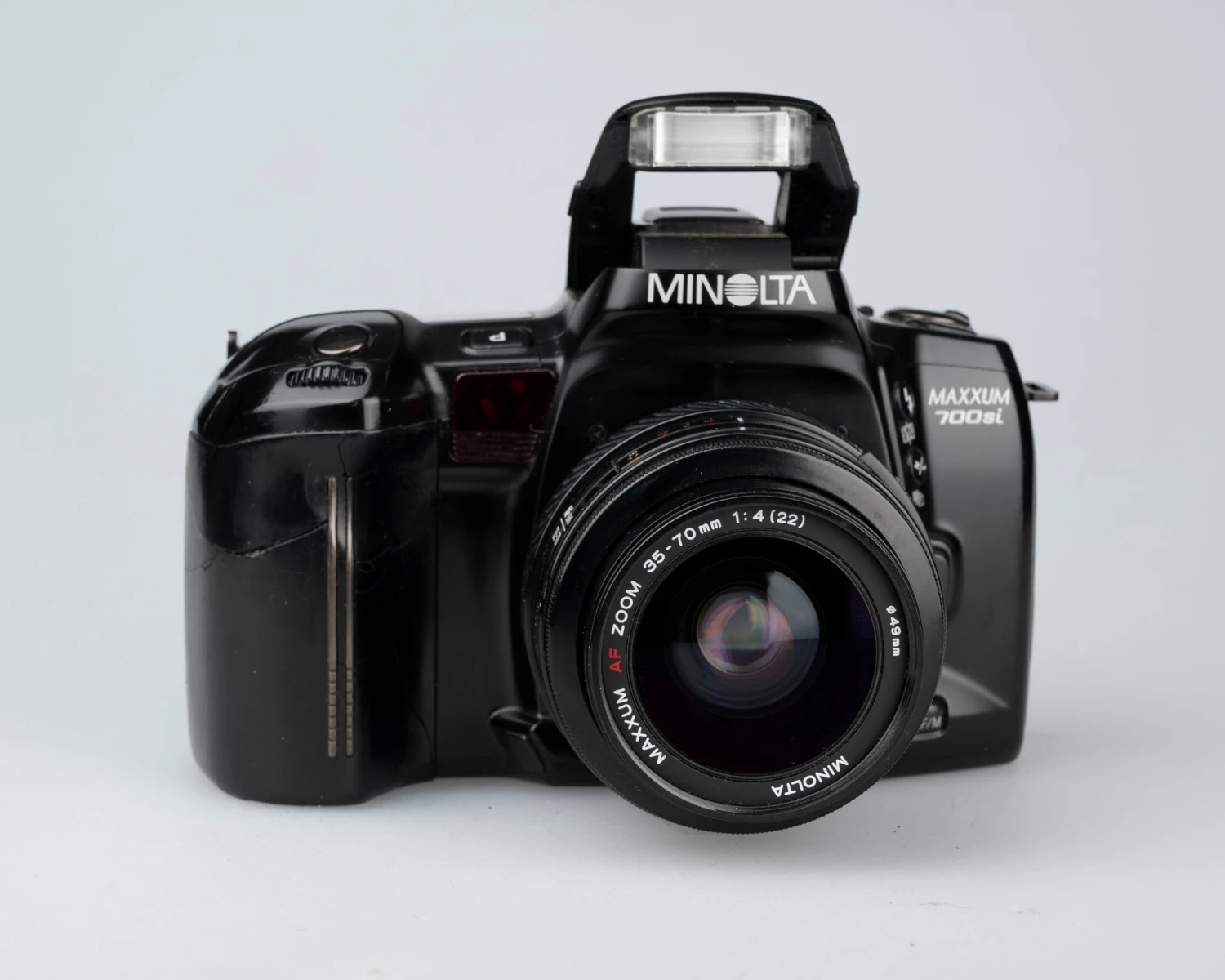 The Minolta Maxxum is an advanced 35mm SLR camera released in 1993. This camera does a fine job of including a large number of advanced features in a manner that is intuitive and not distracting. It’s an equally good choice for an experienced photographer or ambitious beginner looking for a sturdy, robust, high-spec film camera. On the other hand, some people might find it a bit heavy for their taste (we measured the camera and lens as 866 grams together).