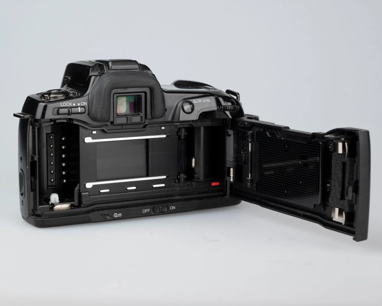 The camera and the included Minolta Maxxum AF Zoom 35-70 1:4 lens are in very good cosmetic condition (see photos). The most noteworthy cosmetic flaws: 1) some cracking on the rubber grip (common with 1980s and 1990s Minoltas) and 2) a small mark on the top of the viewfinder display (doesn’t affect photos). All features are working correctly and the shutter is firing with good accuracy at all speeds (verified with a shutter analyzer). In addition, we tested the camera and lens with an exposure tester, its light metering and autoexposure accuracy are excellent. It was tested with film installed but the film was not processed.