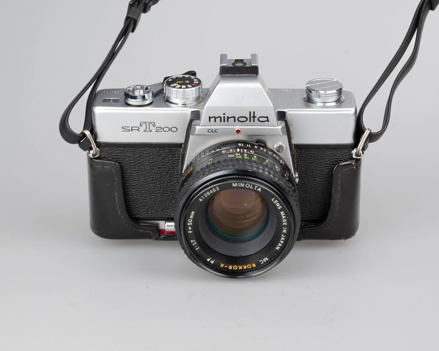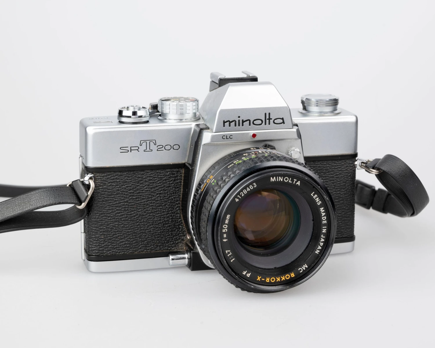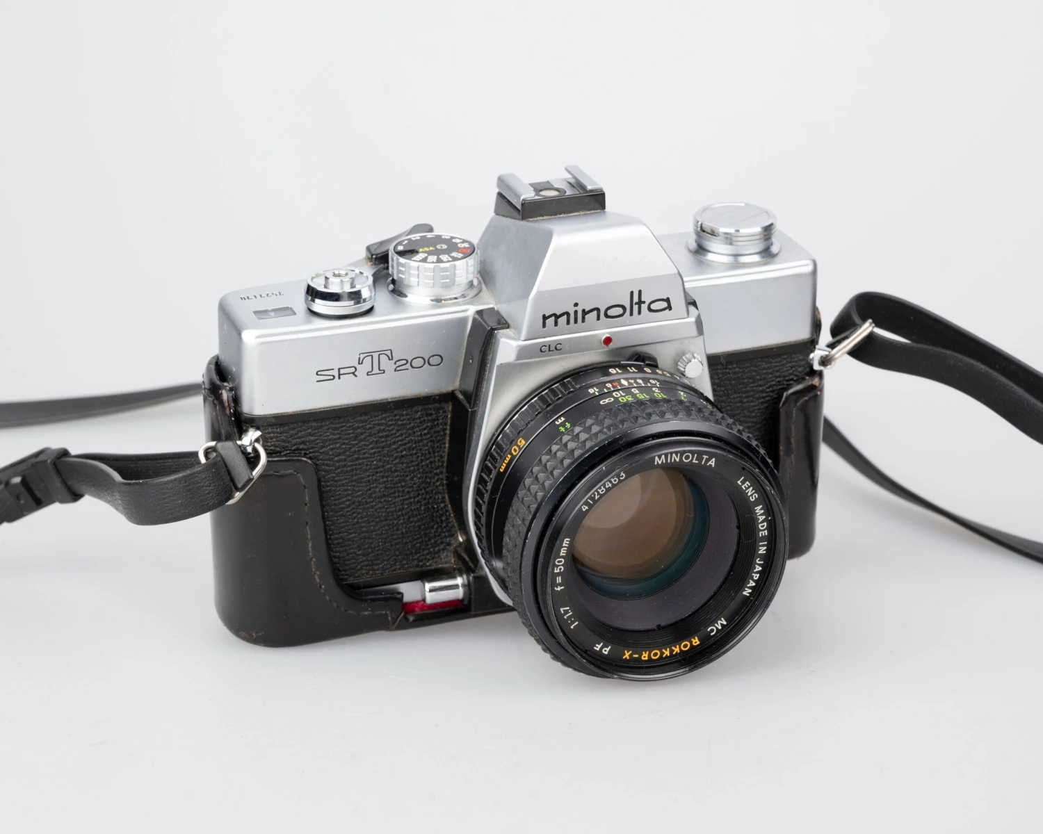 The Minolta SRT 200 is a classic mechanical 35mm film SLR with high quality all metal construction. The included lens is a fast and very sharp MC Rokkor-X PF 50mm f/1.7(50cm minimum focus distance; 6 Elements in 5 Groups). It features Minolta’s CLC (contrast light compensator) light meter circuit for excellent exposure accuracy in normal shooting conditions.