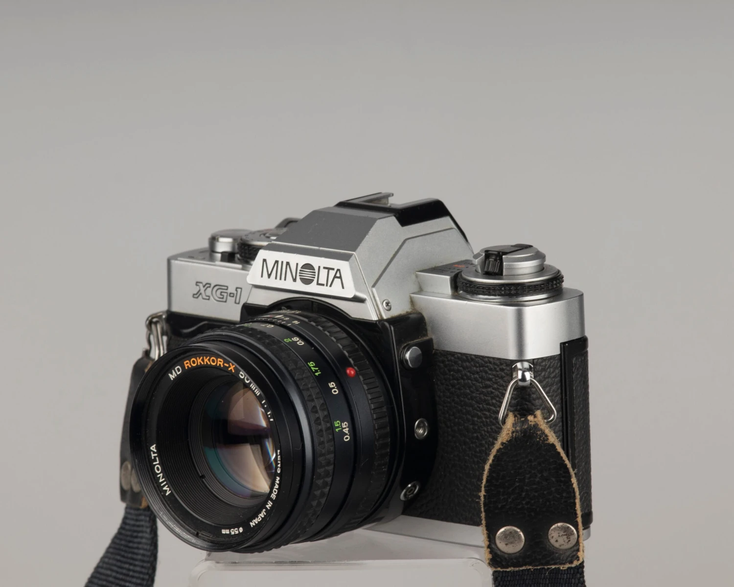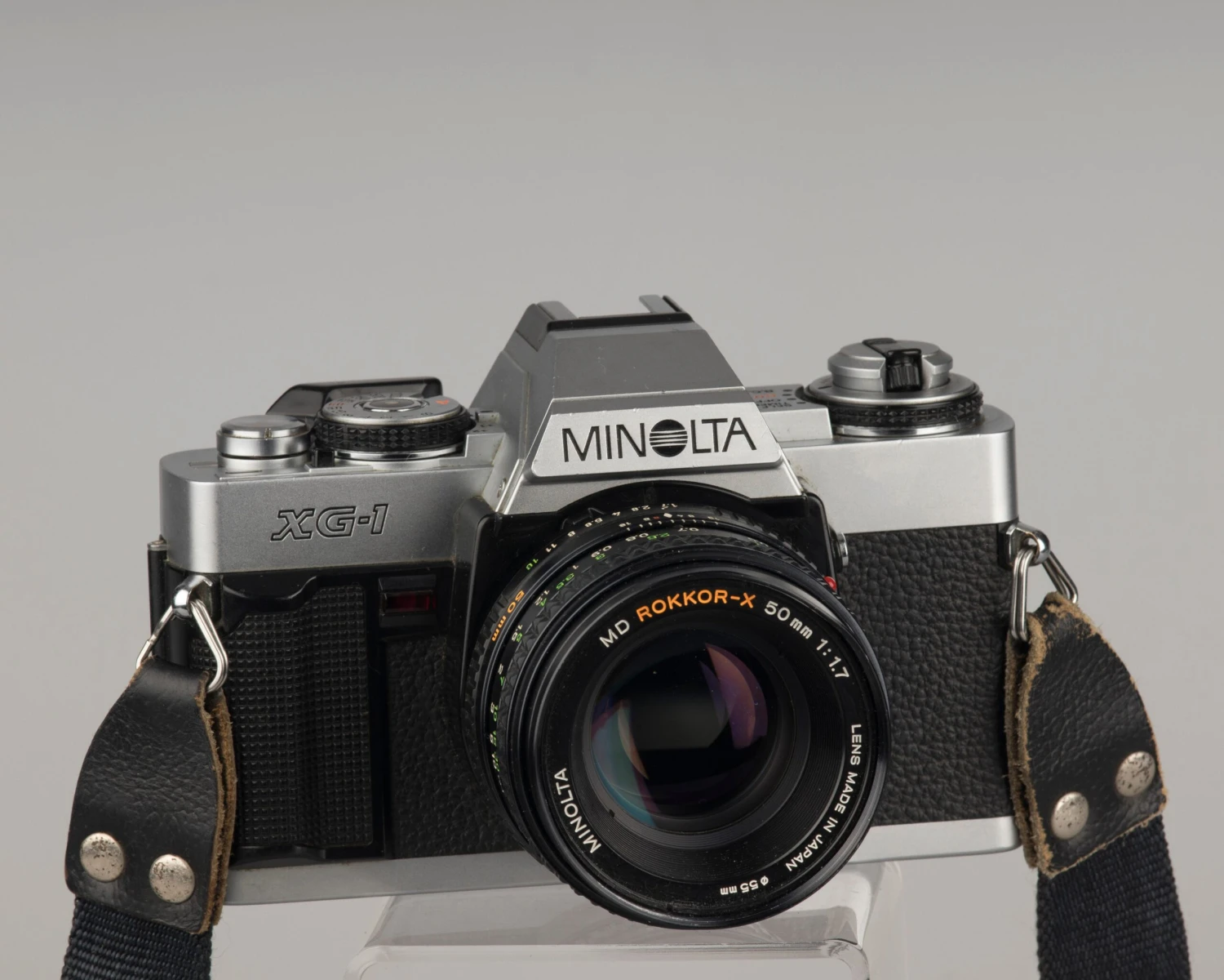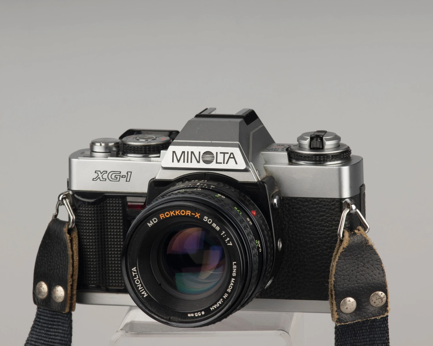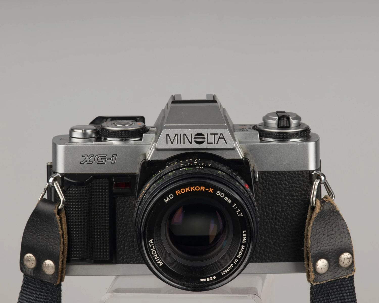The Minolta XG-1n is a manual focus 35mm SLR from the 1980s that features aperture-priority auto exposure. This camera includes a sharp and fast Minolta Rokkor X 50mm f1.7 lens.