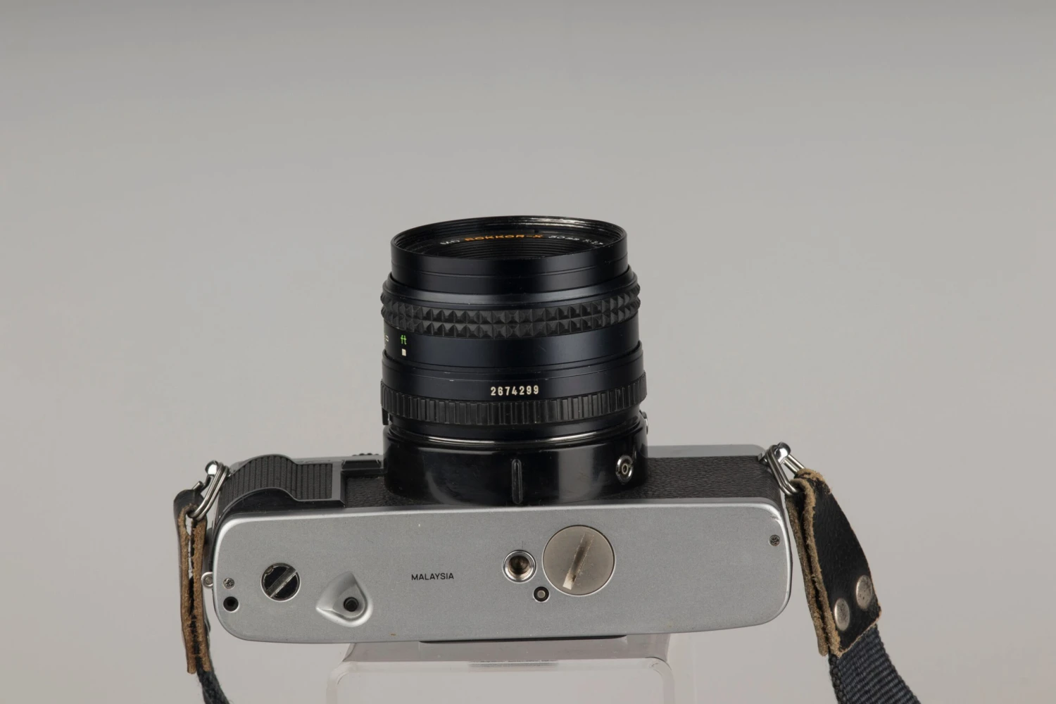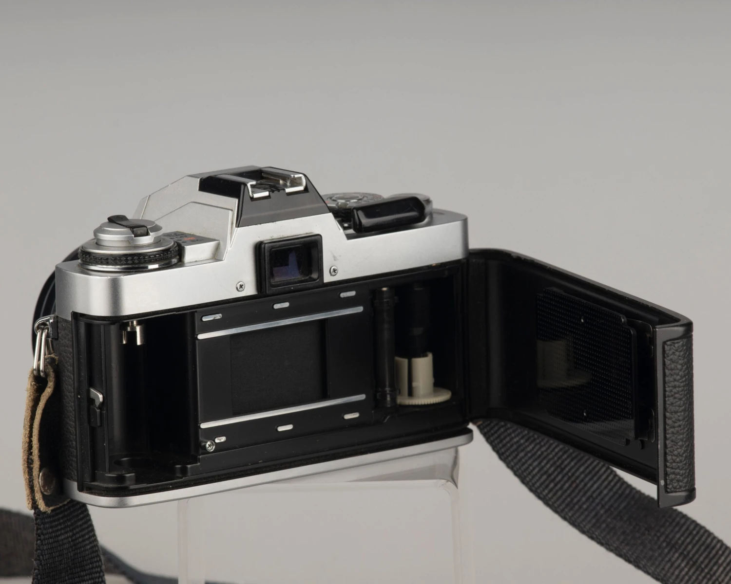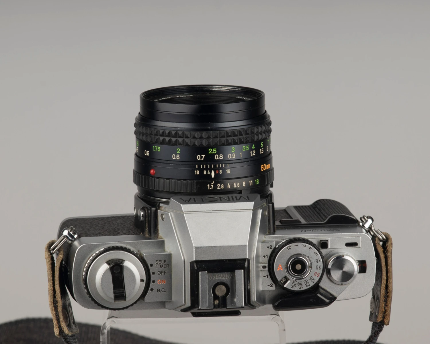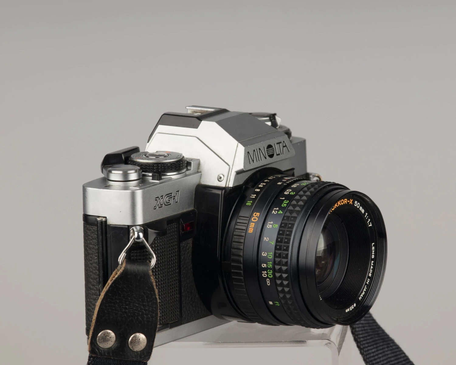 The Minolta XG-1n is a manual focus 35mm SLR from the 1980s that features aperture-priority auto exposure. This camera includes a sharp and fast Minolta Rokkor X 50mm f1.7 lens.