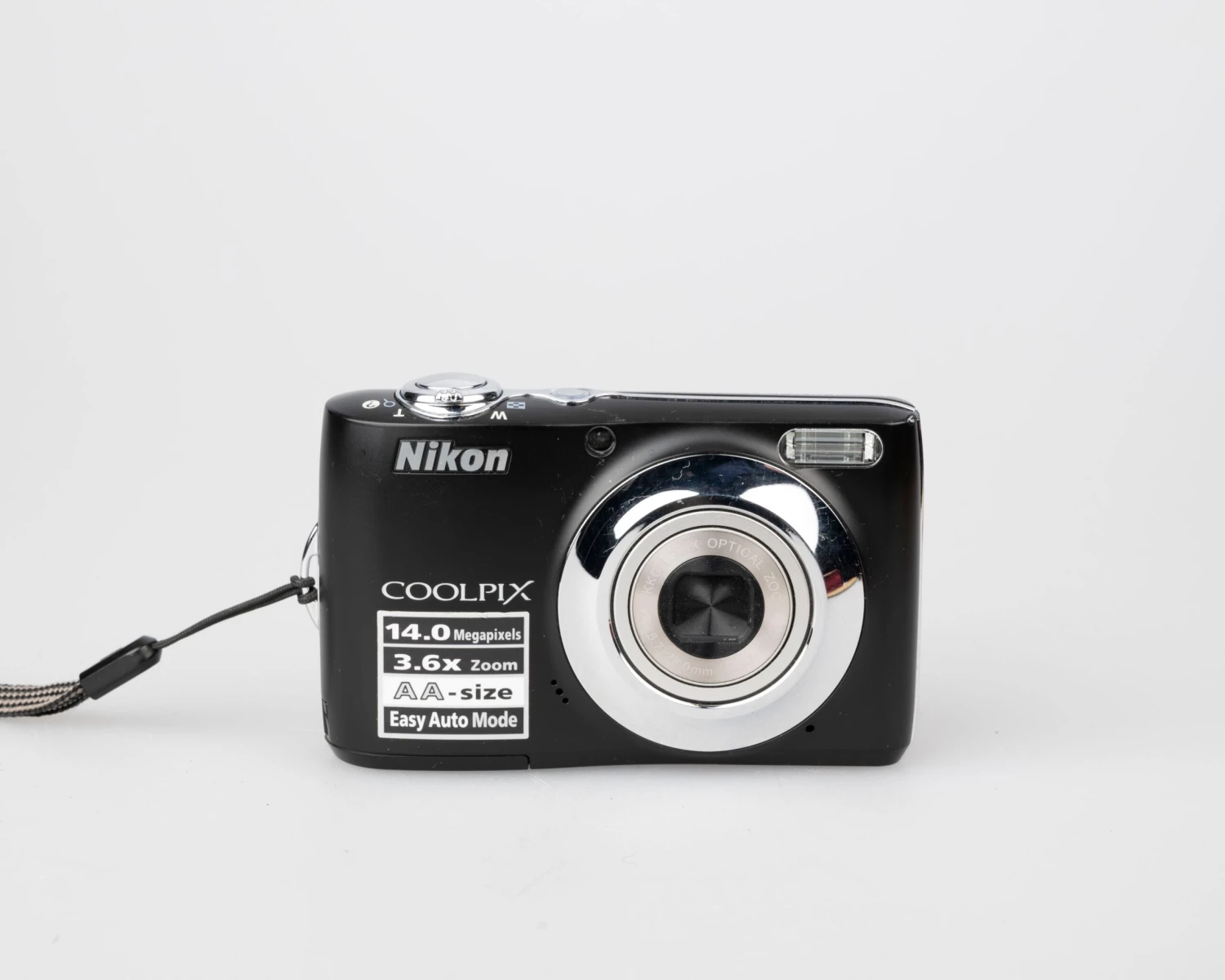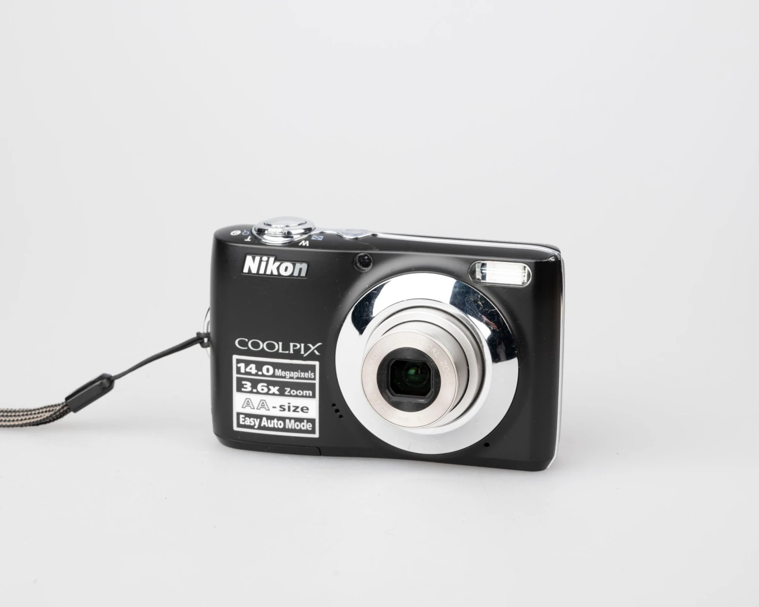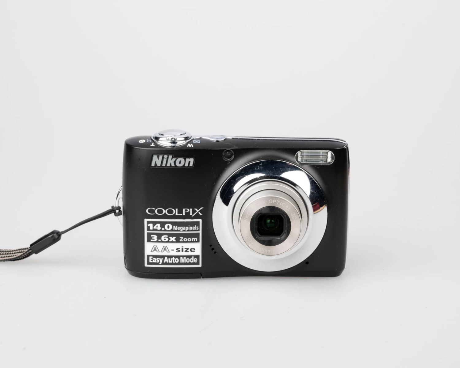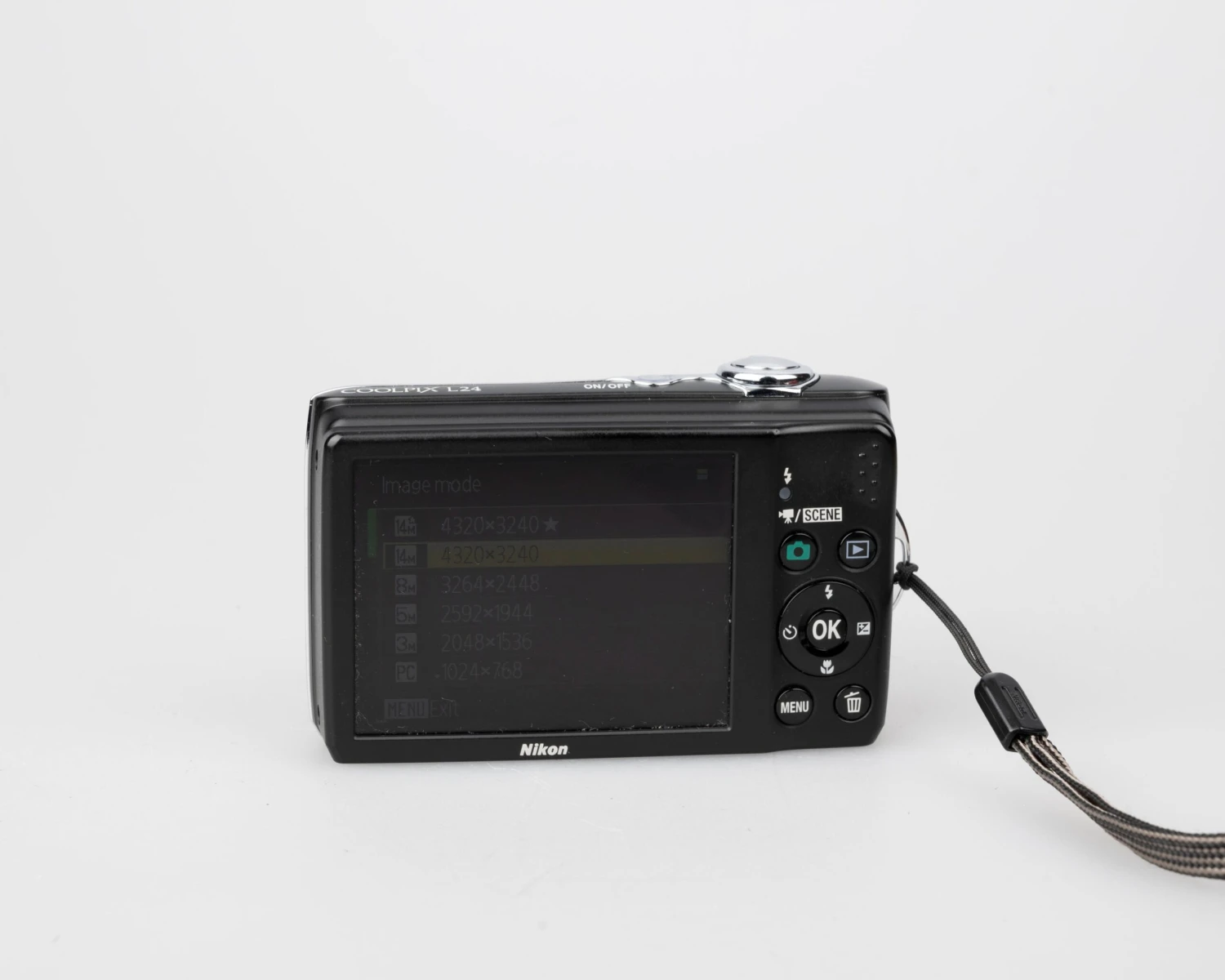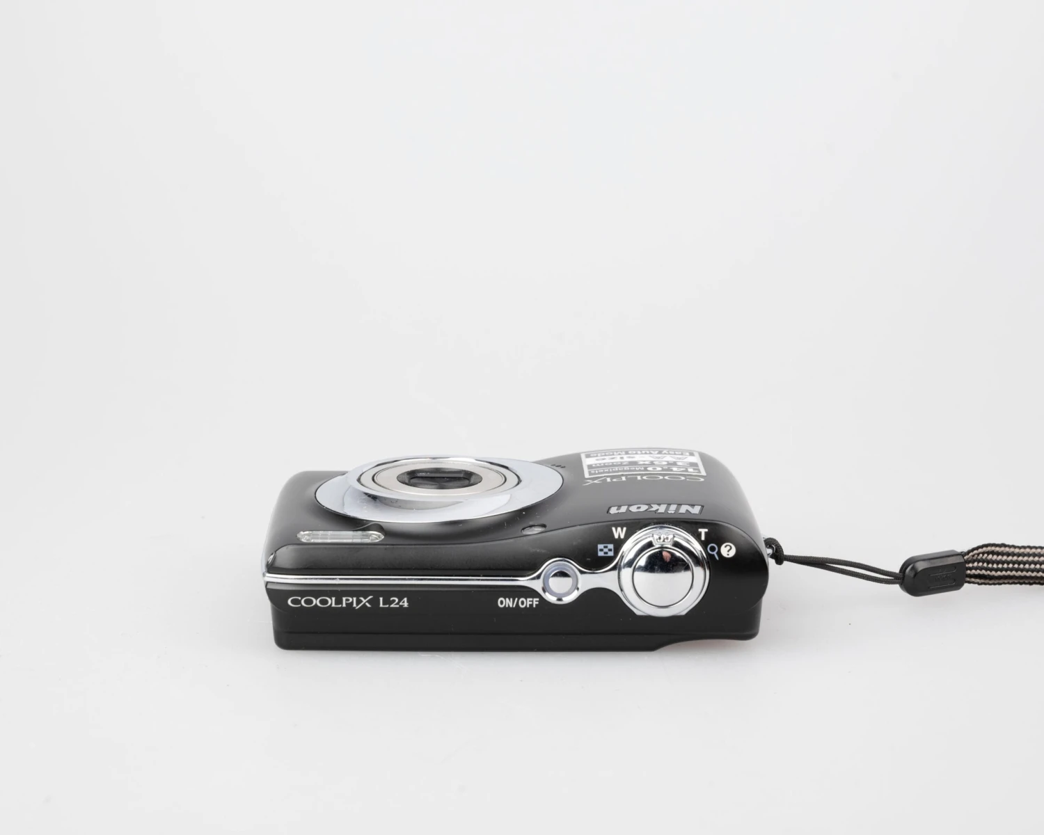 The Nikon Coolpix L24 is a compact digicam from 2011. This camera features a 14-megapixel CCD sensor and uses two AA batteries (not included) and common SD cards for memory (also not included). A red Optex case is included.