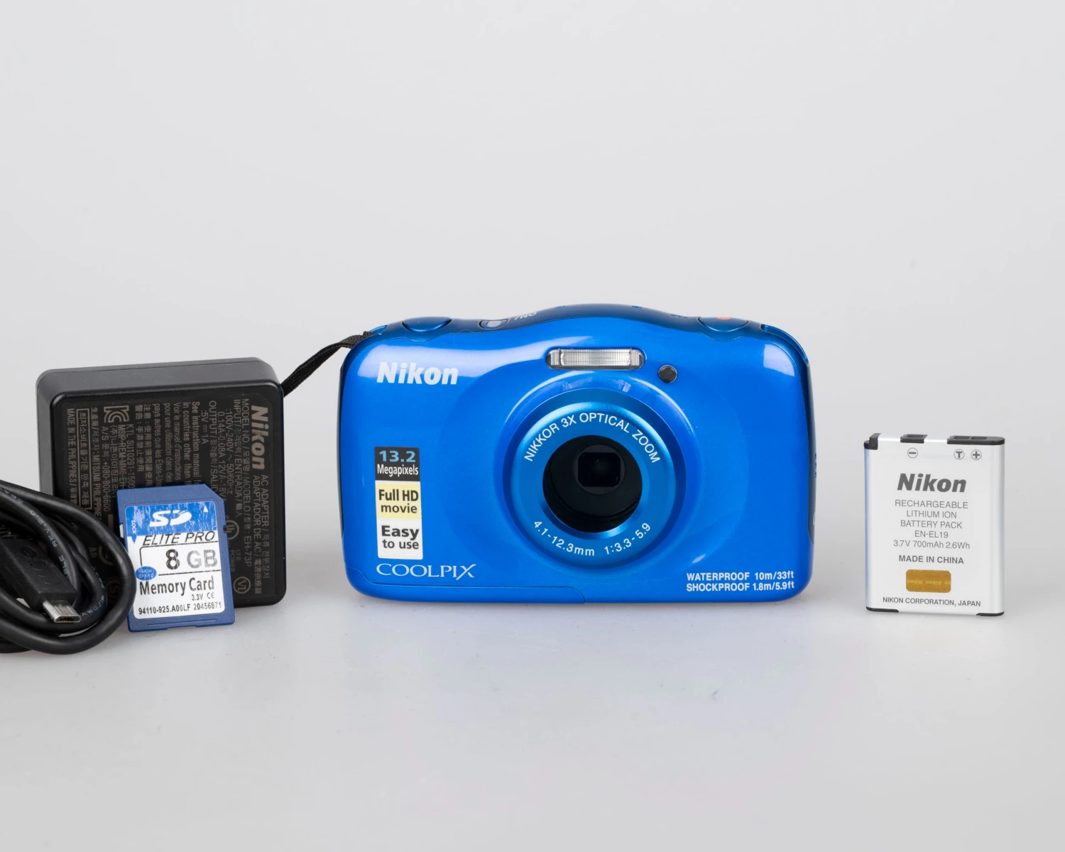 The Nikon Coolpix W100 is a rugged, water-resistant digital camera from 2016 featuring a 13.2-megapixel sensor and 4.1-12.3mm zoom lens.