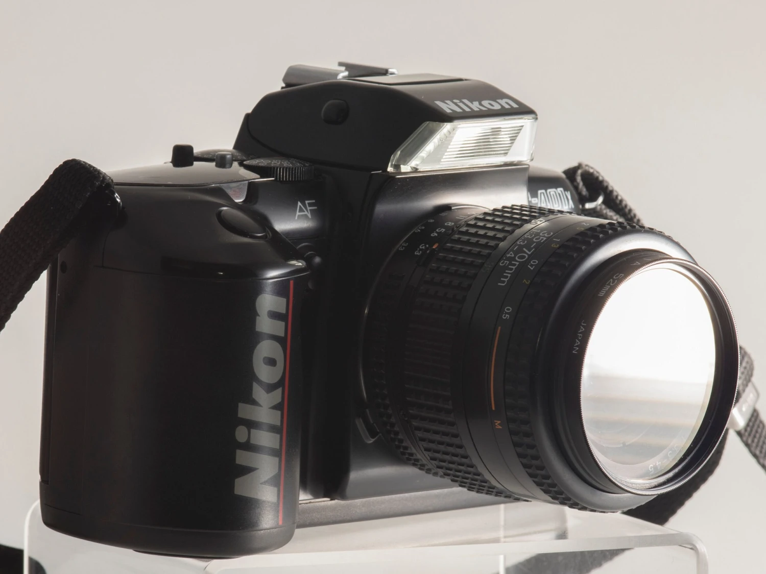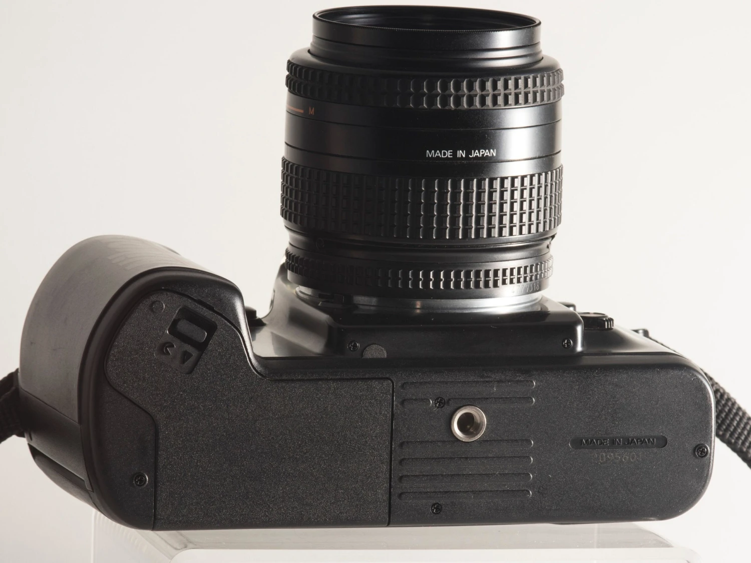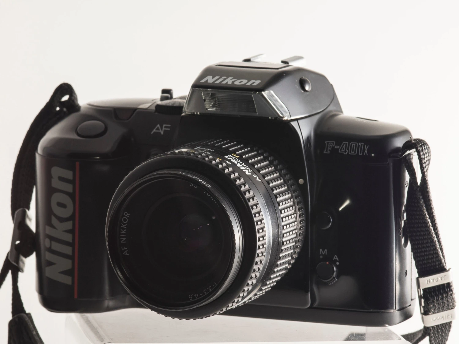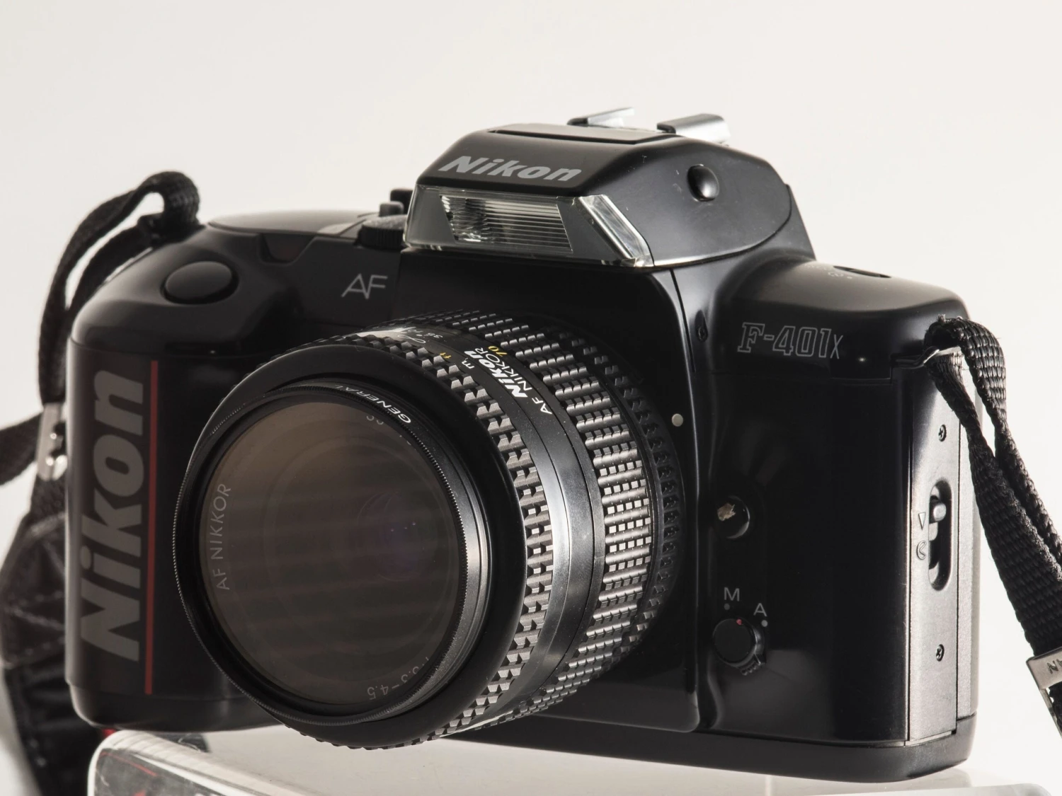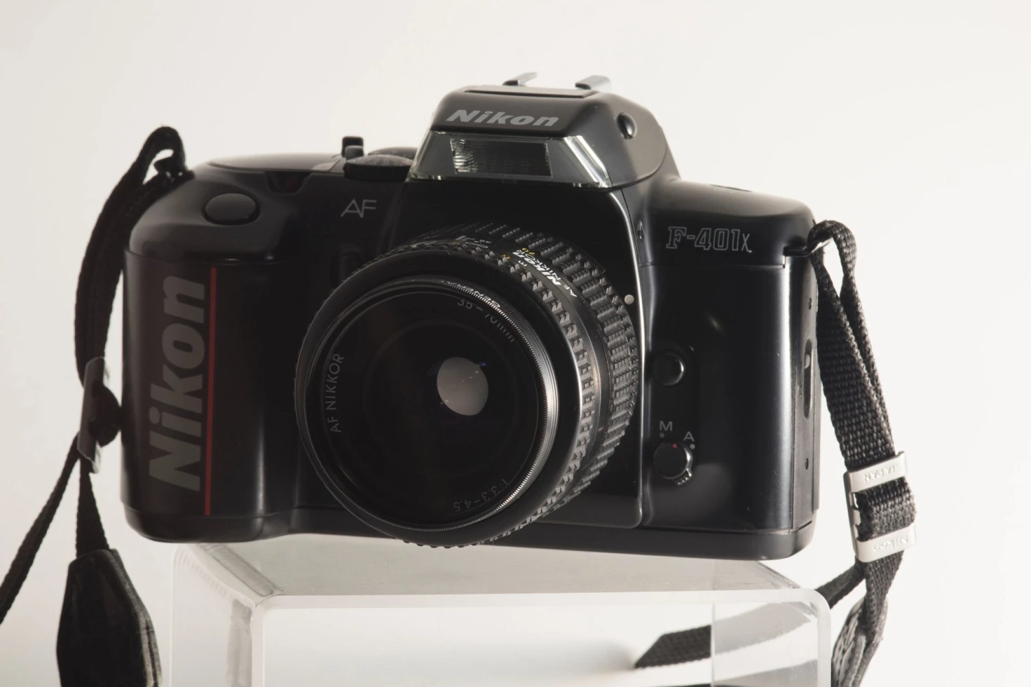 This Nikon F401X is an advanced but easy-to-use 35mm film SLR offering autofocus, auto-exposure (program, aperture-priority, or shutter-priority), Nikon’s famed matrix metering, and a built-in flash with TTL exposure. The included lens is the versatile AF Nikkor 35-70mm f3.3-4.5. This lens can also be used on modern Nikon digital SLRs. The camera uses 4 ordinary AA batteries for power (not included).