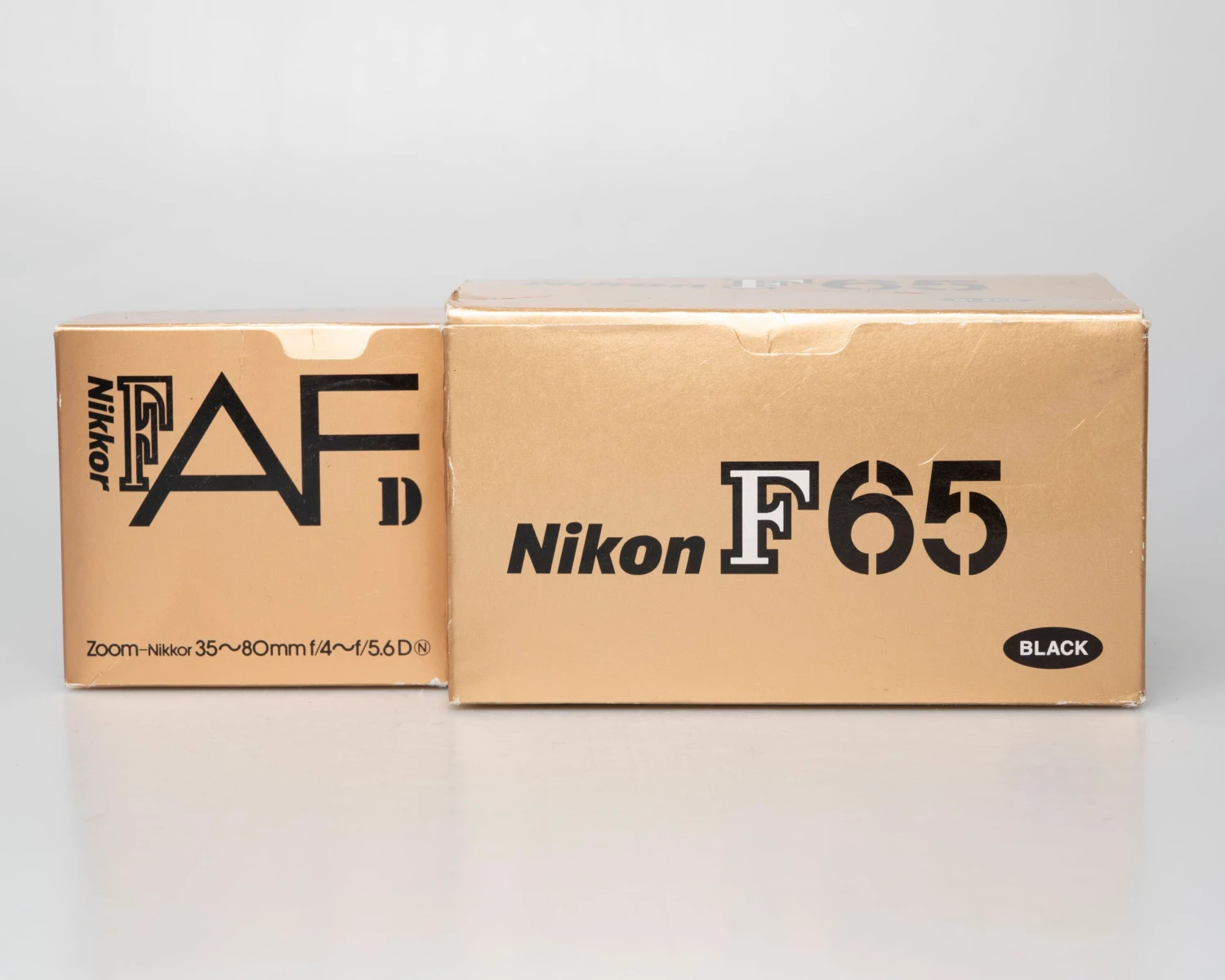The camera and lens are in very good cosmetic condition (see photos) and are working perfectly. We tested the camera’s shutter speeds, light meter, and autoexposure modes; everything is working with very good accuracy. The original boxes are included. The original English manual is also included (it’s labelled N65 which is the model designation used in some countries).