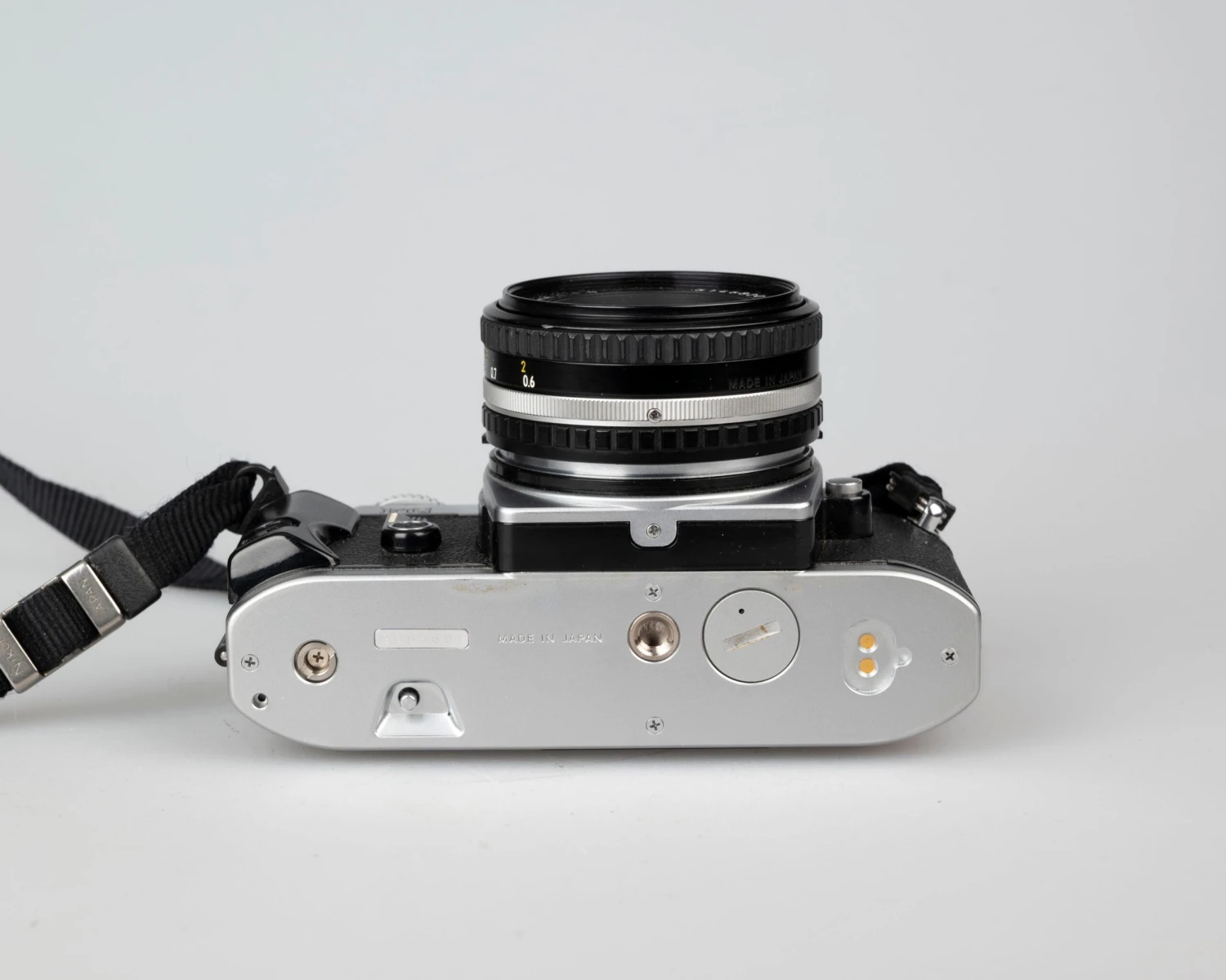 The camera and included lens were tested with film and the roll turned out great, all frames were sharp and exposed correctly. All shutter speeds were verified to have good accuracy and even curtain travel time with a shutter speed analyzer. The camera and lens are in very good cosmetic condition (see photos). The included Nikon ‘ever-ready’ case is only in fair condition, showing considerable wear.