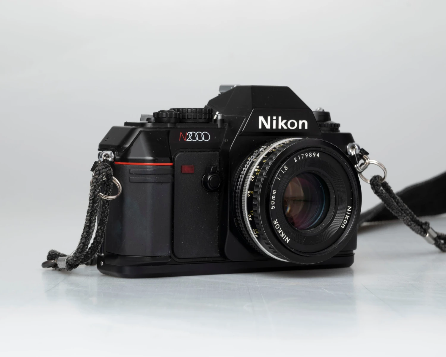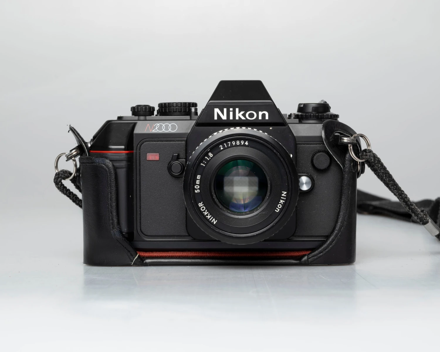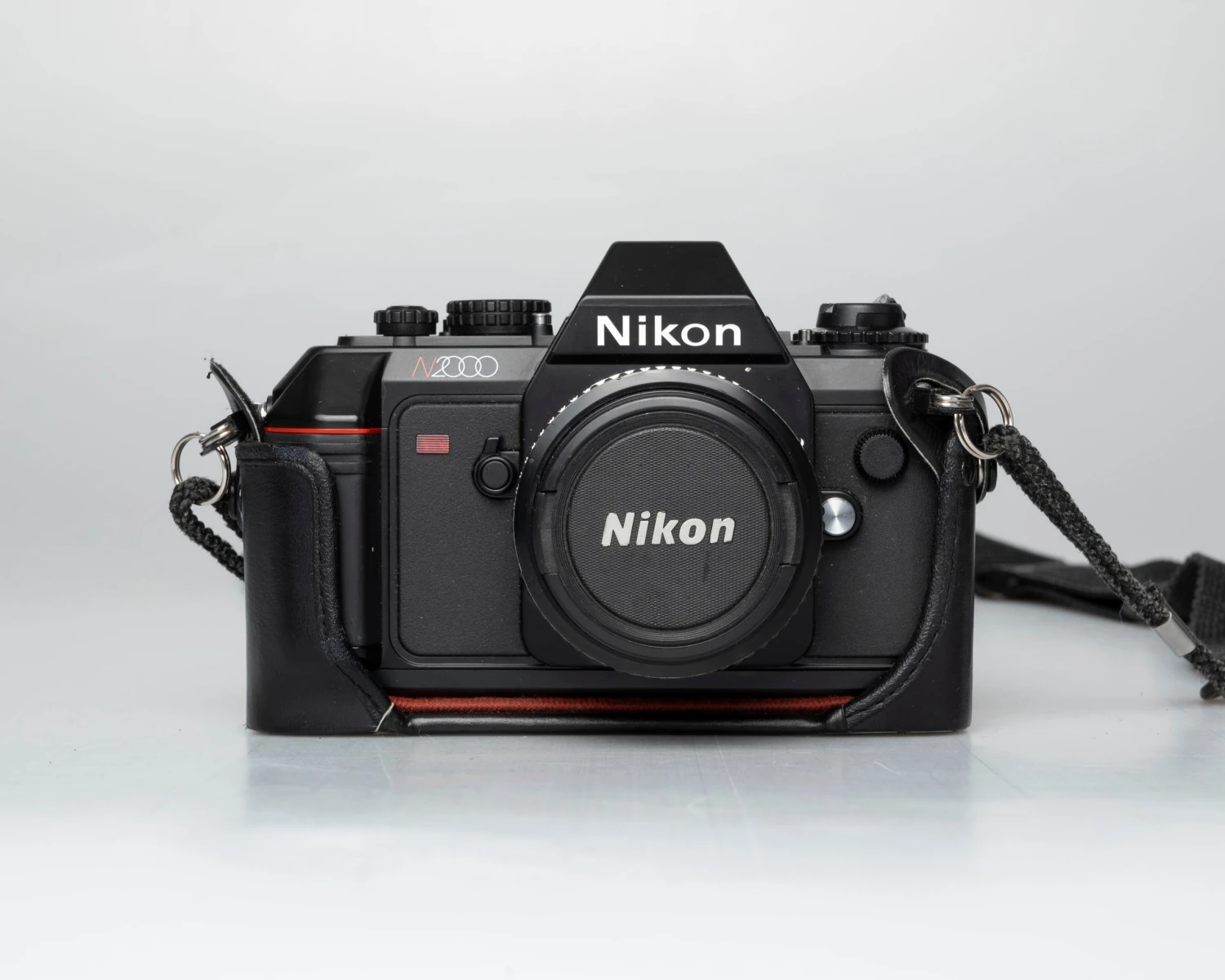 The circa-1985 Nikon N2000 (called the F301 in some markets) is an advanced SLR with a built in motor drive. The included lens is a sharp AI Nikkor 50mm f1.8. A genuine Nikon ‘ever-ready’ case is also included.