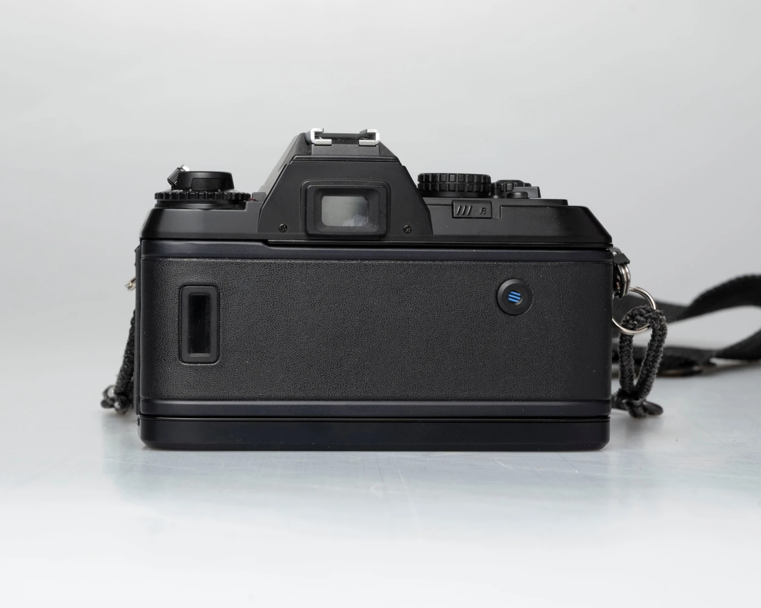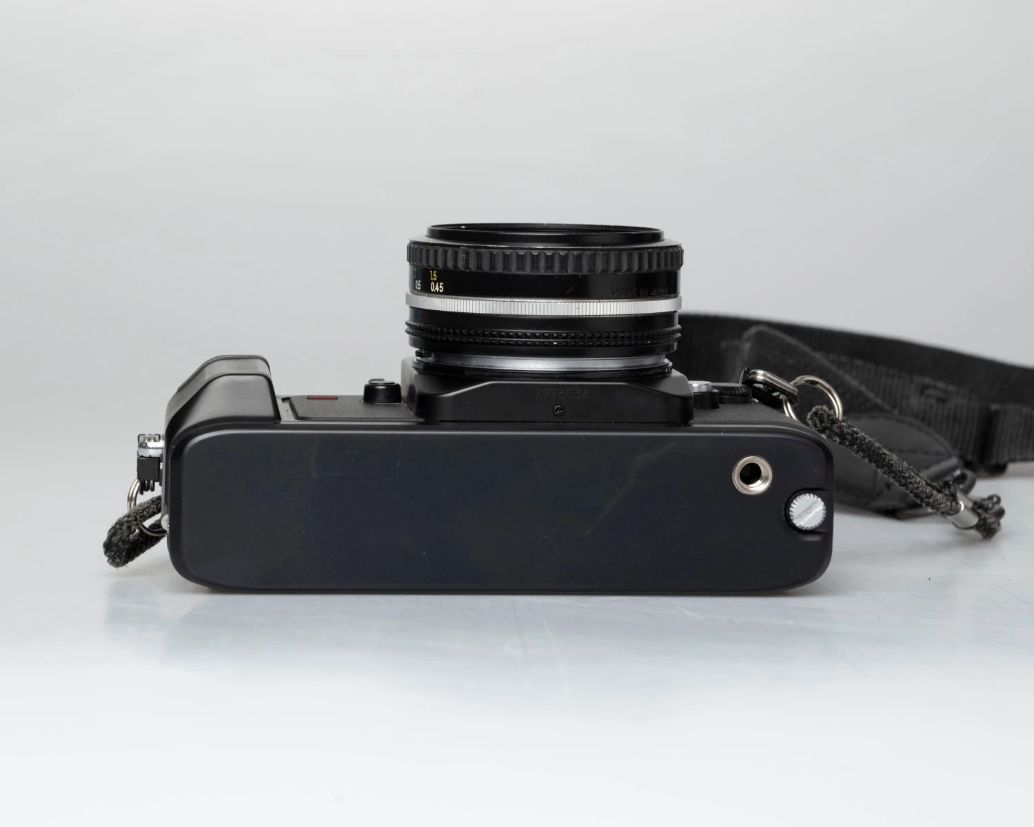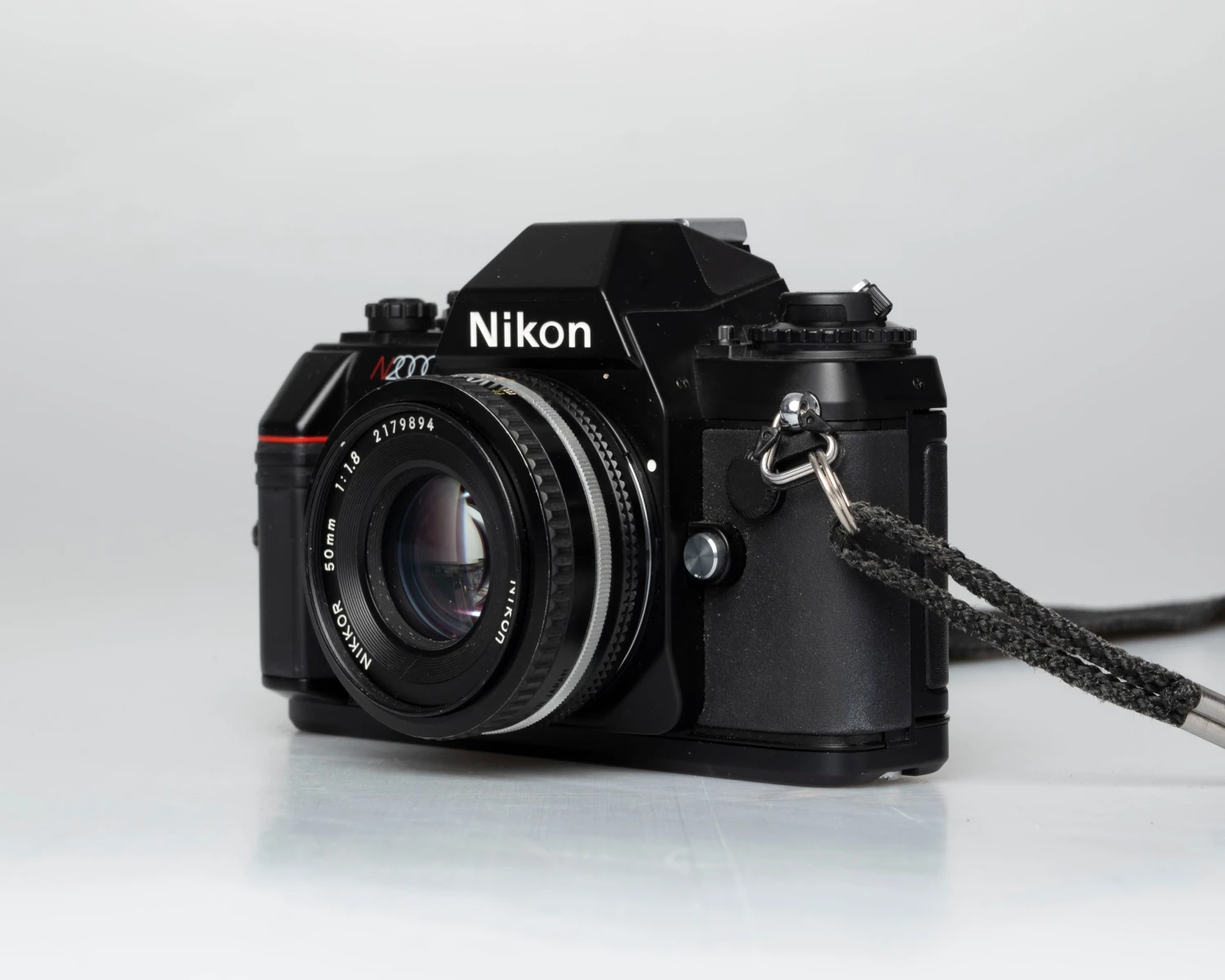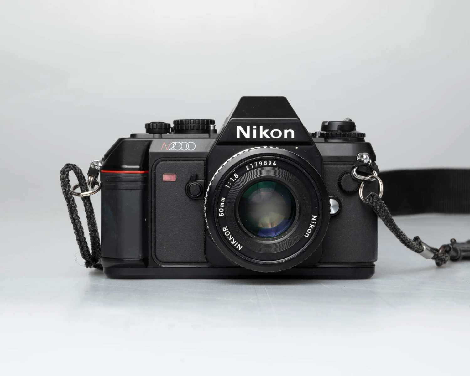 The circa-1985 Nikon N2000 (called the F301 in some markets) is an advanced SLR with a built in motor drive. The included lens is a sharp AI Nikkor 50mm f1.8. A genuine Nikon ‘ever-ready’ case is also included.