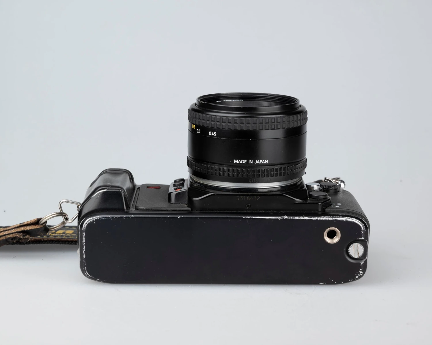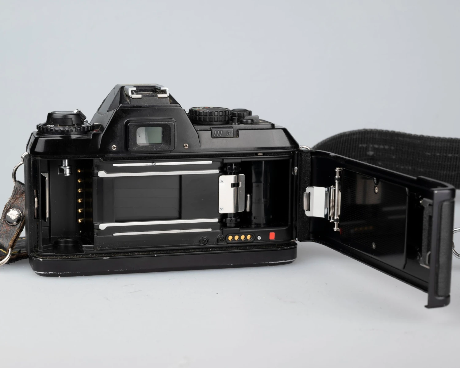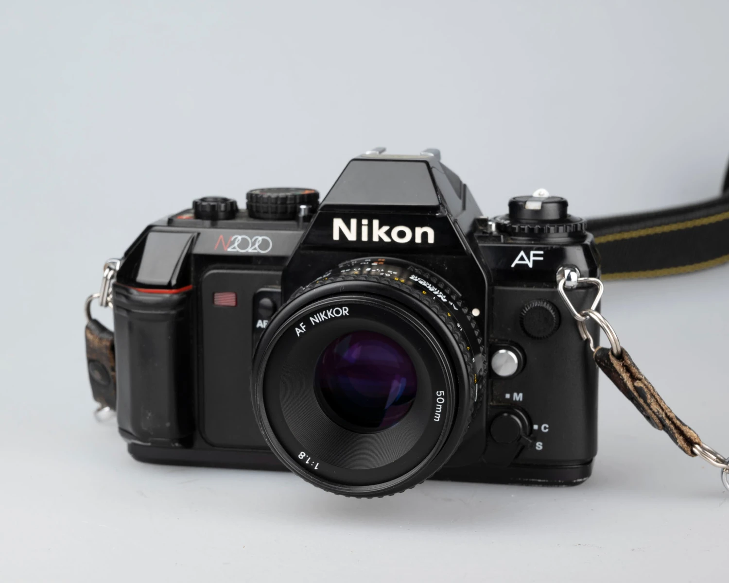 The Nikon N2020 (called the F501 in some countries) from 1986 was the company’s first successful autofocus 35mm SLR. The included lens is a fast, sharp AF Nikkor 50mm f1.8.