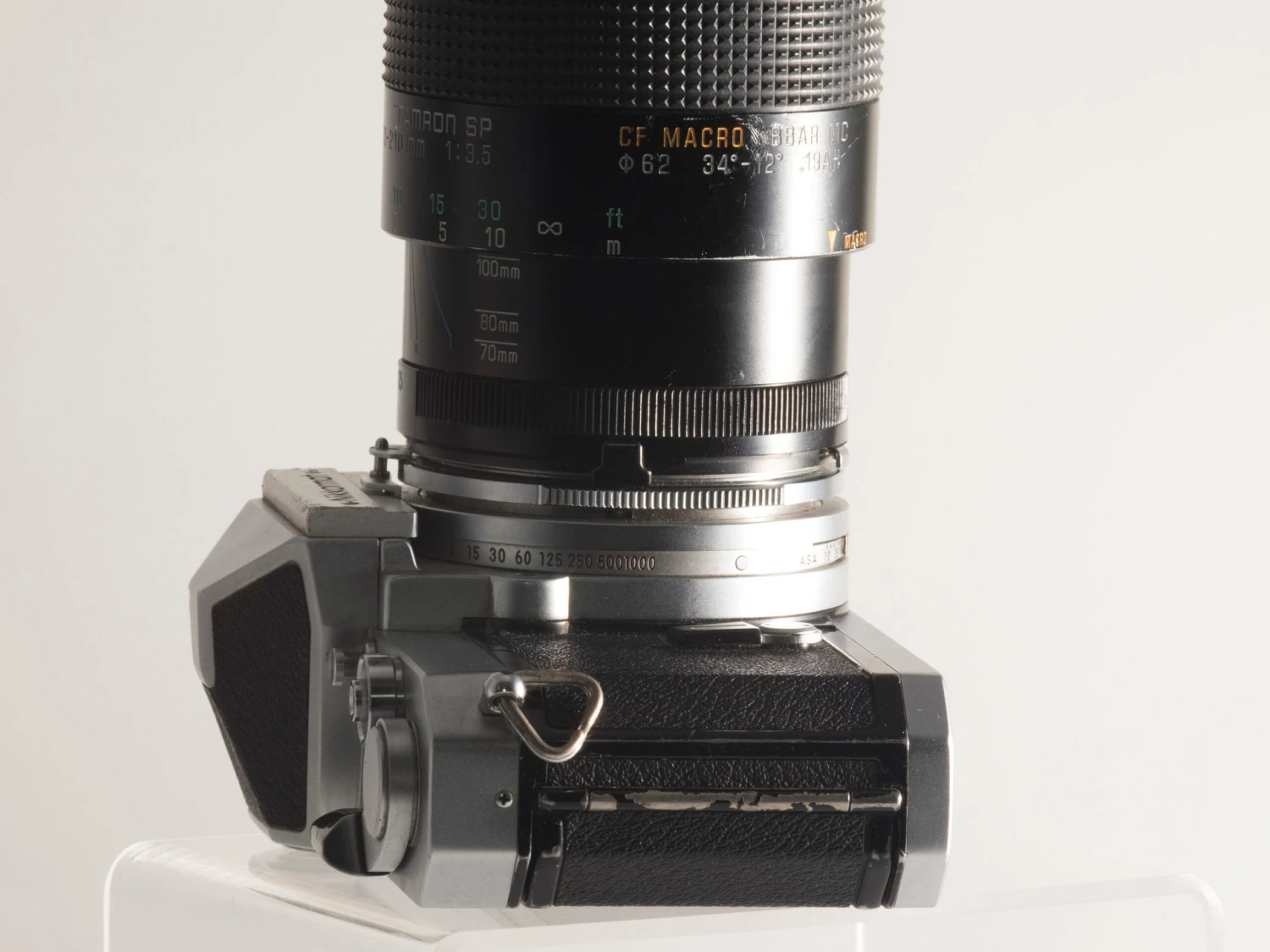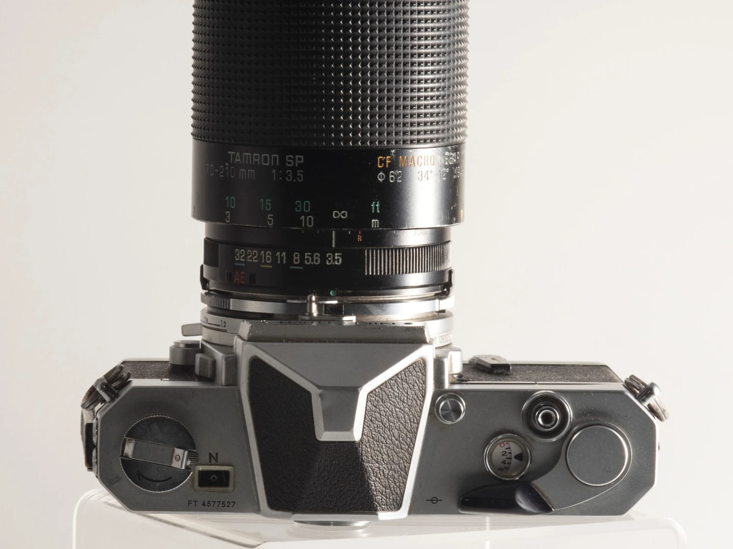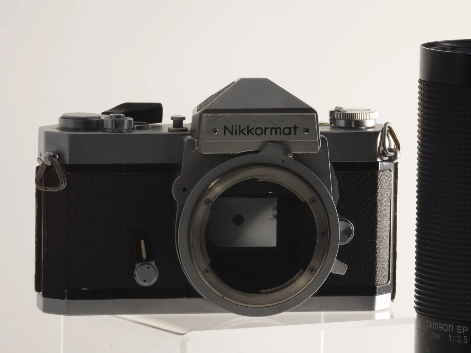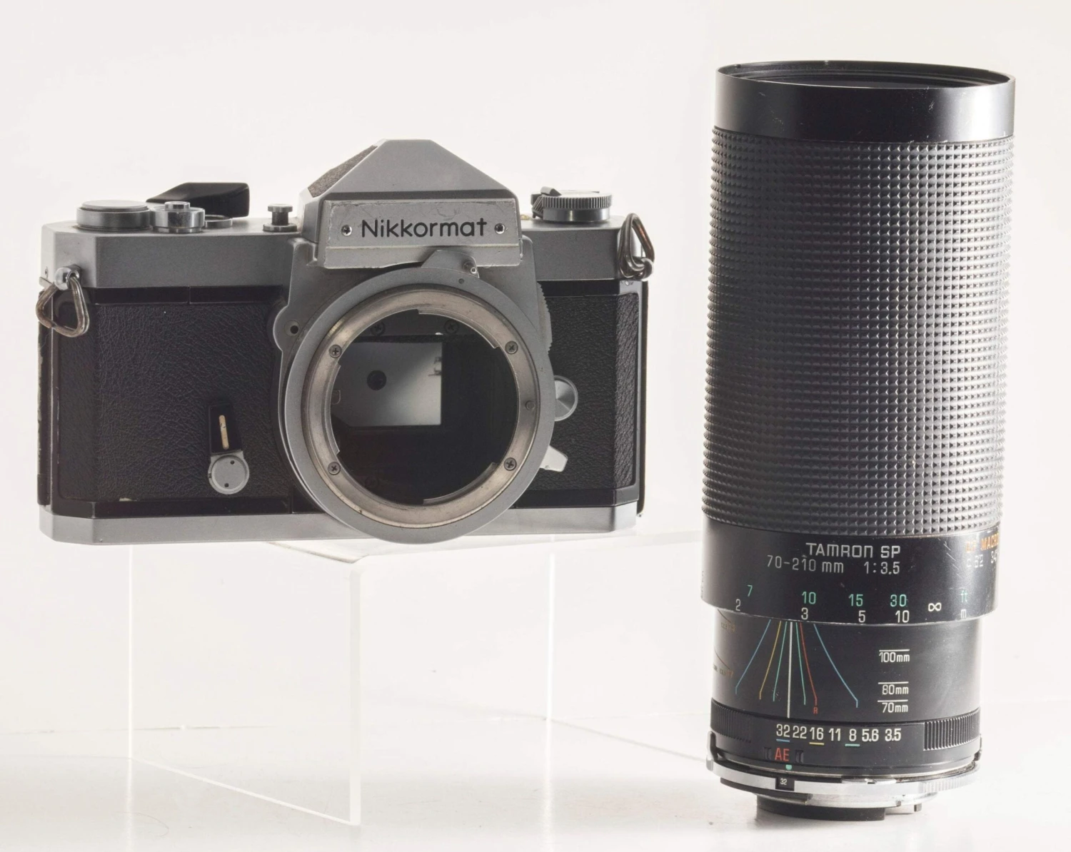 The Nikkormat FTn is a classic Nikon F-mount manual focus, mechanical 35mm film SLR from the 1970s and the included lens is a Tamron SP 70-210mm f3.5 lens. This is a very versatile and reliable camera and lens combination. The FTn is a very elegant design with a number of features to appeal to advanced users like: a depth of field preview summary beside the shutter release; a mirror lockup switch; light meter readable both through the viewfinder and in a window on top of the camera.
