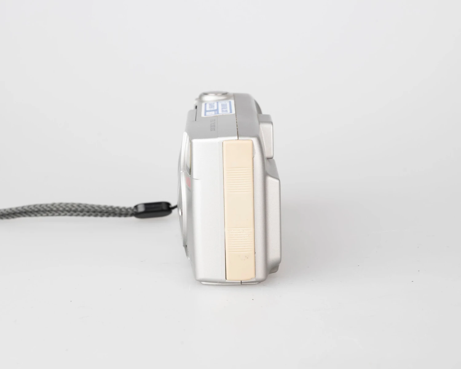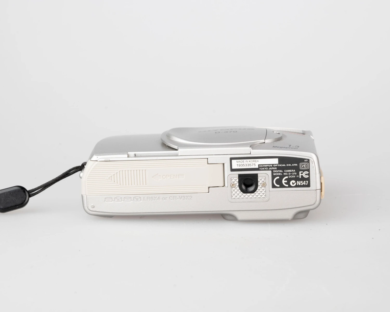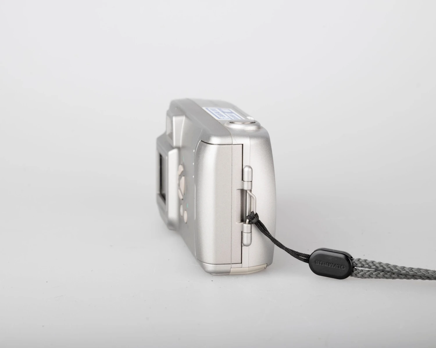 We tested this camera and it is working correctly. It is in very good cosmetic condition (see photos) except for the rubber cover for the USB connector which is quite dried out and will probably fall off eventually (see the side view photo, rubber port covers from this era were infamous for falling off even when new, it doesn’t affect the camera’s functionality).