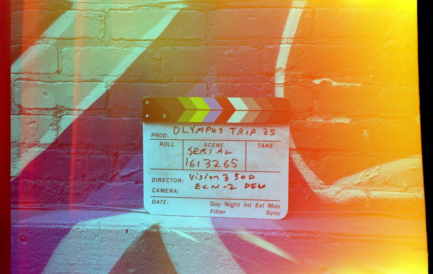 Note: the example photo of the clapperboard (giving the camera serial number and film type/developer used) shows an apparent light leak because we accidentally shot this on the leader (beginning of the roll, which is of course exposed to light during loading). This camera has fresh light seals and no light leaks.
