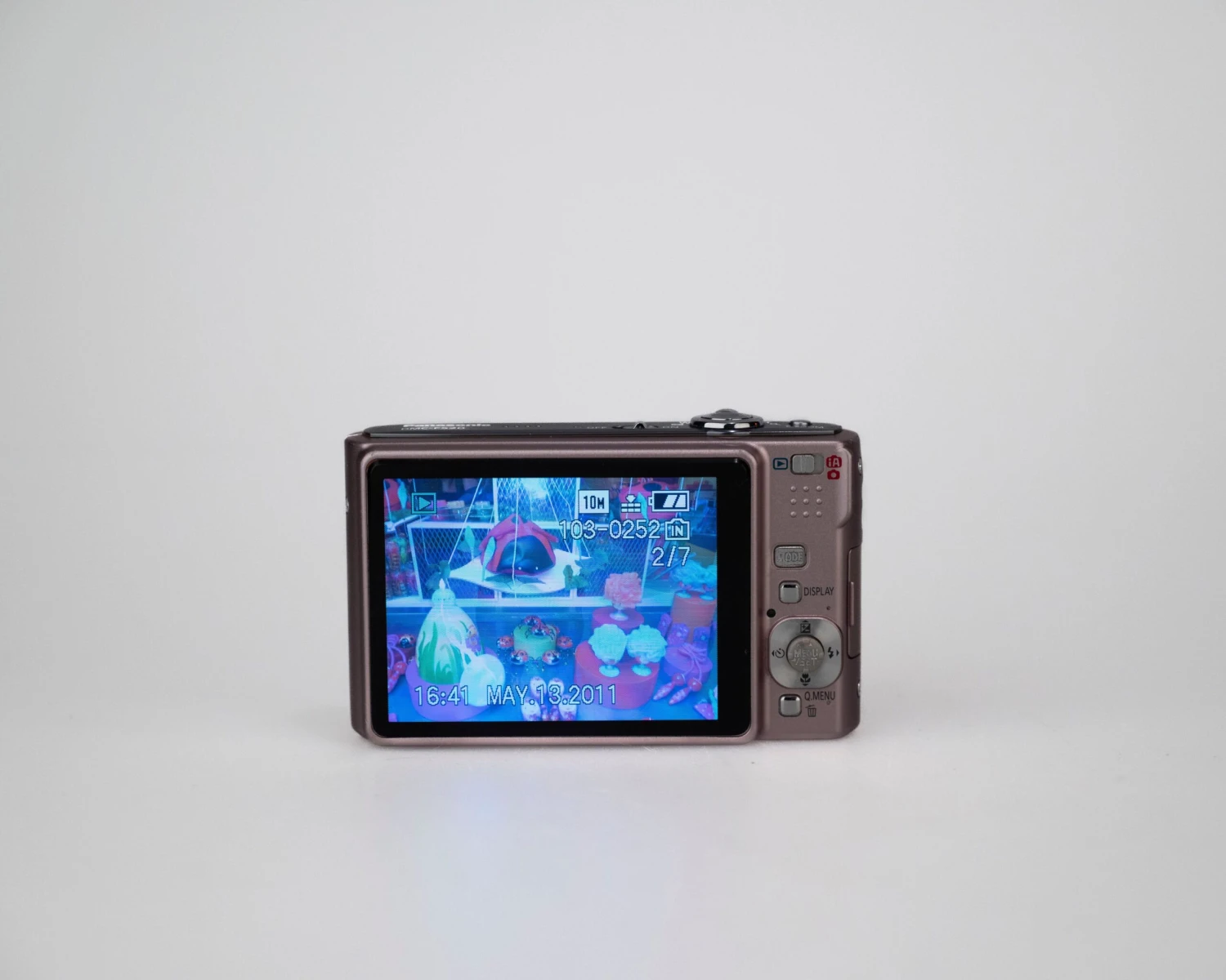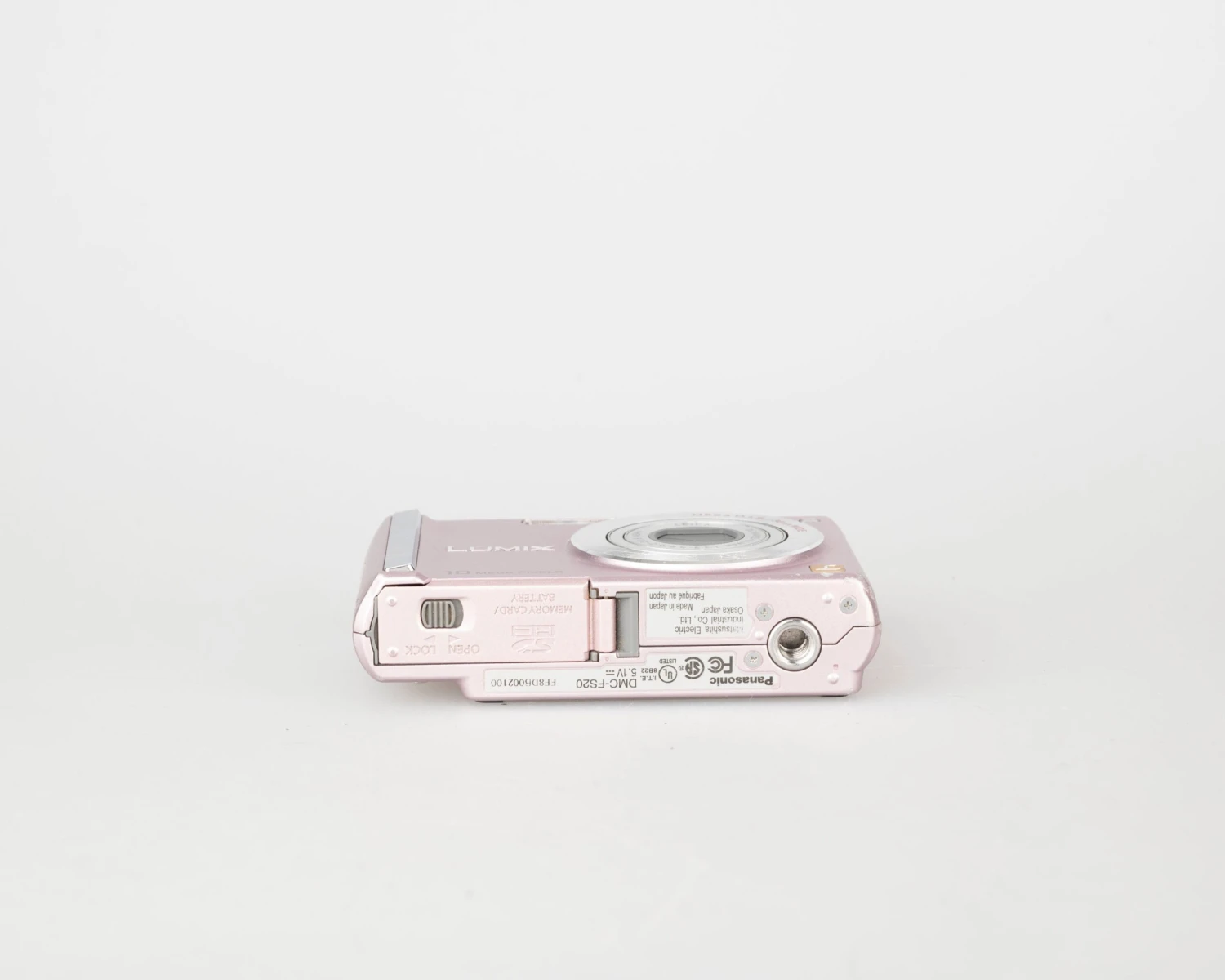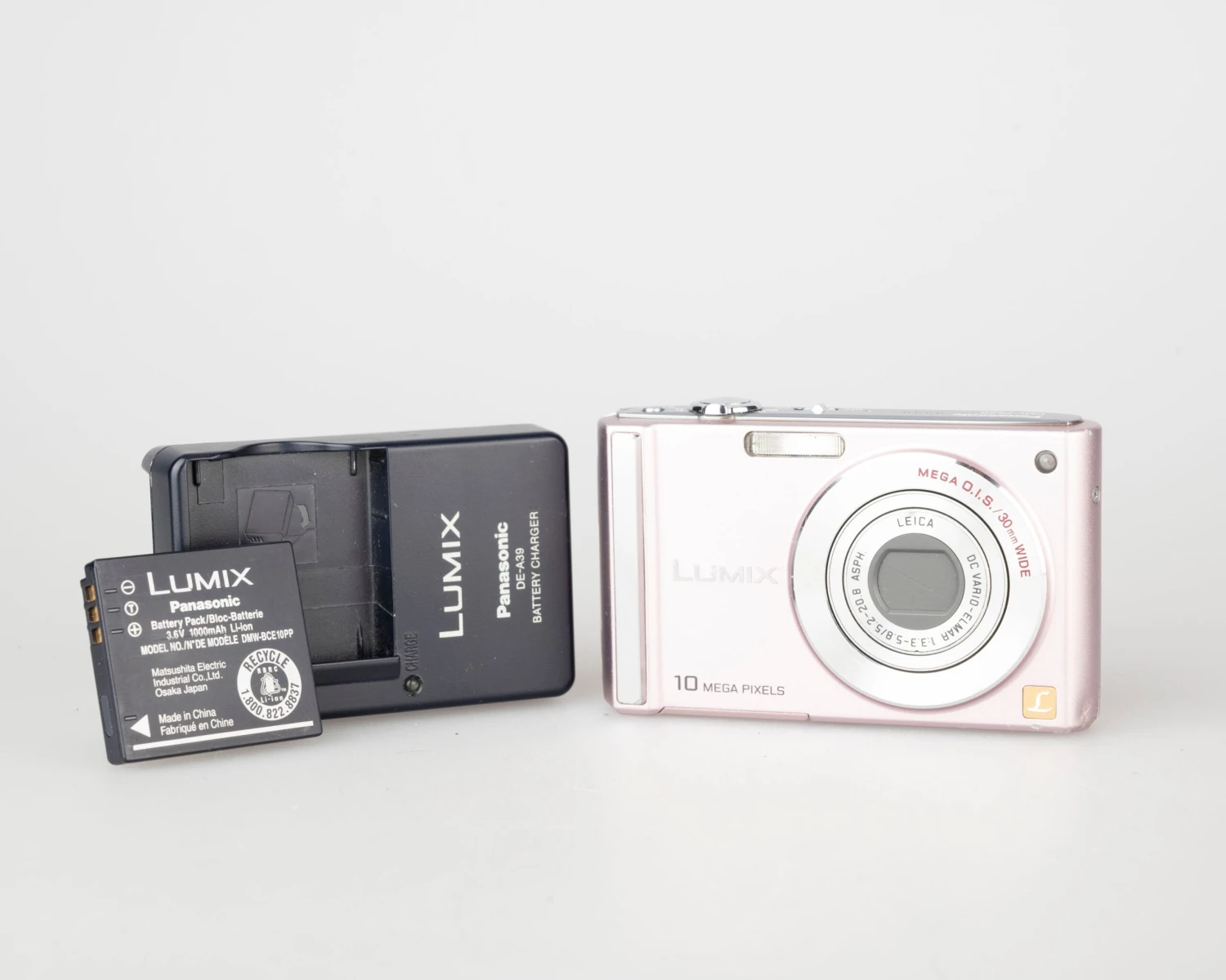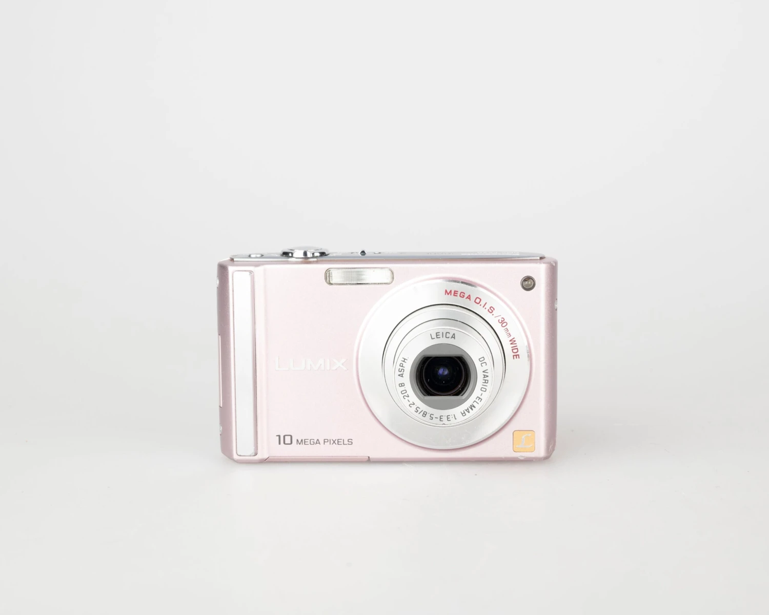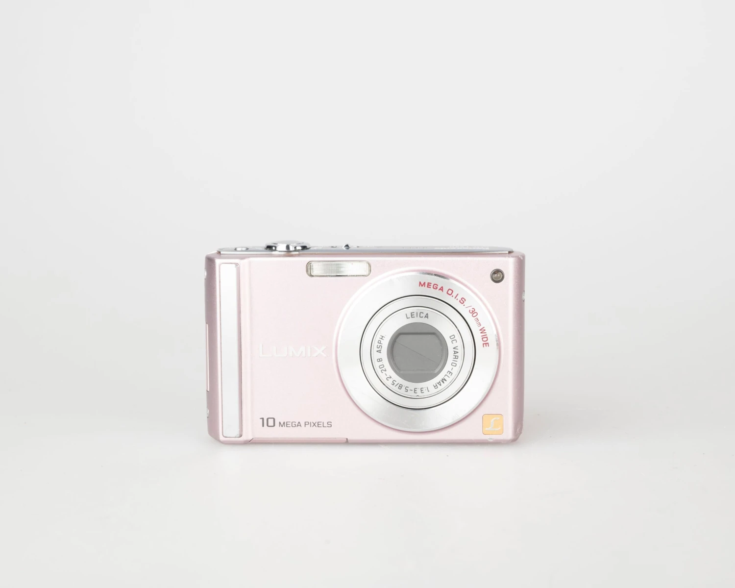 This circa-2008 Panasonic Lumix FS20 is an elegant pink metallic 10.1MP digicam built around a Leica DC Vario-Elmar 1:3.3 – 5.8 / 5.2 – 20.8 Asph lens. The camera features 50 MB of built-in memory and support for common SD cards (not included).