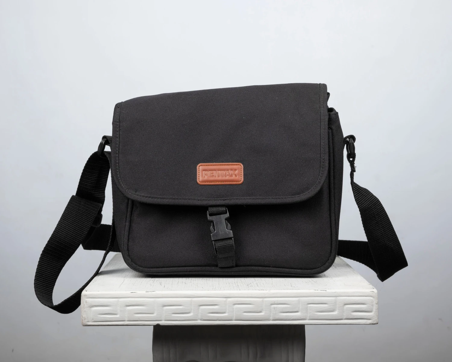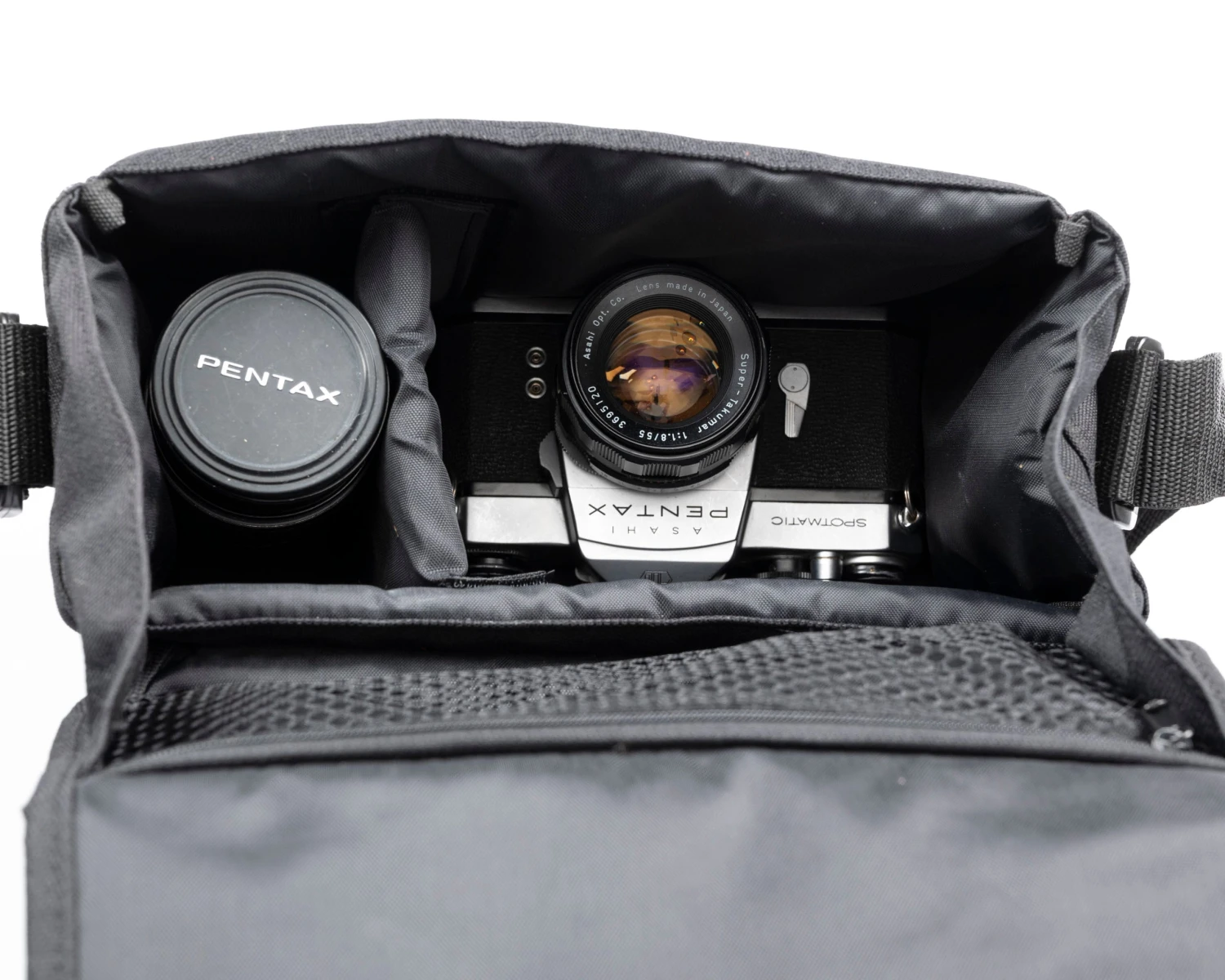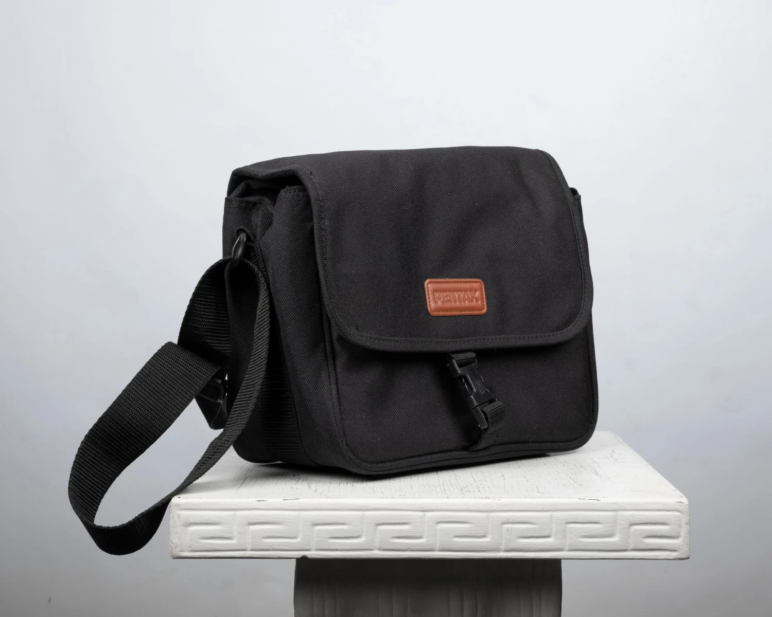 This mid-sized Pentax camera shoulder bag is a minimalist design. It features an adjustable main compartment, a front pocket with a velcro closure, and a mesh zippered ‘film compartment’ under its main flap.