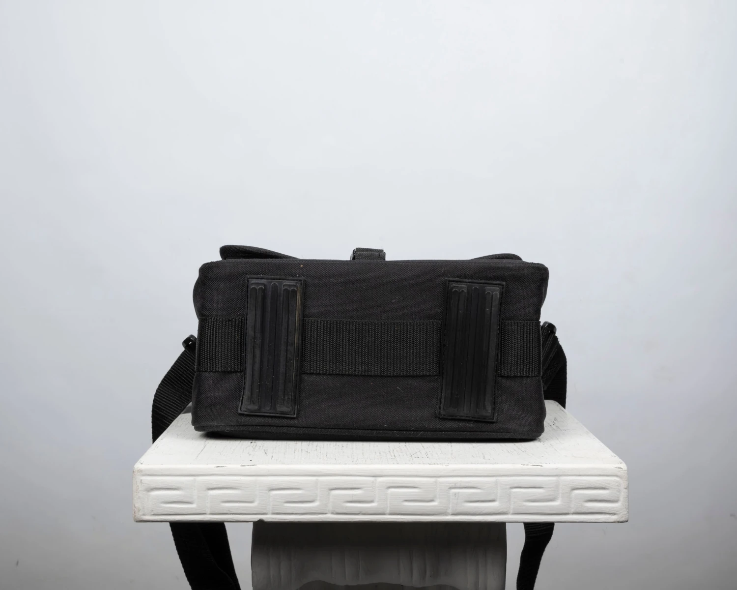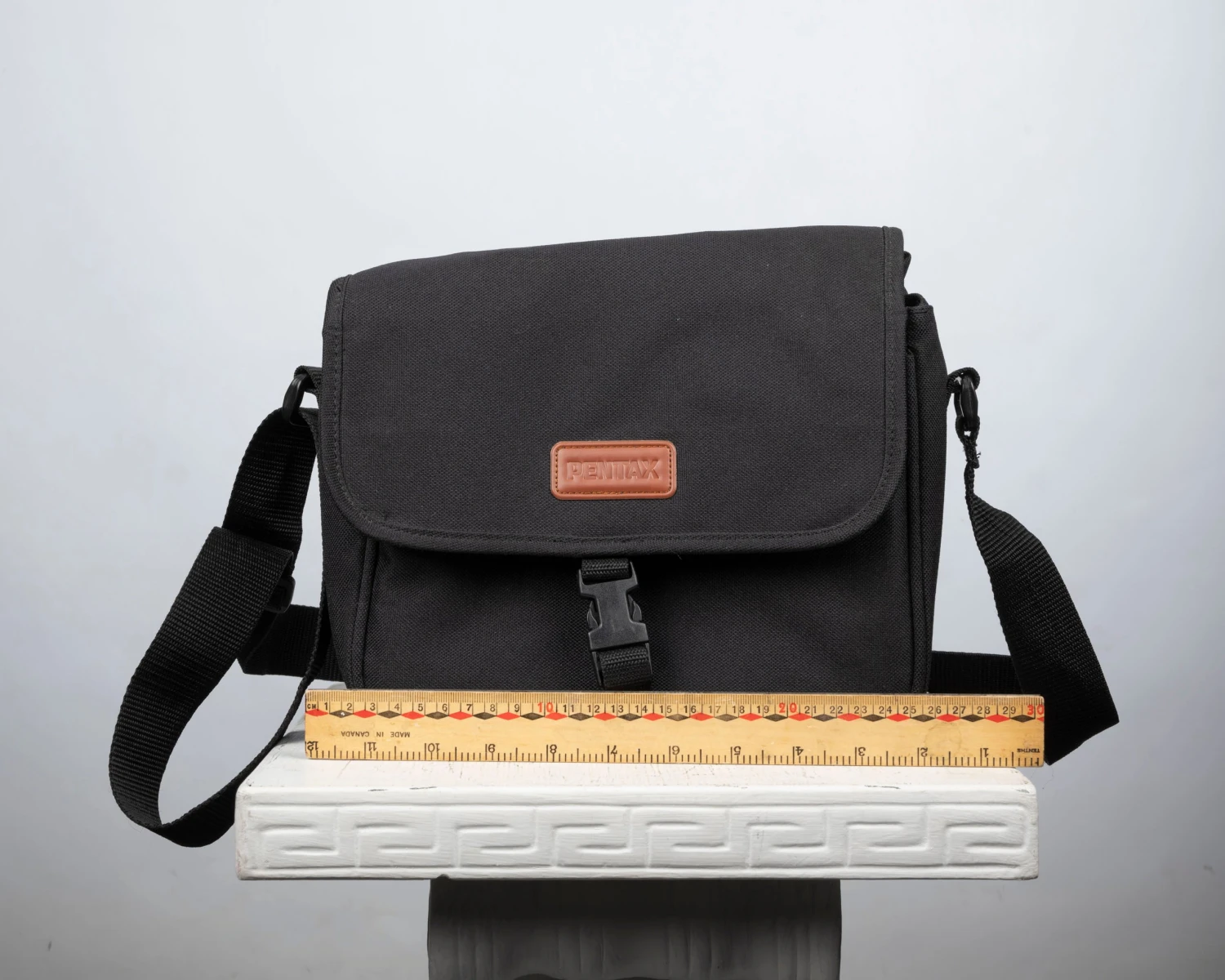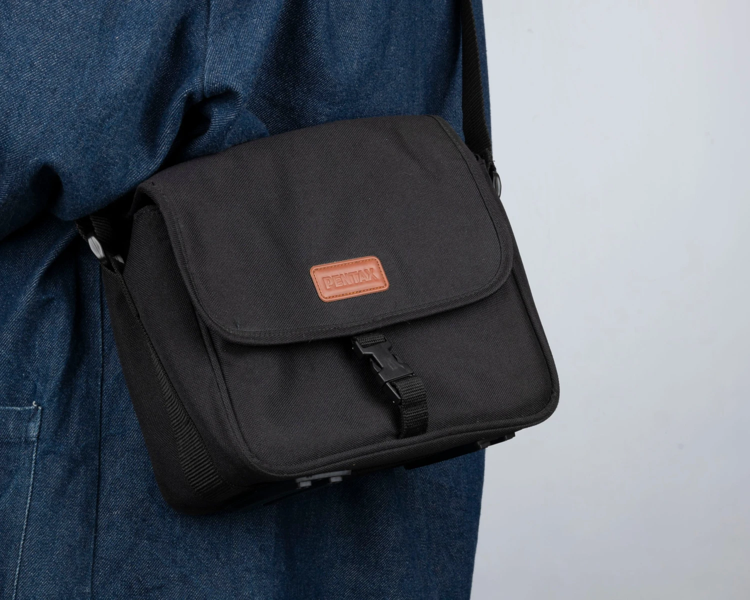 This mid-sized Pentax camera shoulder bag is a minimalist design. It features an adjustable main compartment, a front pocket with a velcro closure, and a mesh zippered ‘film compartment’ under its main flap.