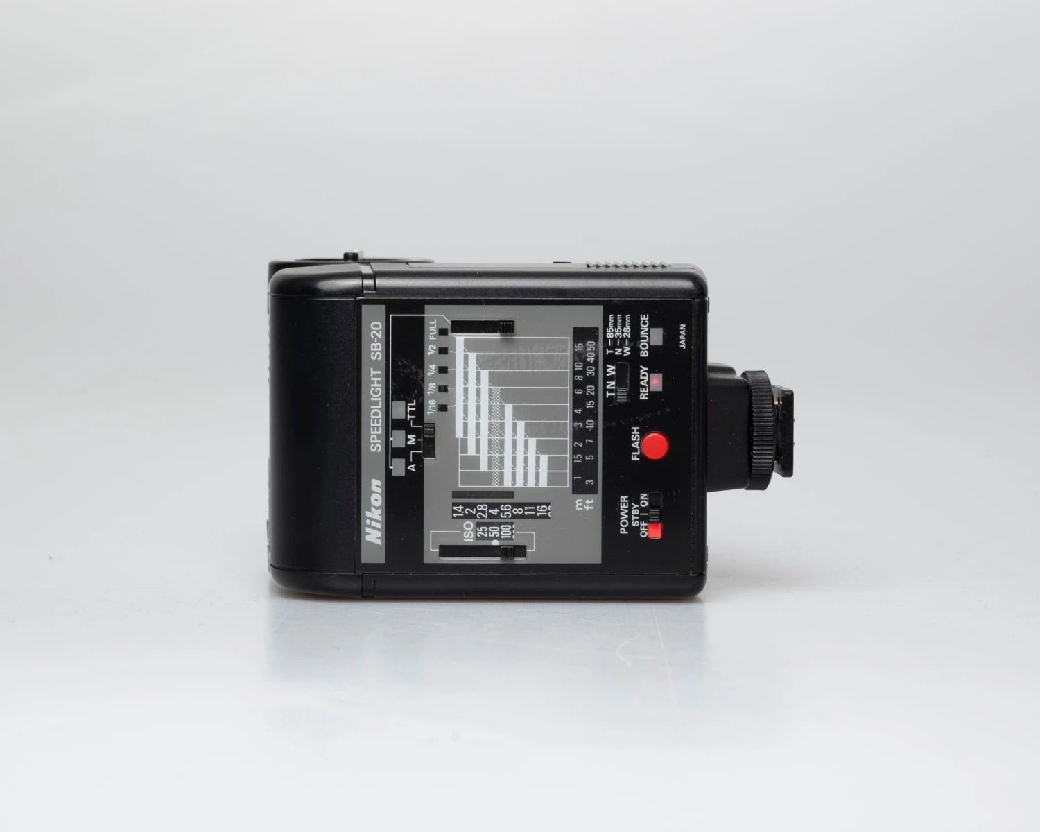 First released in 1986, the Nikon SB-20 Speedlight is a compact and versatile hot-shoe mount flash. It has a clever design with built-in wide and telephoto diffusion filters and bounce capability.