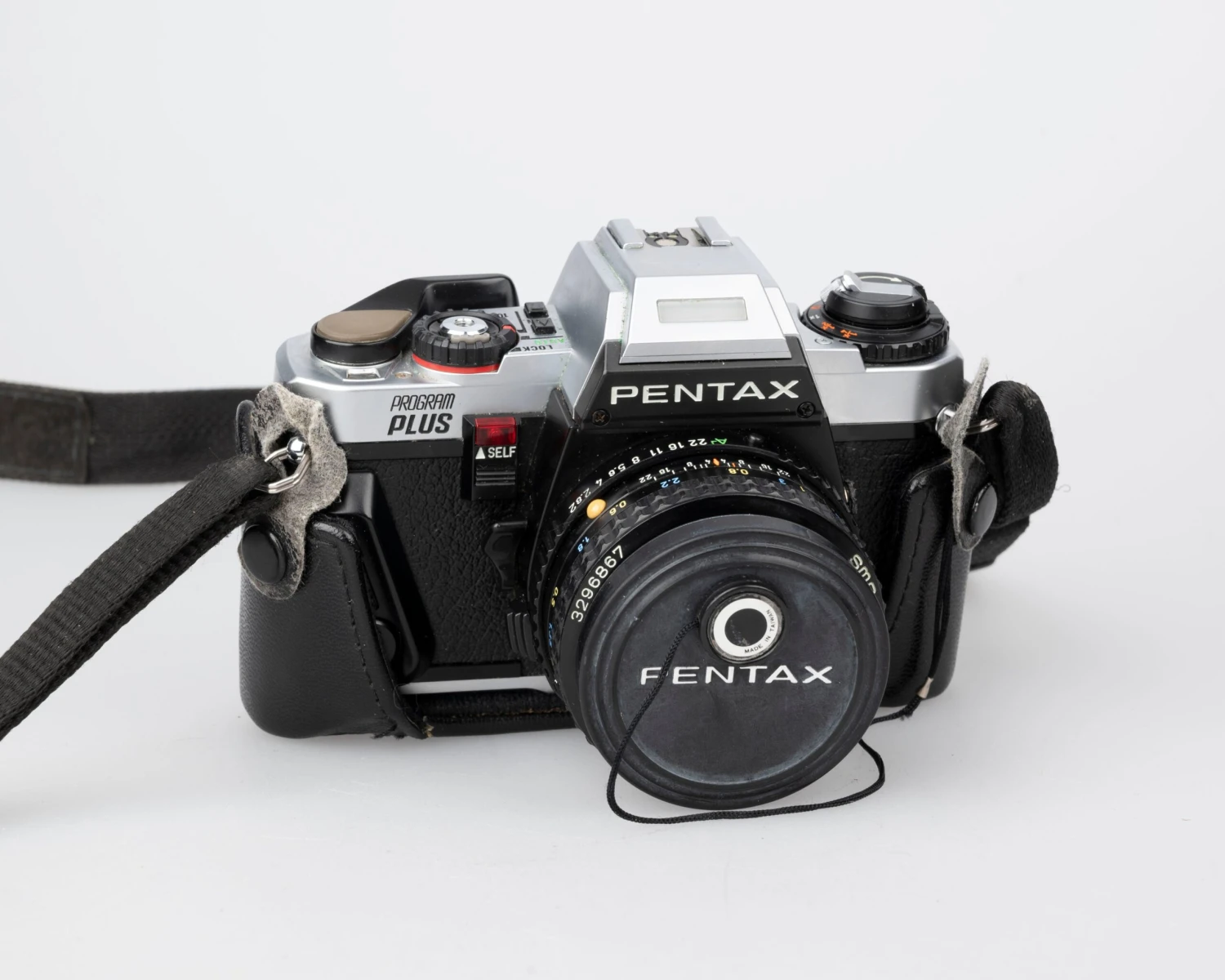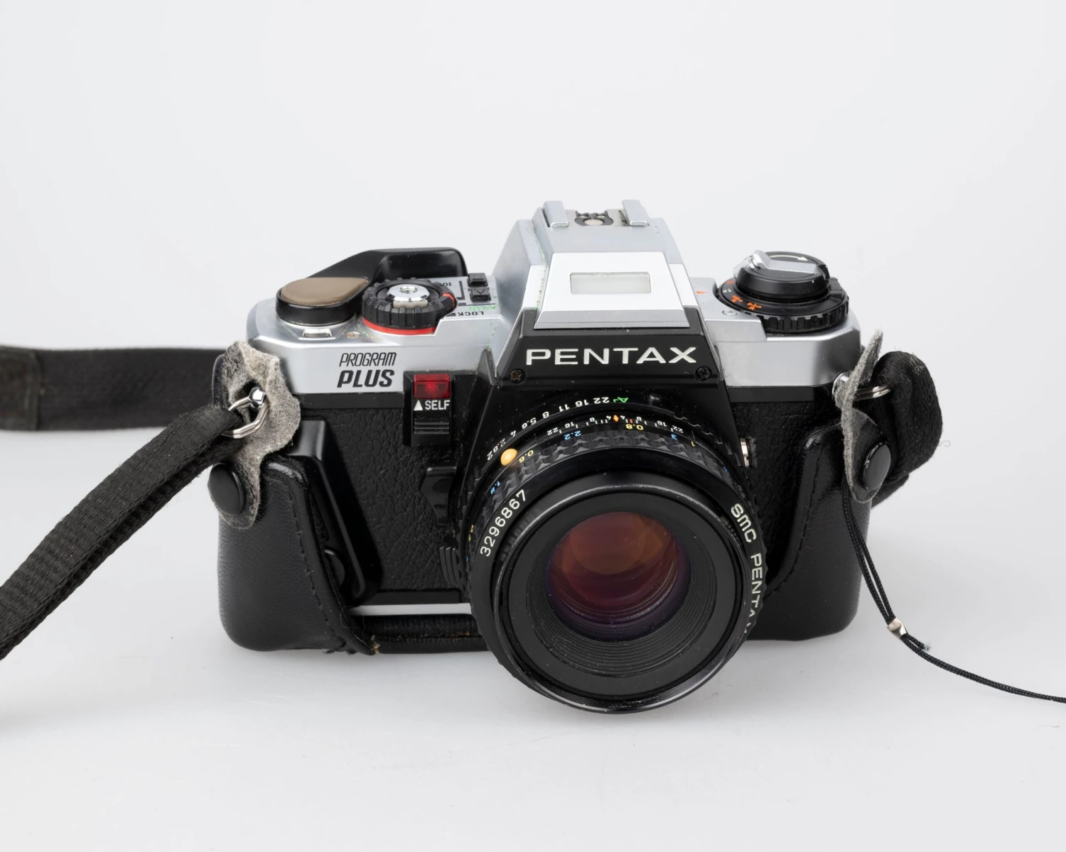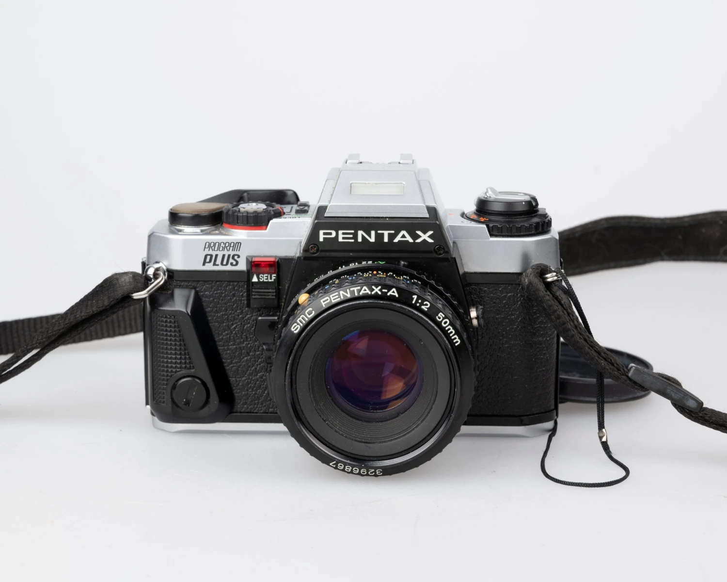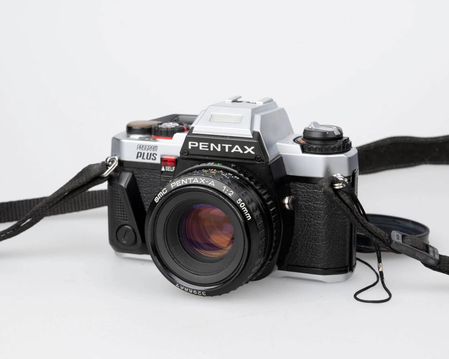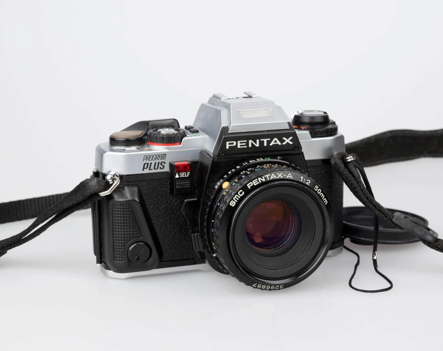 The Pentax Program Plus is a circa-1984 Pentax K-mount 35mm SLR. It’s a very capable camera offering either program mode or aperture priority automatic exposure or full manual exposure. Like other Pentax cameras of its era, it’s a very lightweight camera with nice ergonomics. The included lens is a sharp SMC Pentax A 1:2 50mm (which supports program auto exposure when set to the ‘A’ dial on the aperture ring).