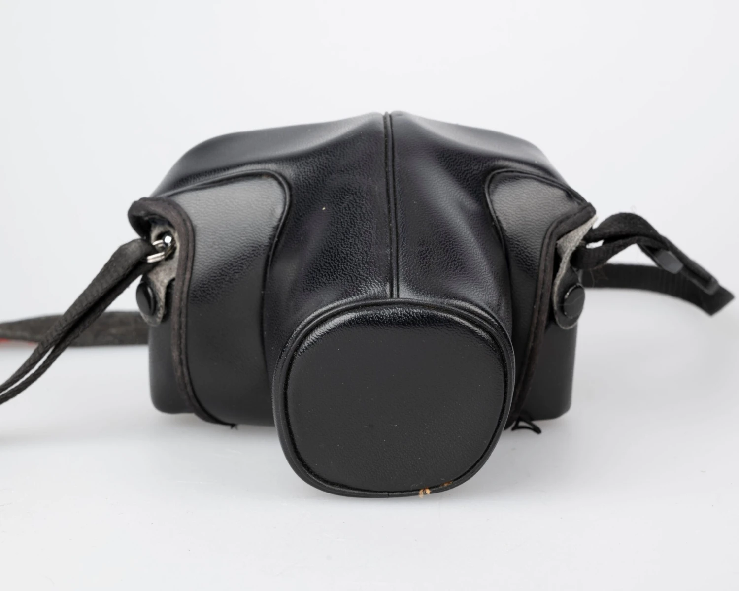 The camera, lens, and flash were tested with film and performed perfectly, it delivered sharp, correctly exposed negatives. We also verified the camera’s shutter speed and autoexposure accuracy. The camera is in very good cosmetic condition as well (see photos). One slight cosmetic flaw that we can’t easily show in photos is presence of some small specks in the viewfinder (doesn’t affect photos and in our opinion not objectionable). The included ever-ready case is in good condition except the leatherette paint flaked off the snaps that go around the camera strap.