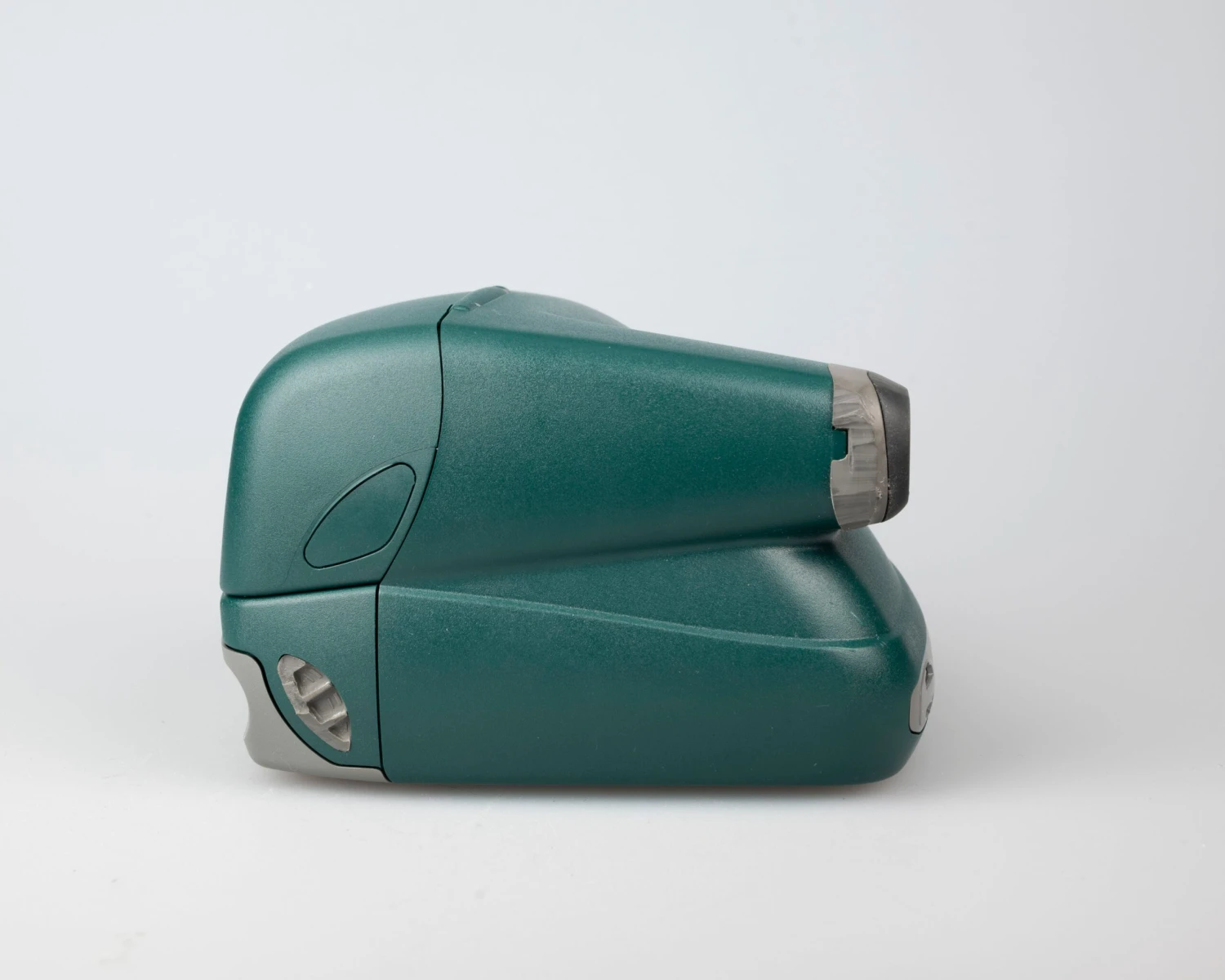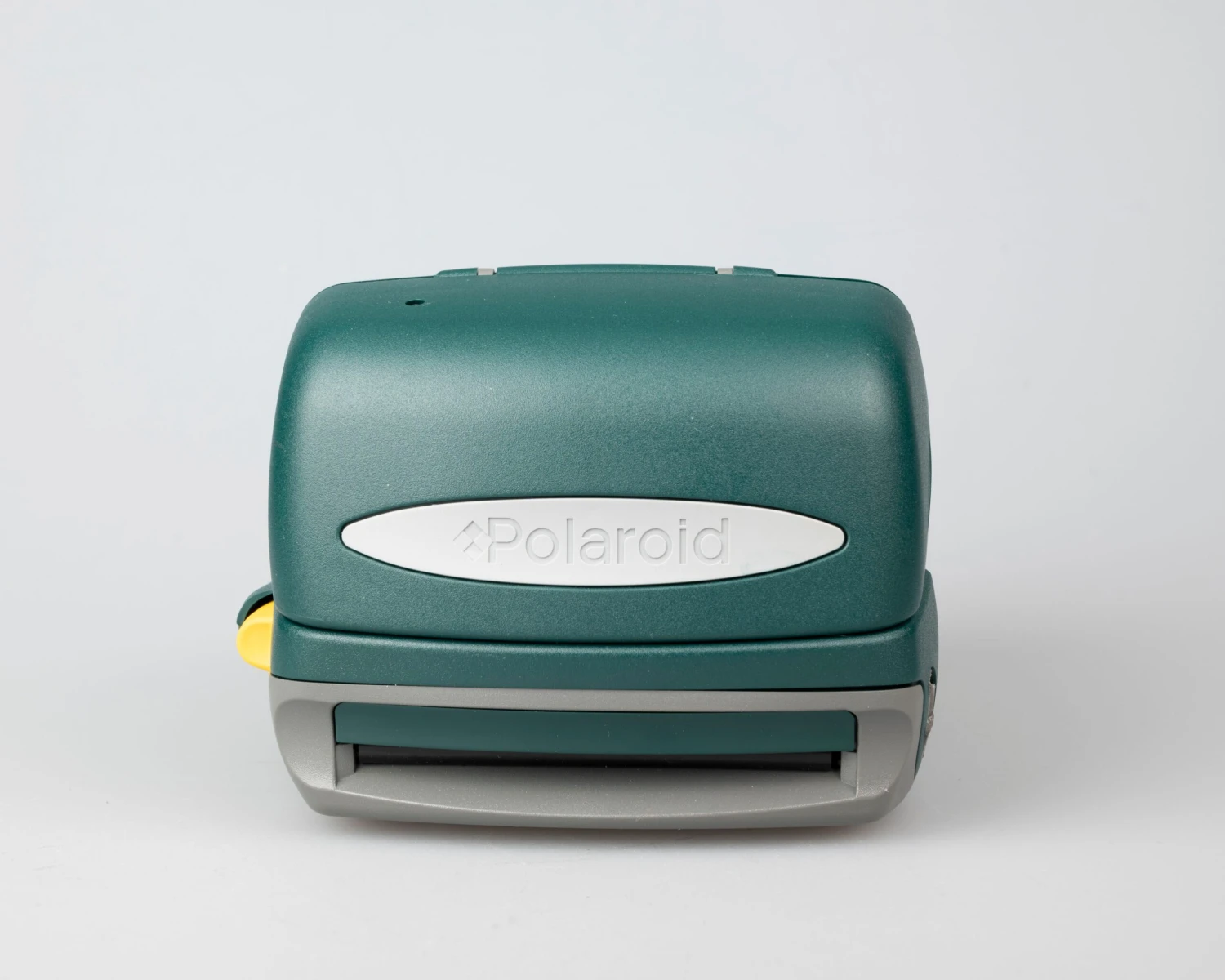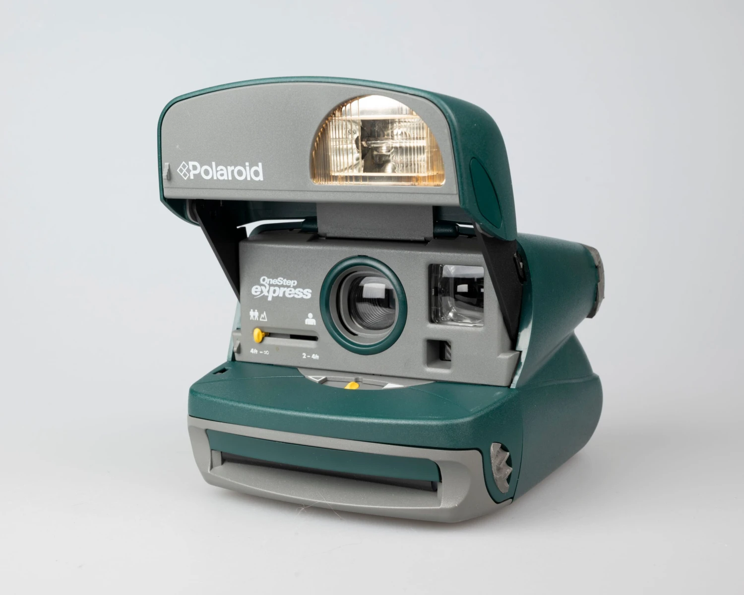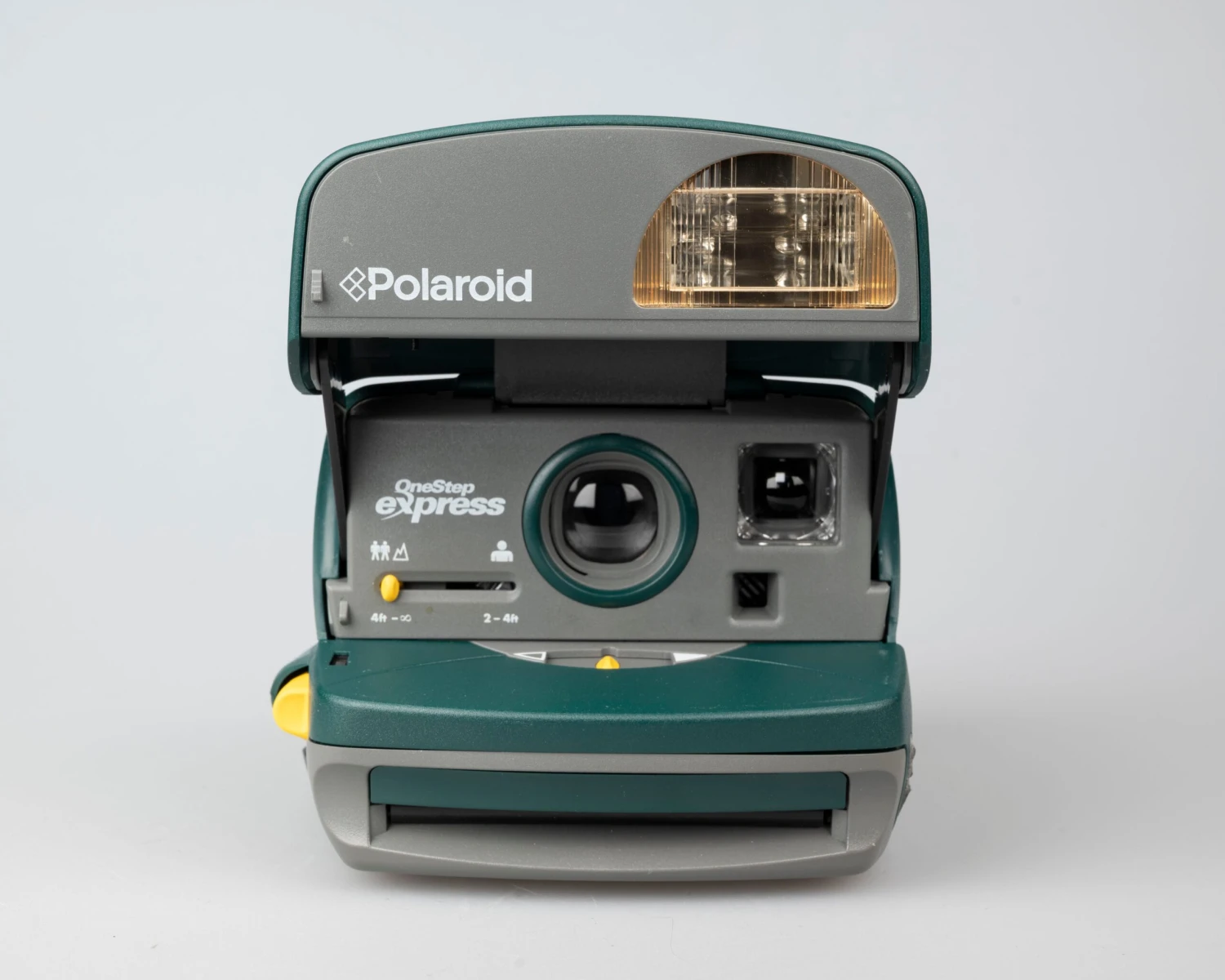 The OneStep Express is a simple instant camera from the fourth generation of type-600 film compatible models. This one features a bold hunter green, grey, and yellow colour scheme.