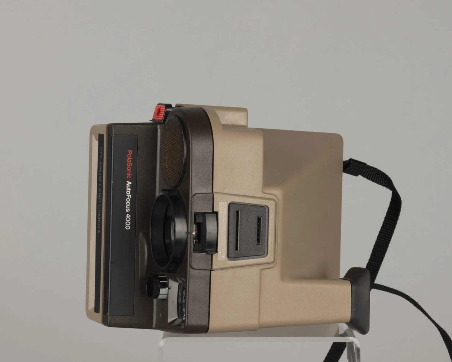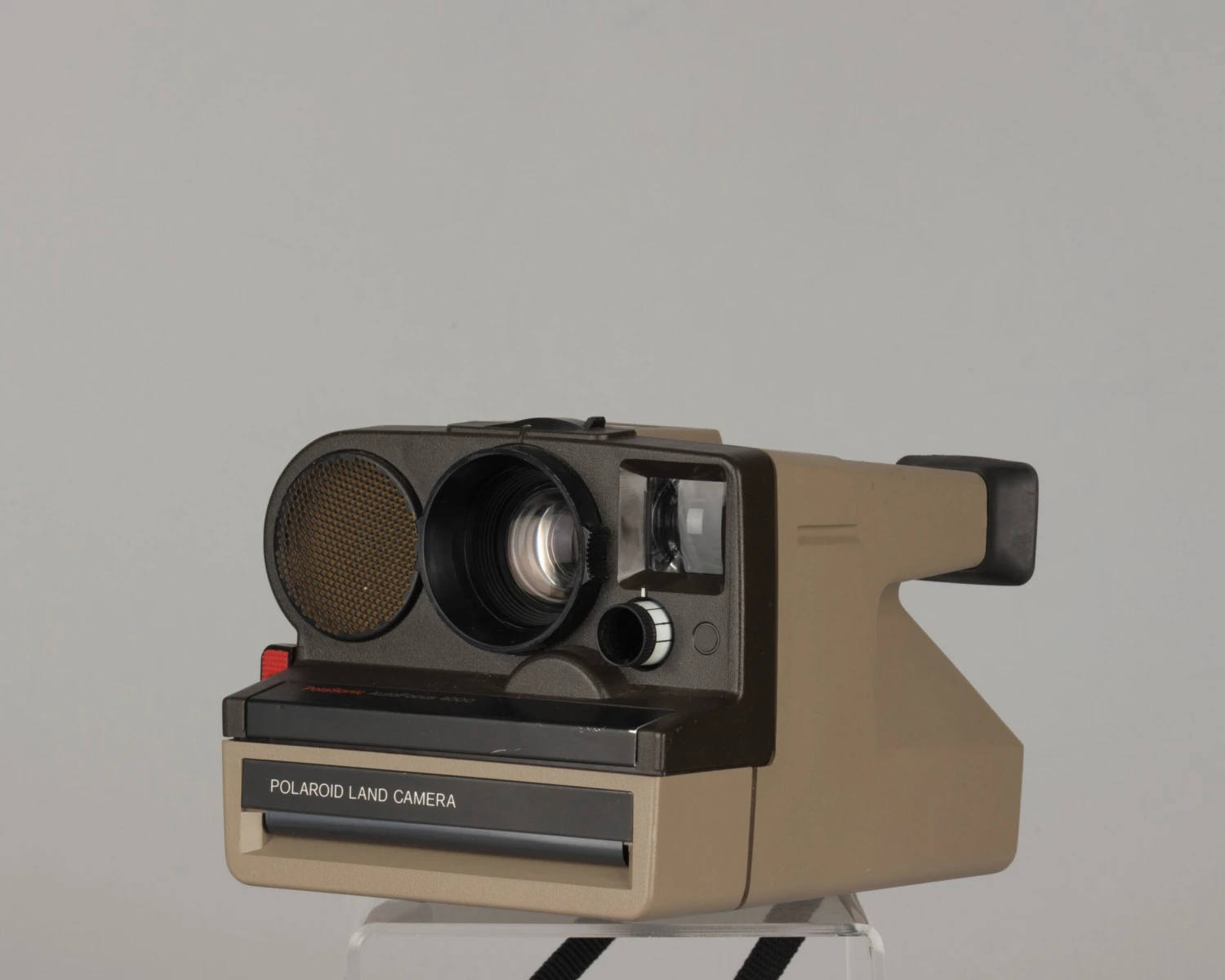 This Polasonic 4000 Autofocus/One Step Sonar is one of our very favorite Polaroid instant camera models because it offers both a sophisticated sonar autofocus mode (the golden disk is a sonar device) as well as a manual scale focus mode for situations where sonar doesn’t work (mostly shooting through windows). Also included is a Polatronic electronic flash which greatly improves the camera’s usability in low light (it requires 4 AA batteries which are not included). No flash bracket is included so you have to have to hold the flash in one hand (slightly awkward at first but not too difficult in our opinion).