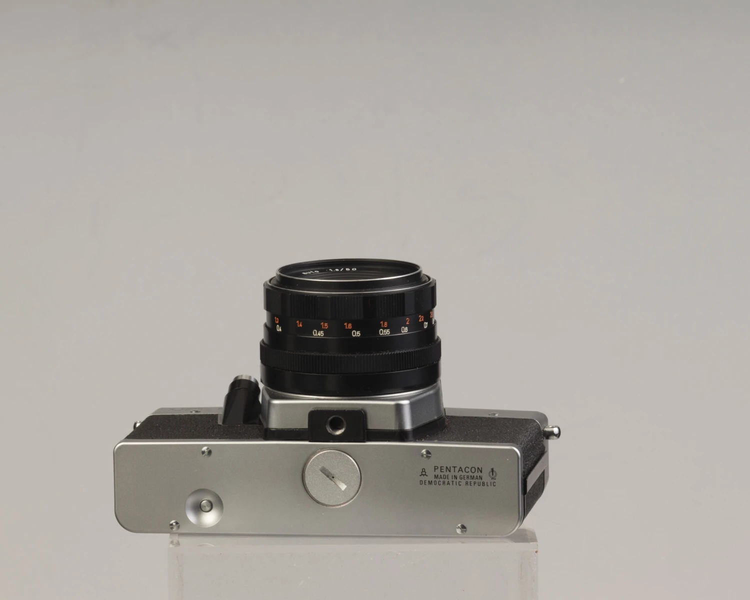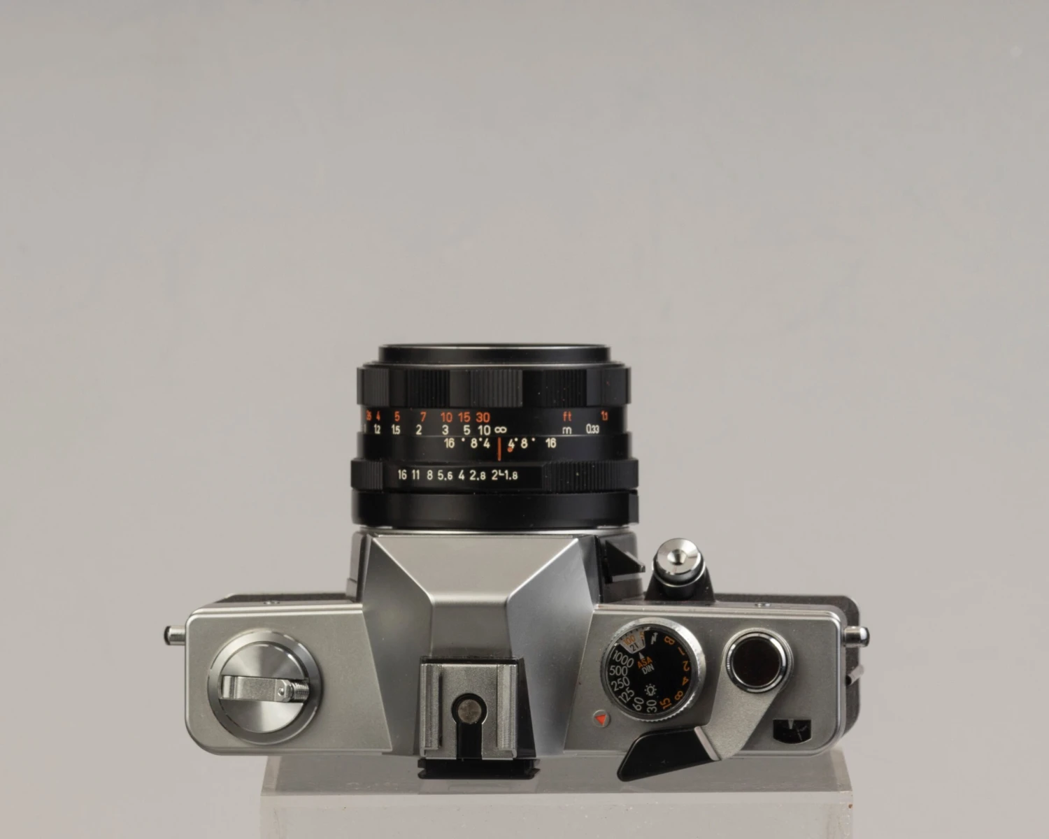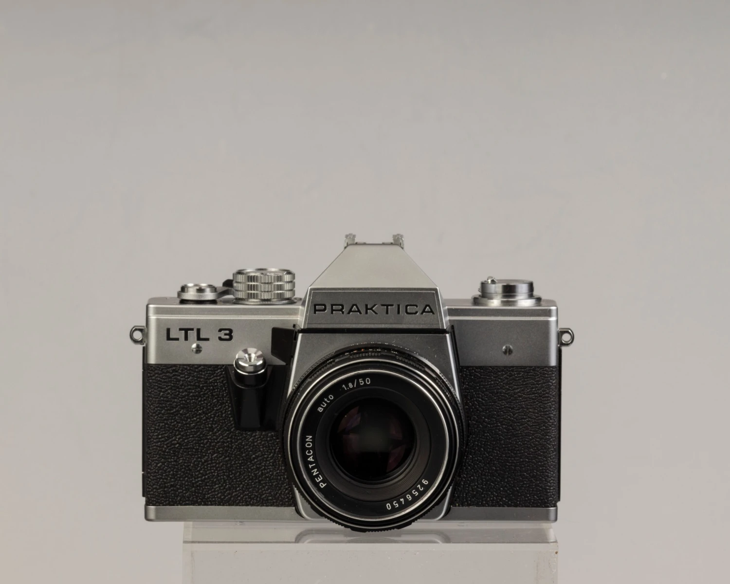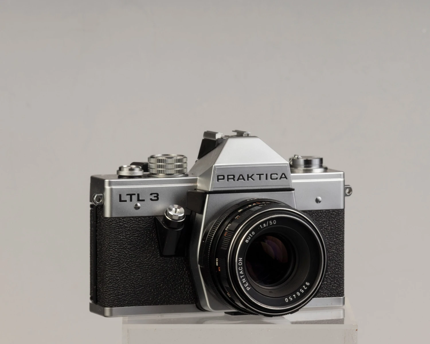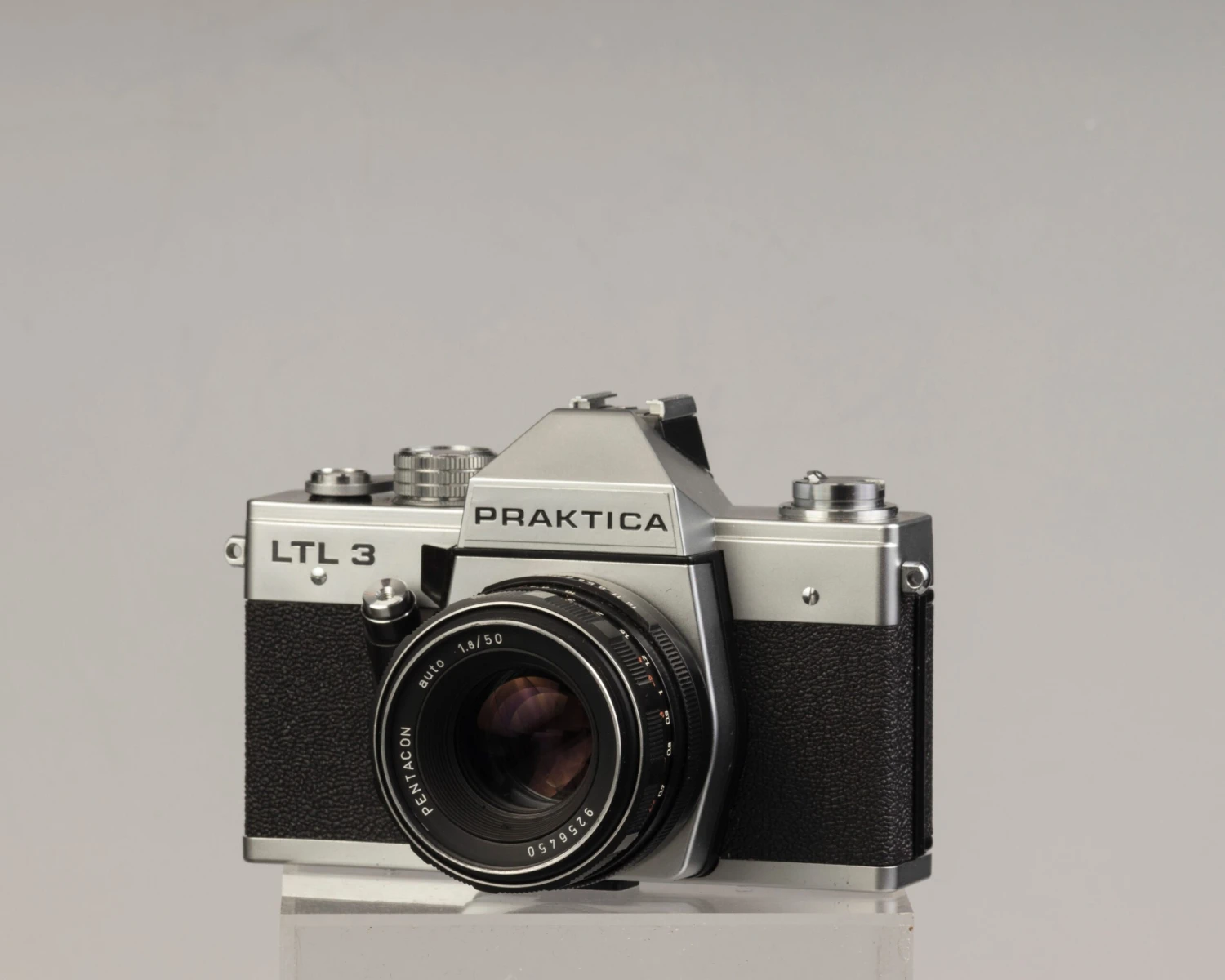 The Praktica LTL 3 is is a basic but well-designed East German 35mm SLR camera from the late 1970s. It uses the common M42 lens mount (found in Pentax Spotmatic SLRs and many other types). It’s in great working condition. All shutter speeds are working with good accuracy. It includes a sharp Penacon 50mm f1.8 lens and the original ‘ever-ready’ case.