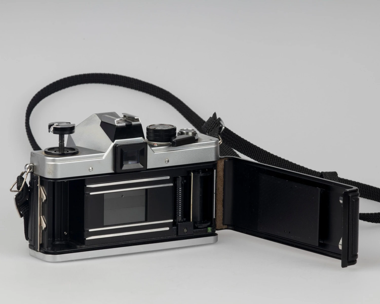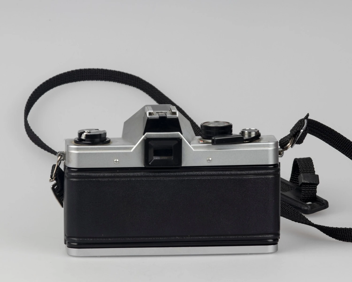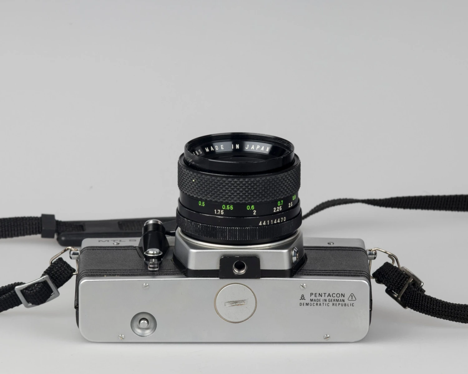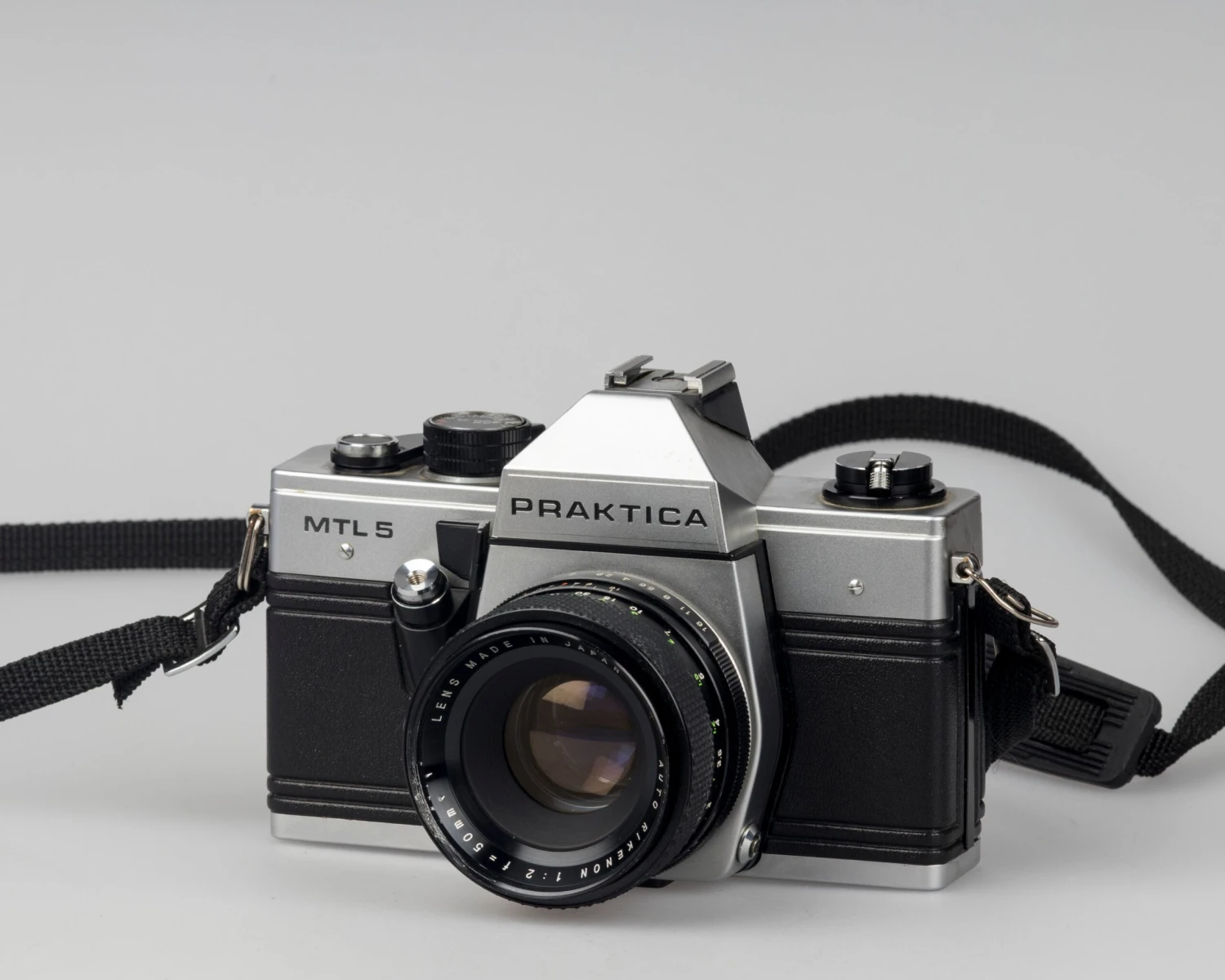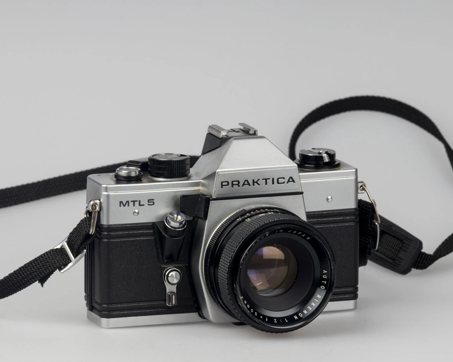 The Praktica MTL 5 is is a well-designed East German 35mm SLR camera from the 1980s. It uses the common M42 lens mount (found in Pentax Spotmatic SLRs and many other types). It’s in great working condition. All shutter speeds are working with good accuracy. It includes a sharp Rikenon 50mm F2 lens (made in Japan by Ricoh).