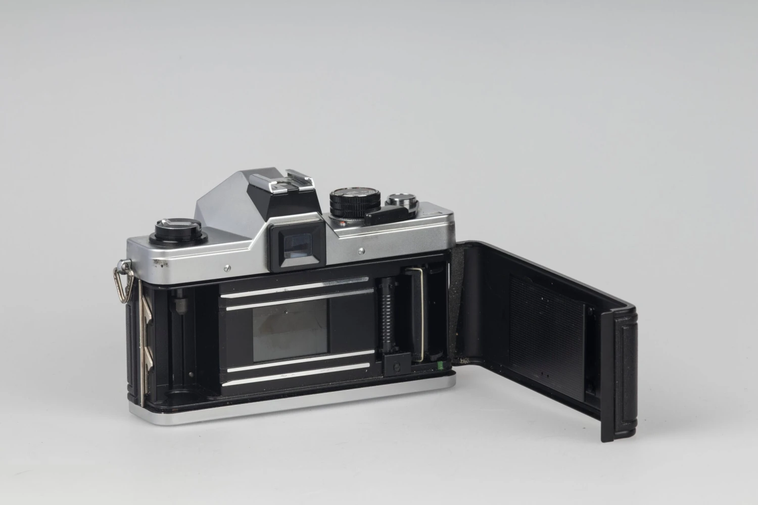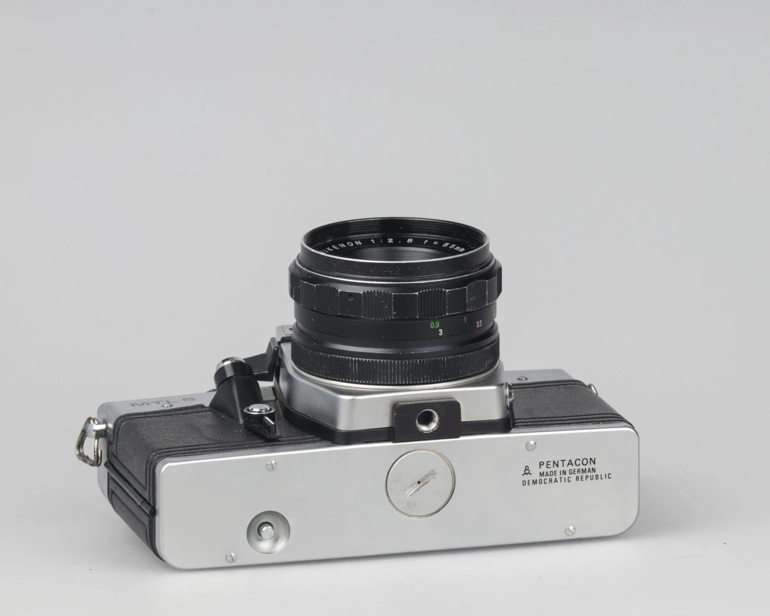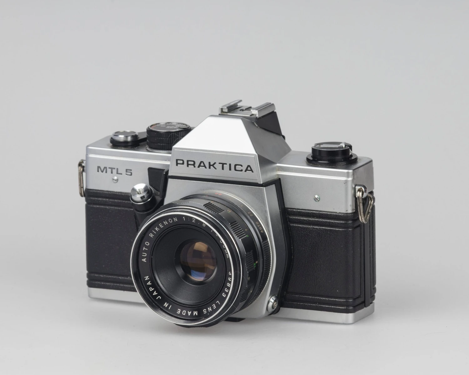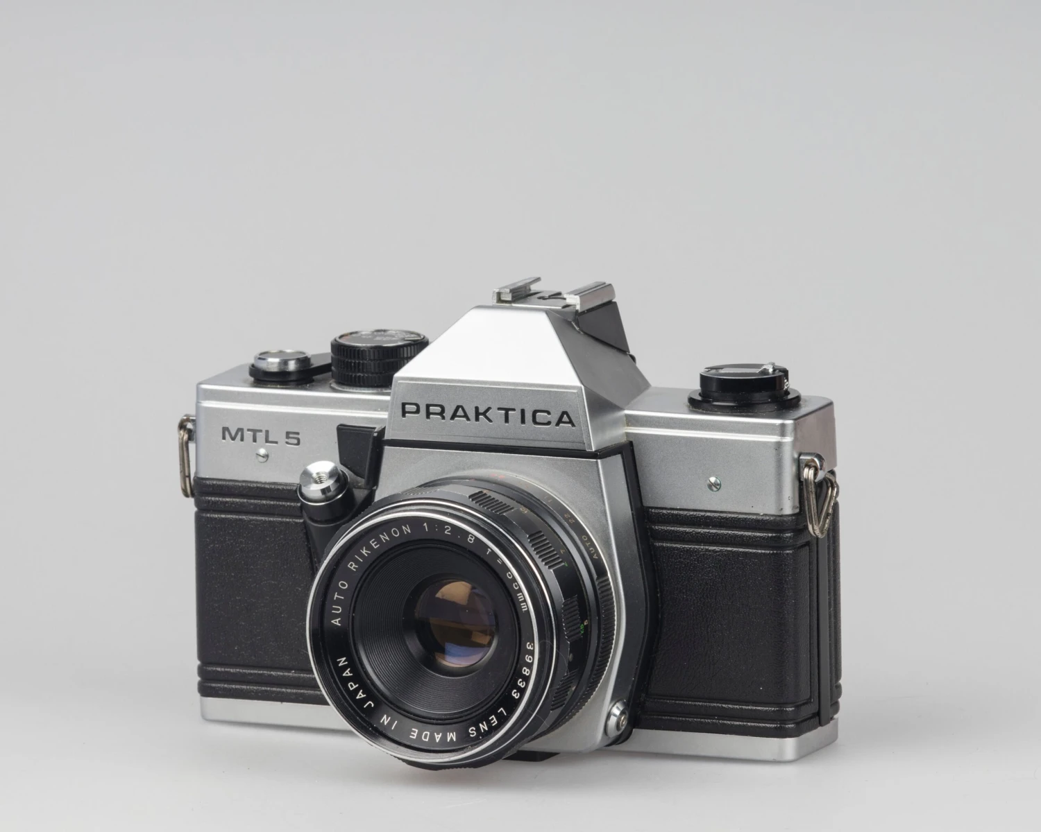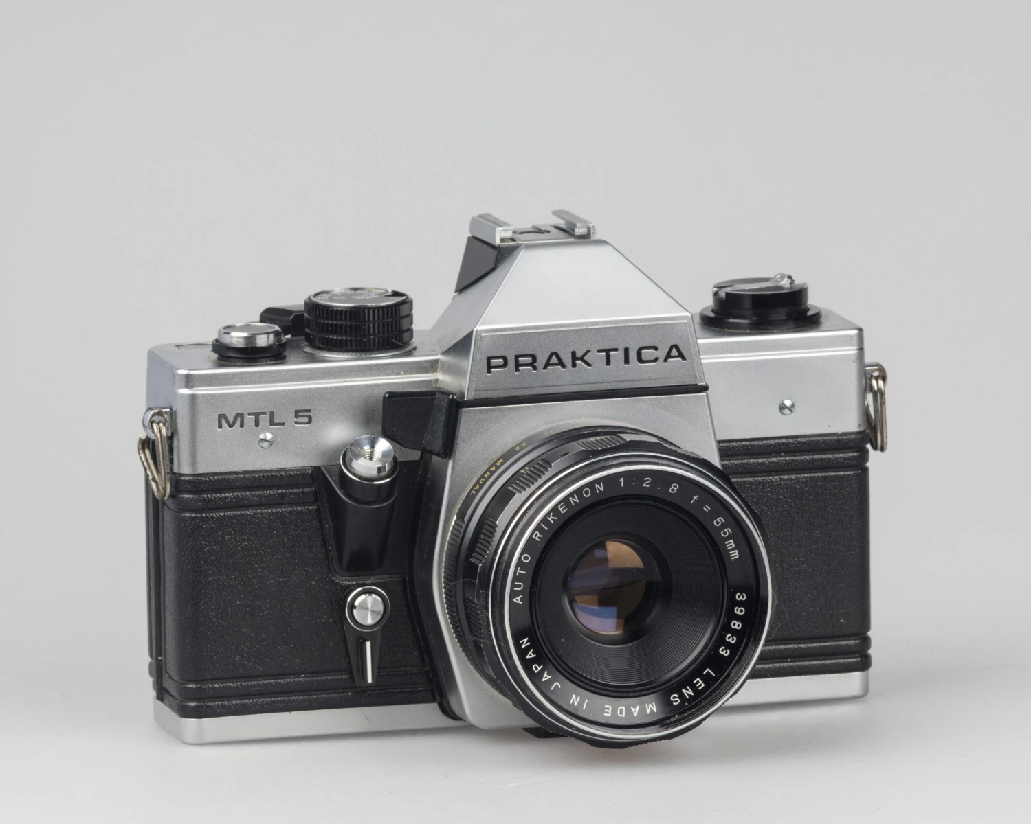 The Praktica MTL 5 is is a well-designed East German 35mm SLR camera from the 1980s. It uses the common M42 lens mount (found in Pentax Spotmatic SLRs and many other types). It’s in great working condition. All shutter speeds are working with good accuracy. It includes a sharp Rikenon 55mm F2.8 lens (made in Japan by Ricoh).