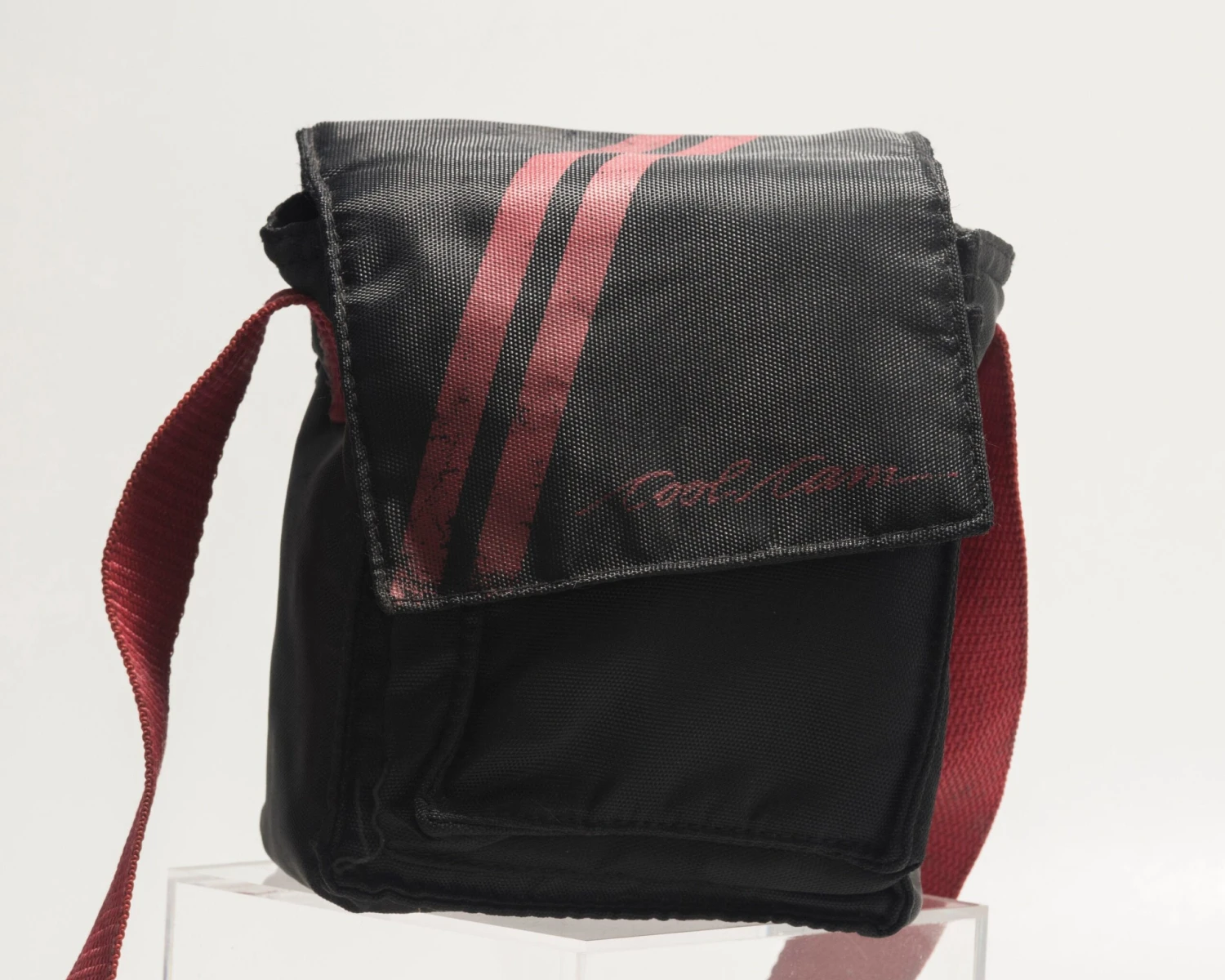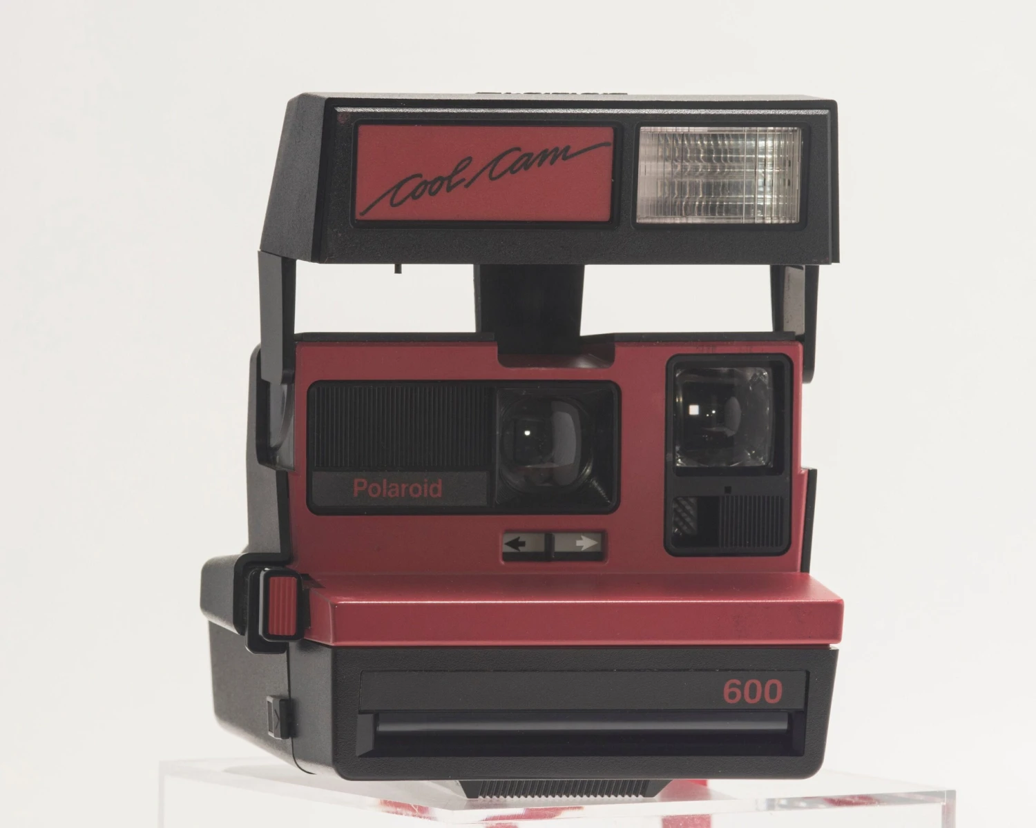 This is the striking red and black edition of the Polaroid Cool Cam, a Polaroid 600 compatible instant camera from the 90s. The original carrying cases is included.