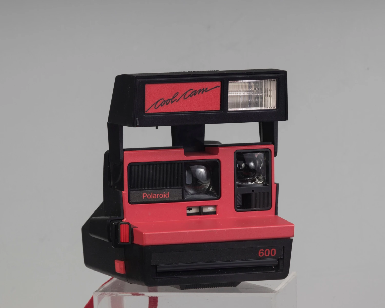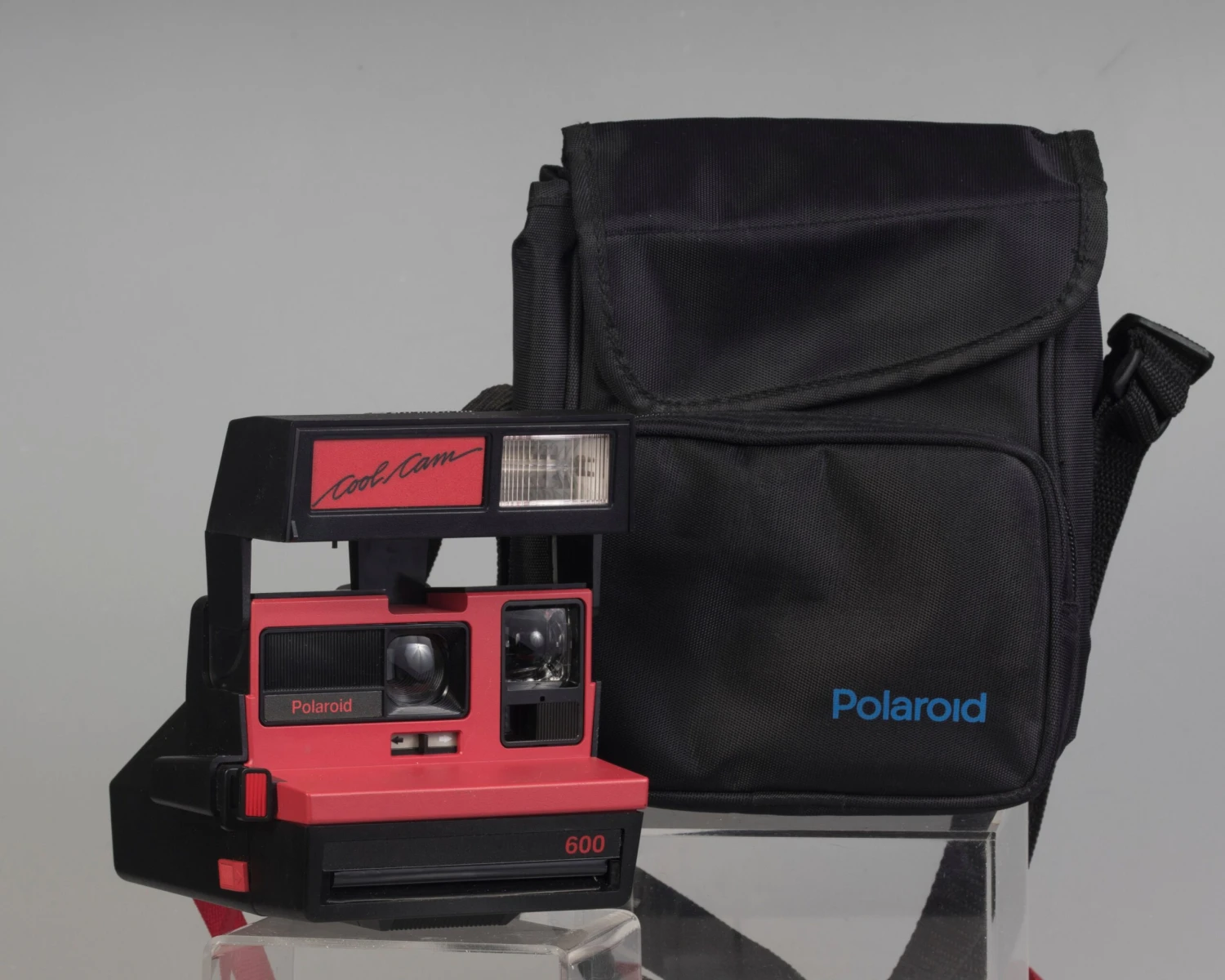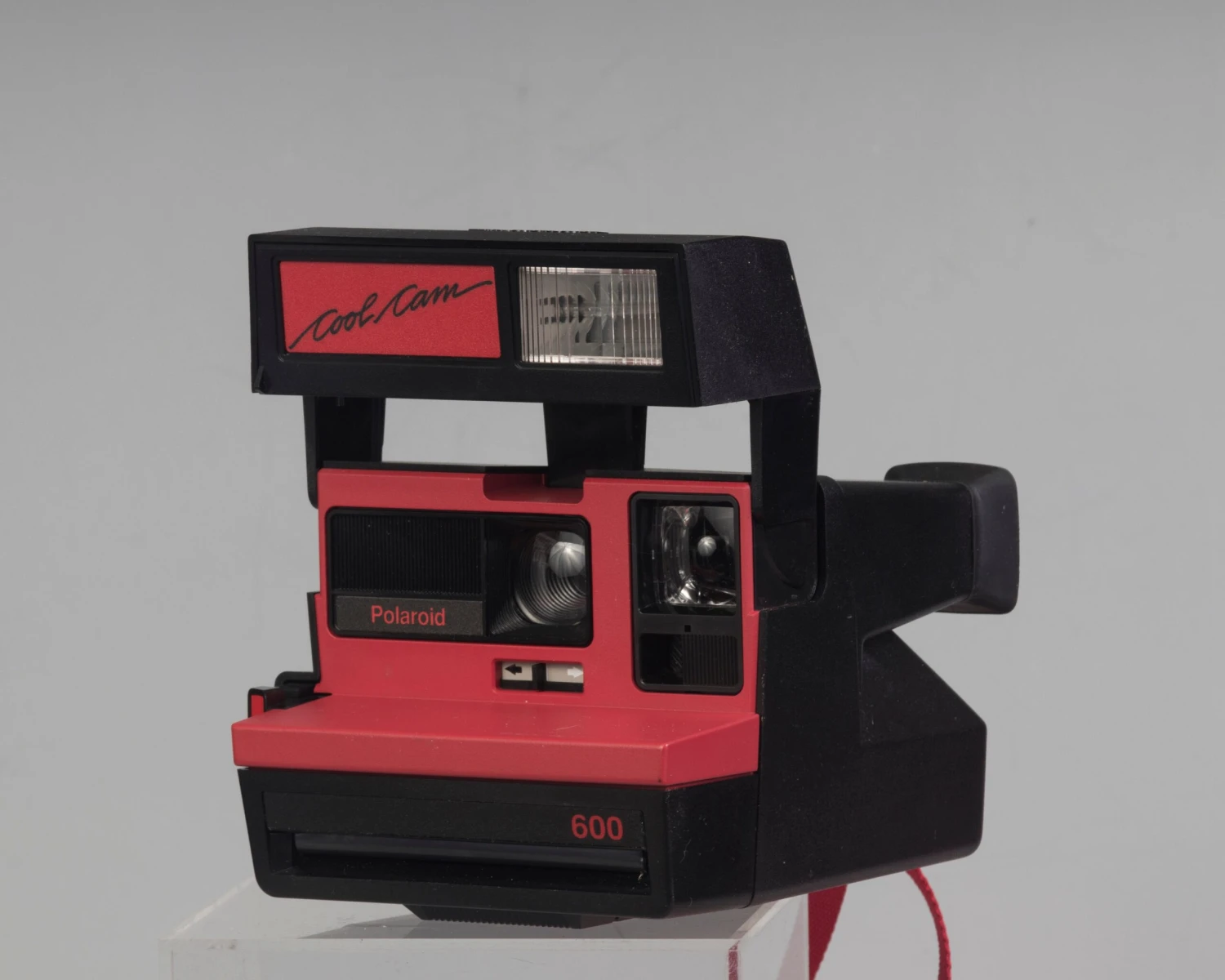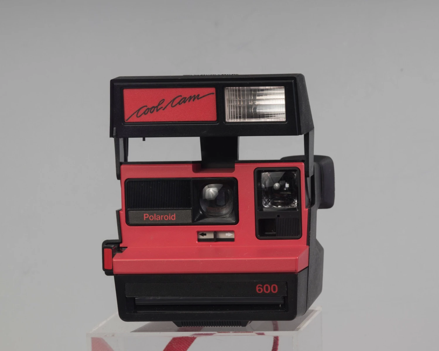 This is the striking UK-made red and black edition of the Polaroid Cool Cam, a Polaroid 600 compatible instant camera from the 90s. The Polaroid Cool Cam uses the most common type of Polaroid film: Polaroid Originals type-600 color or black and white film packs. This film is still being made and is available online and from most camera shops.