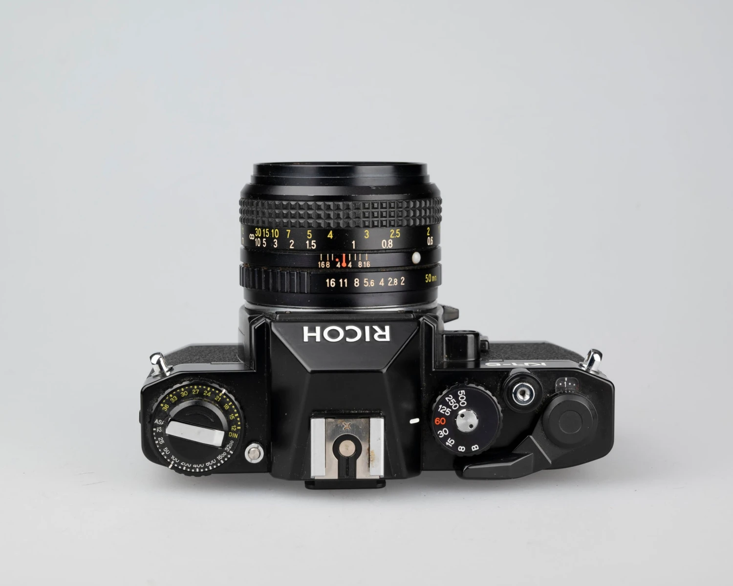 The Ricoh XR-5 is a very simple mechanical 35mm from the late 1970s. The included lens is a fast and sharp Rikenon 50mm f2. This camera competed with the Pentax K1000 (and it is compatible with the same K-mount lens) as both cameras are no-nonsense, reliable mechanical cameras with little in the way of frills.