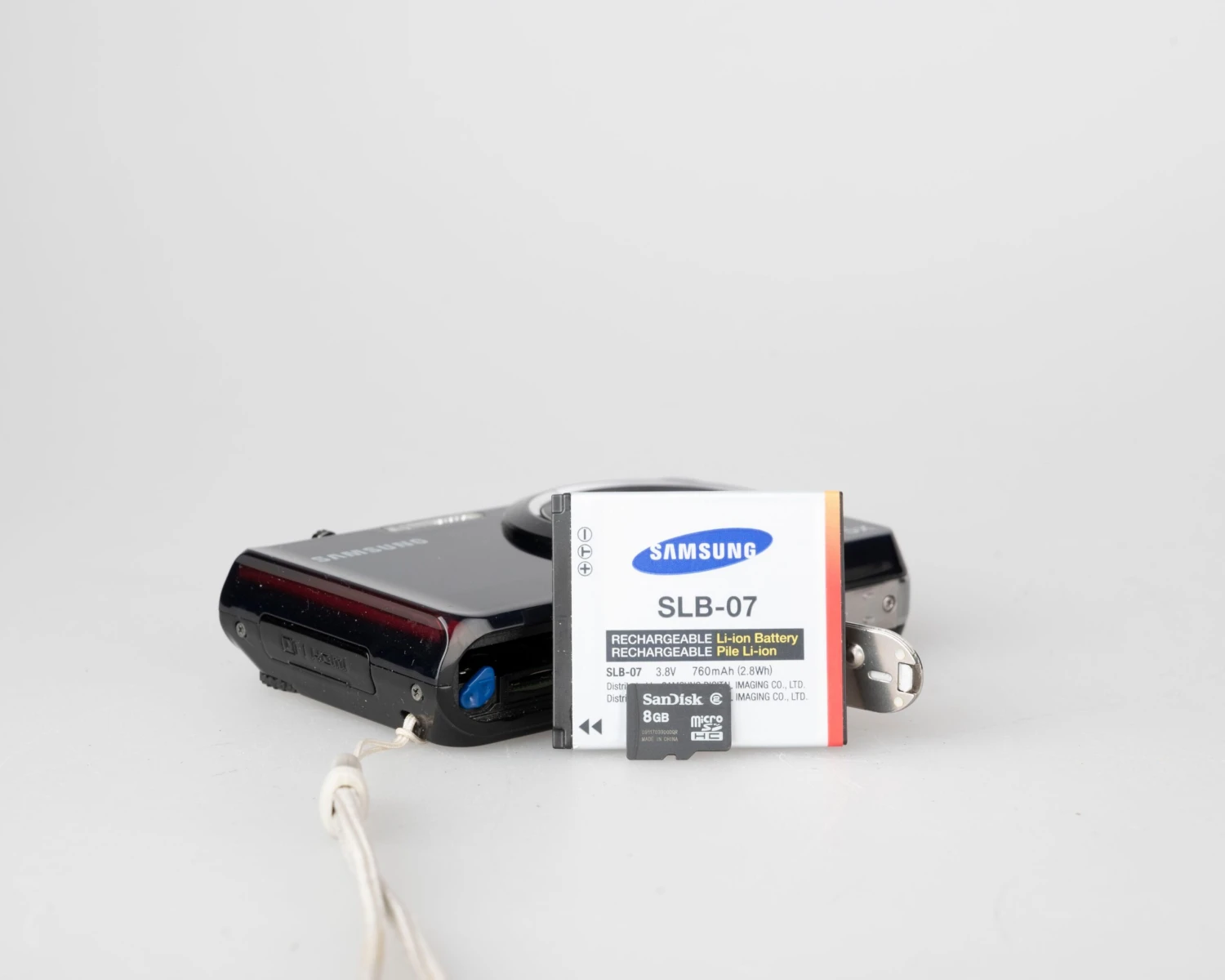 A generic charger, the original Samsung case, and 8GB micro SD card are included. Please note that while we confirmed the included battery is charging, we cannot guarantee its capacity. For serious work we recommend buying a second battery pack (it uses a SLB-07 type which is still widely available online).