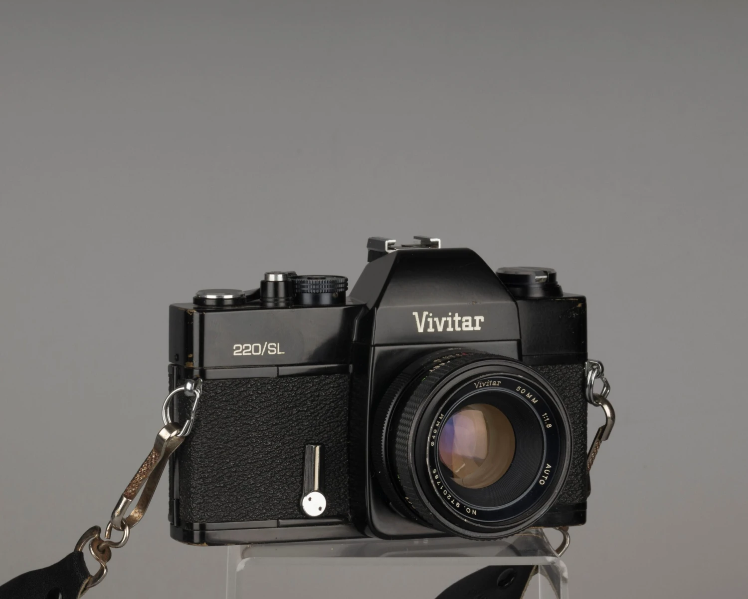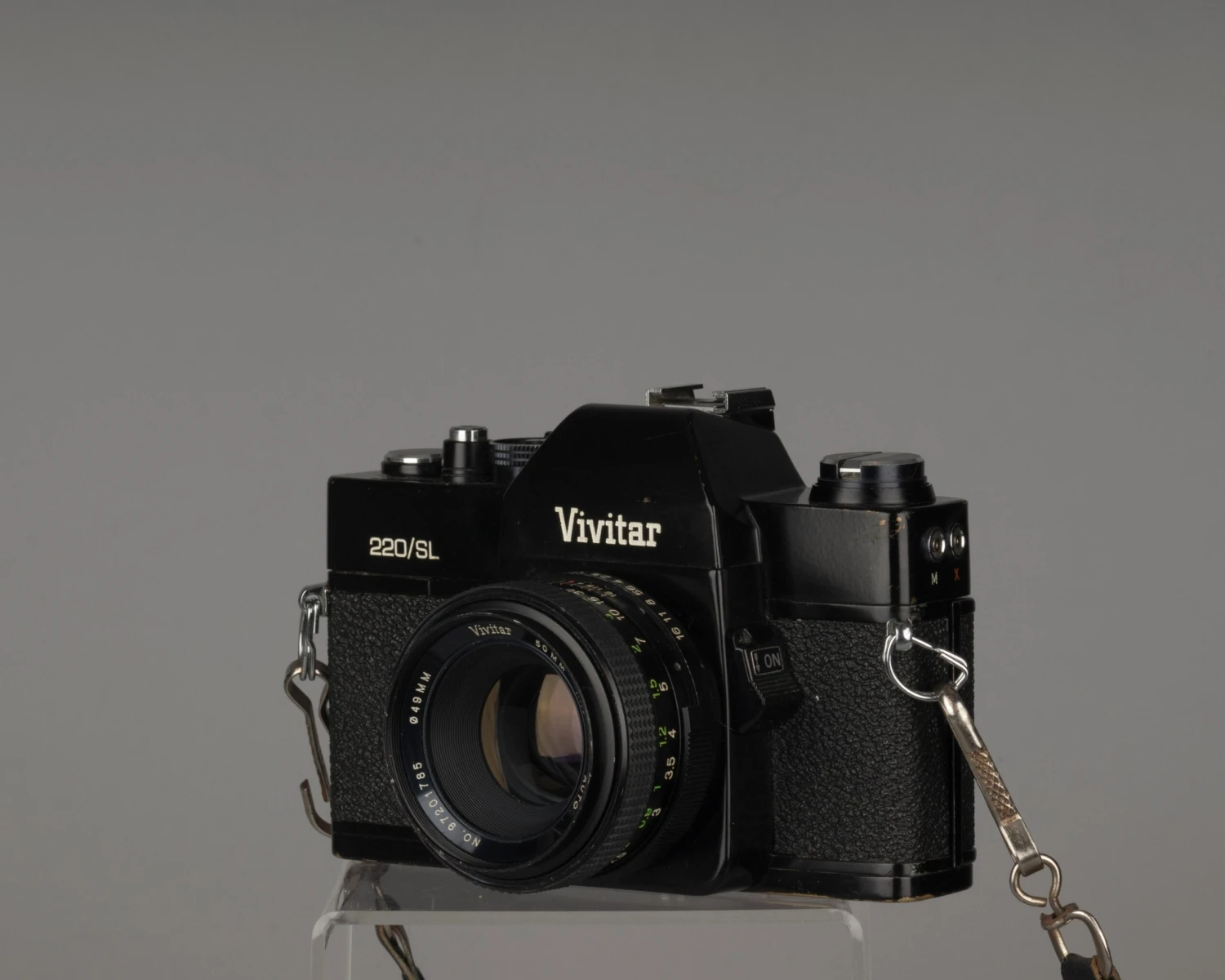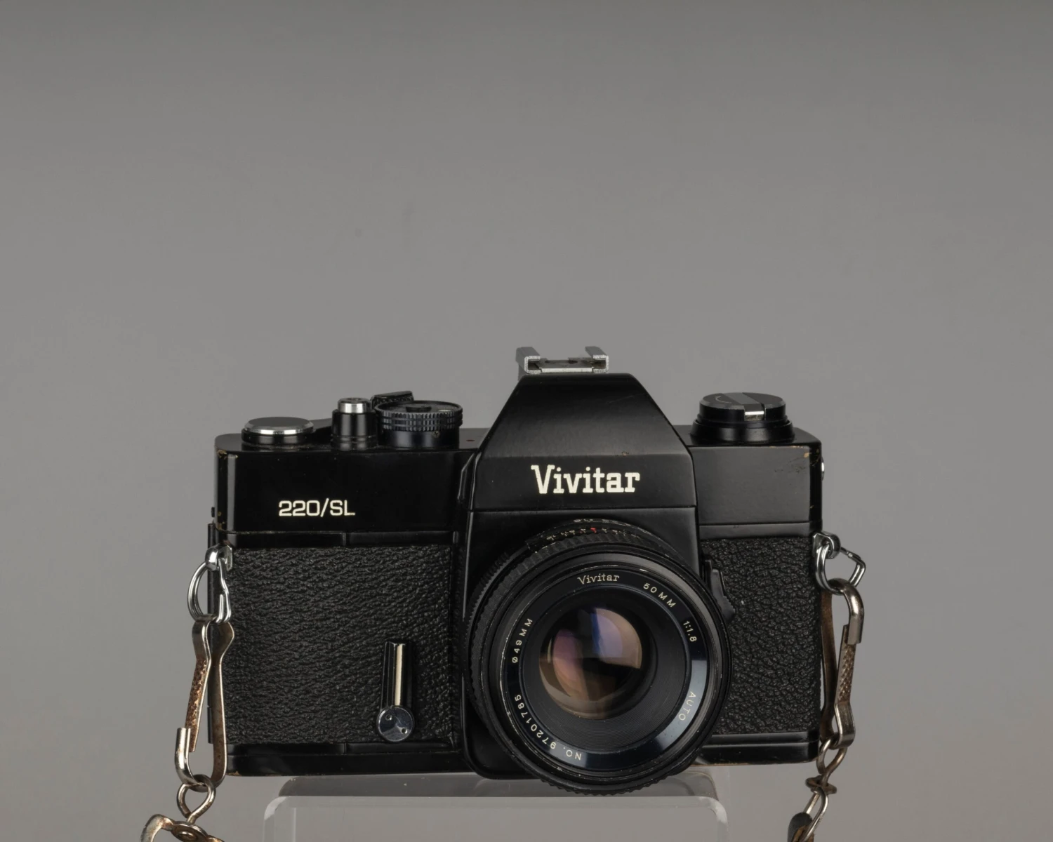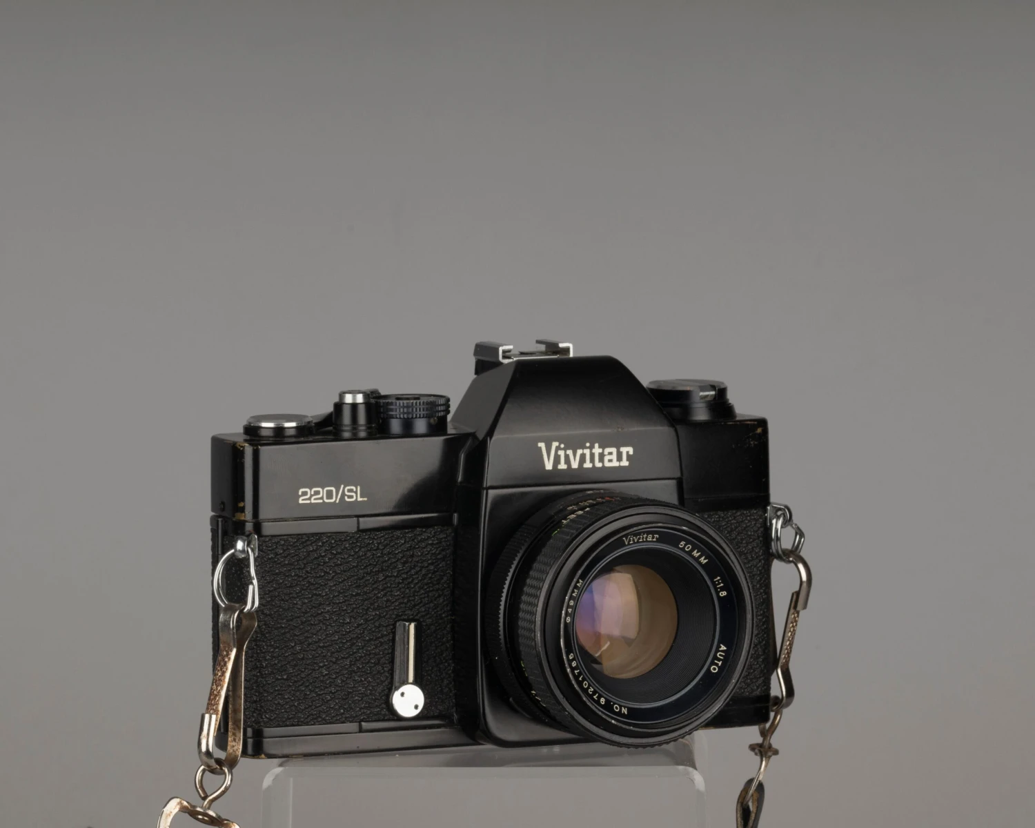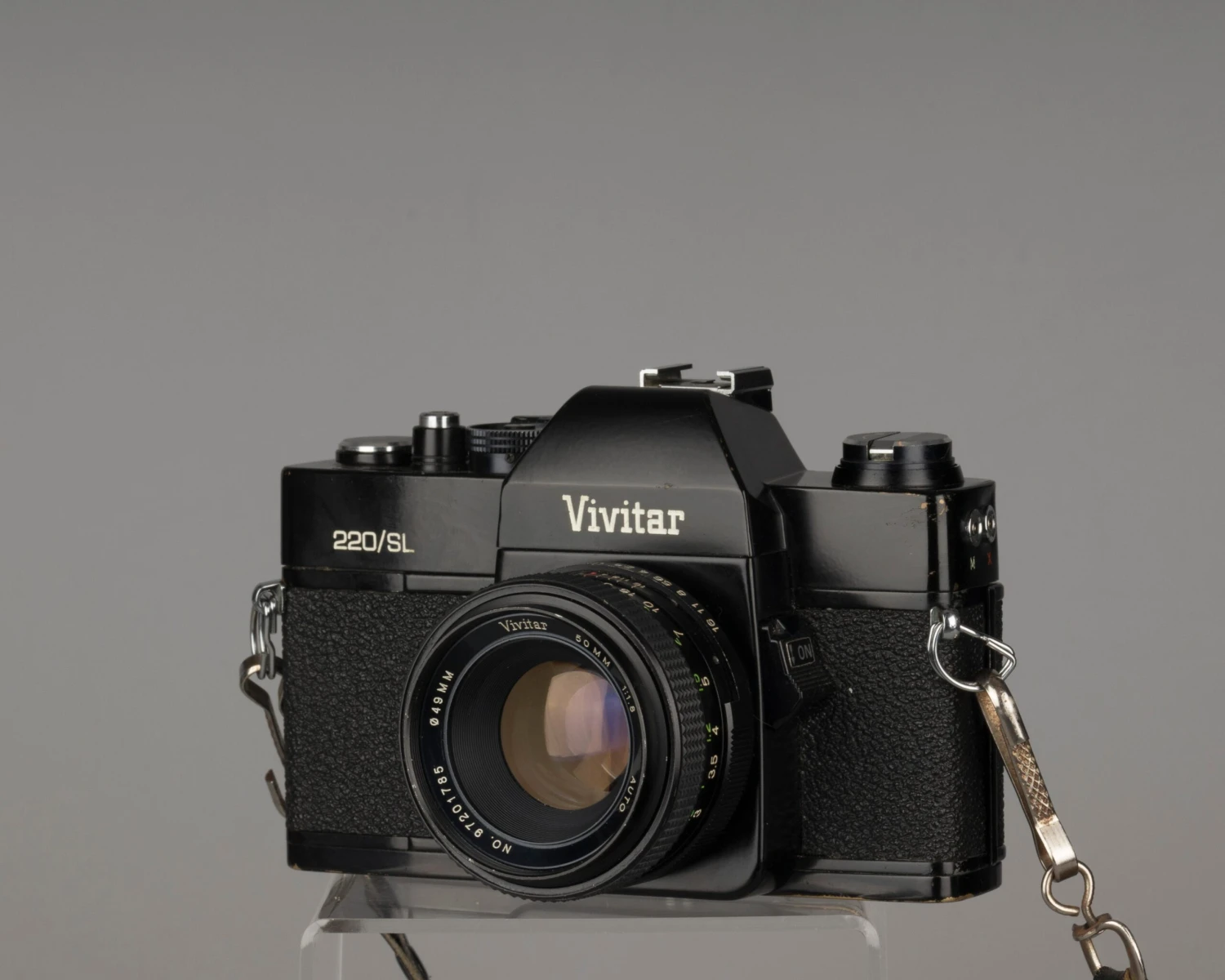 This Vivitar SL/220 is a solid, good quality 35mm SLR from the 1970s (it’s identical to the better-known Argus Cosina STL 1000); the included Vivitar 50mm f1.8 lens is very sharp. We film tested this camera and it was a pleasure to use and gave us good results.