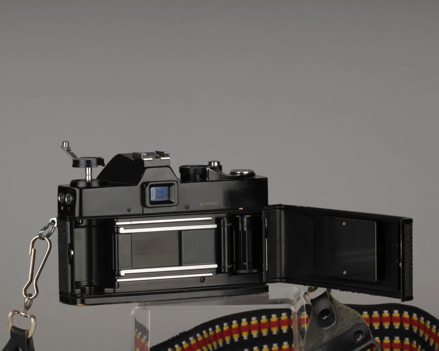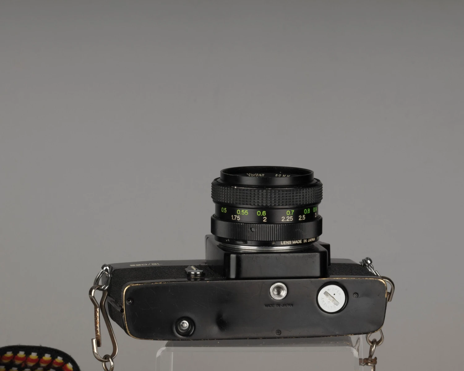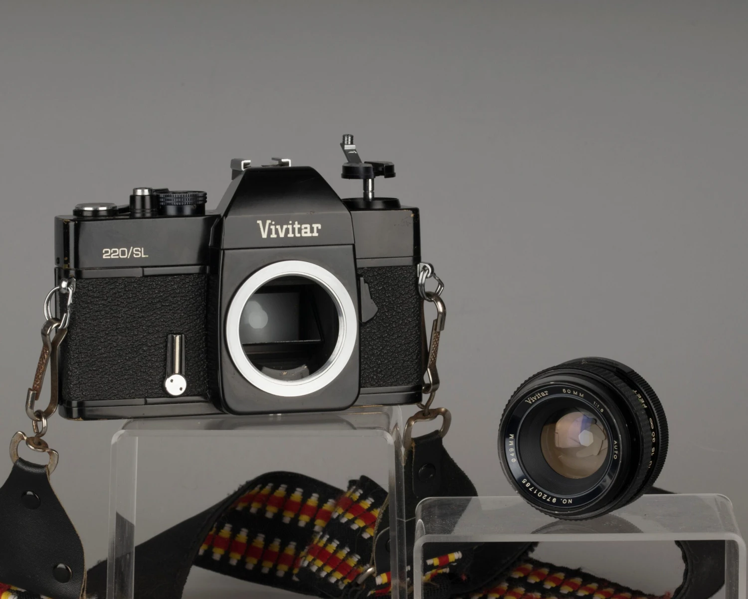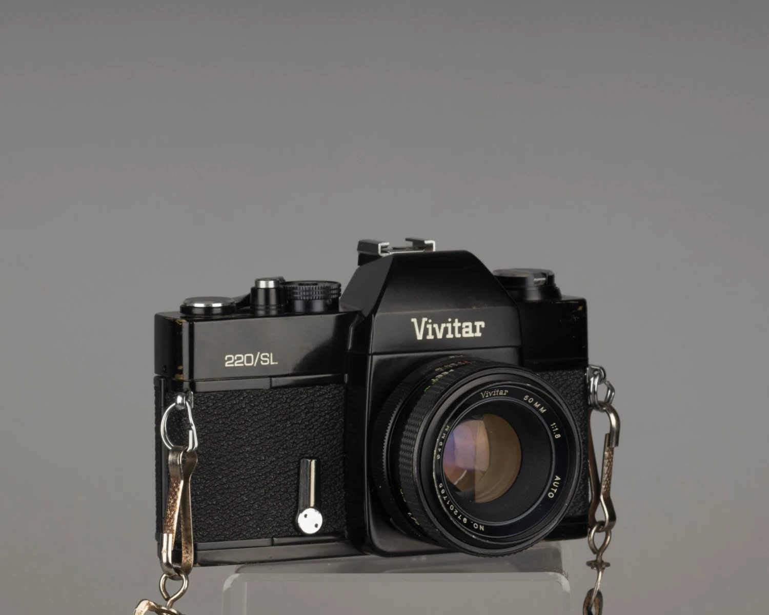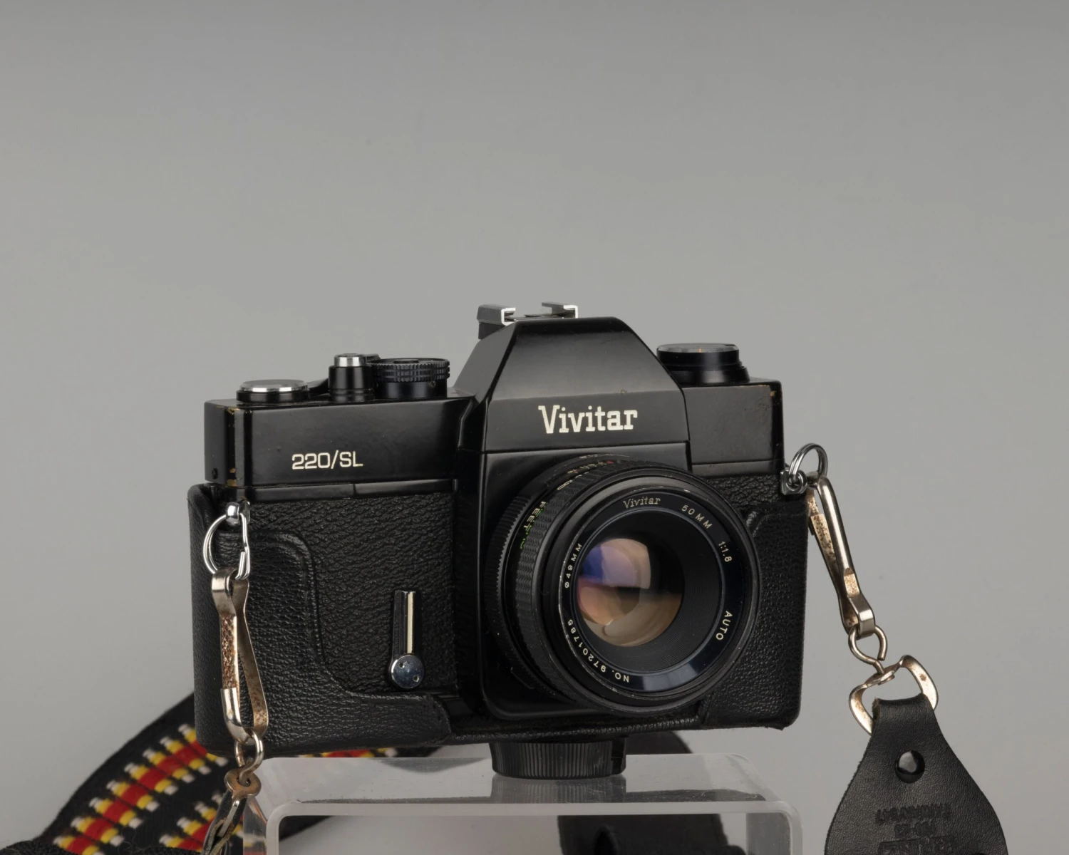 This Vivitar SL/220 is a solid, good quality 35mm SLR from the 1970s (it’s identical to the better-known Argus Cosina STL 1000); the included Vivitar 50mm f1.8 lens is very sharp. We film tested this camera and it was a pleasure to use and gave us good results.