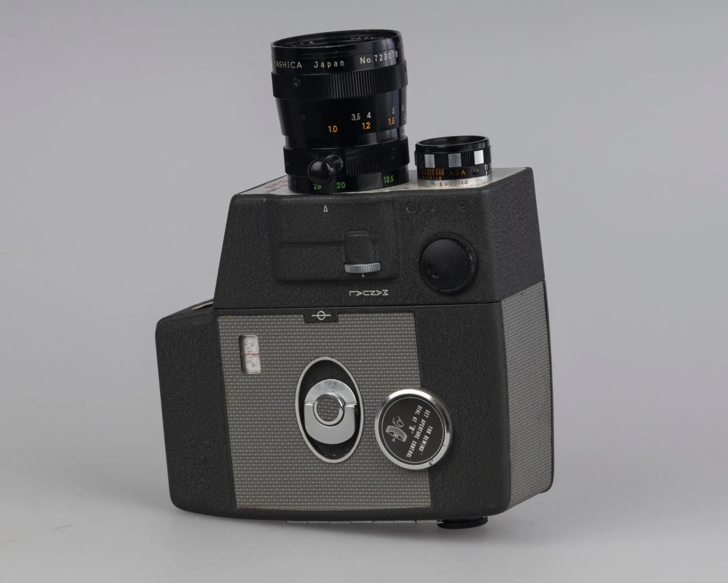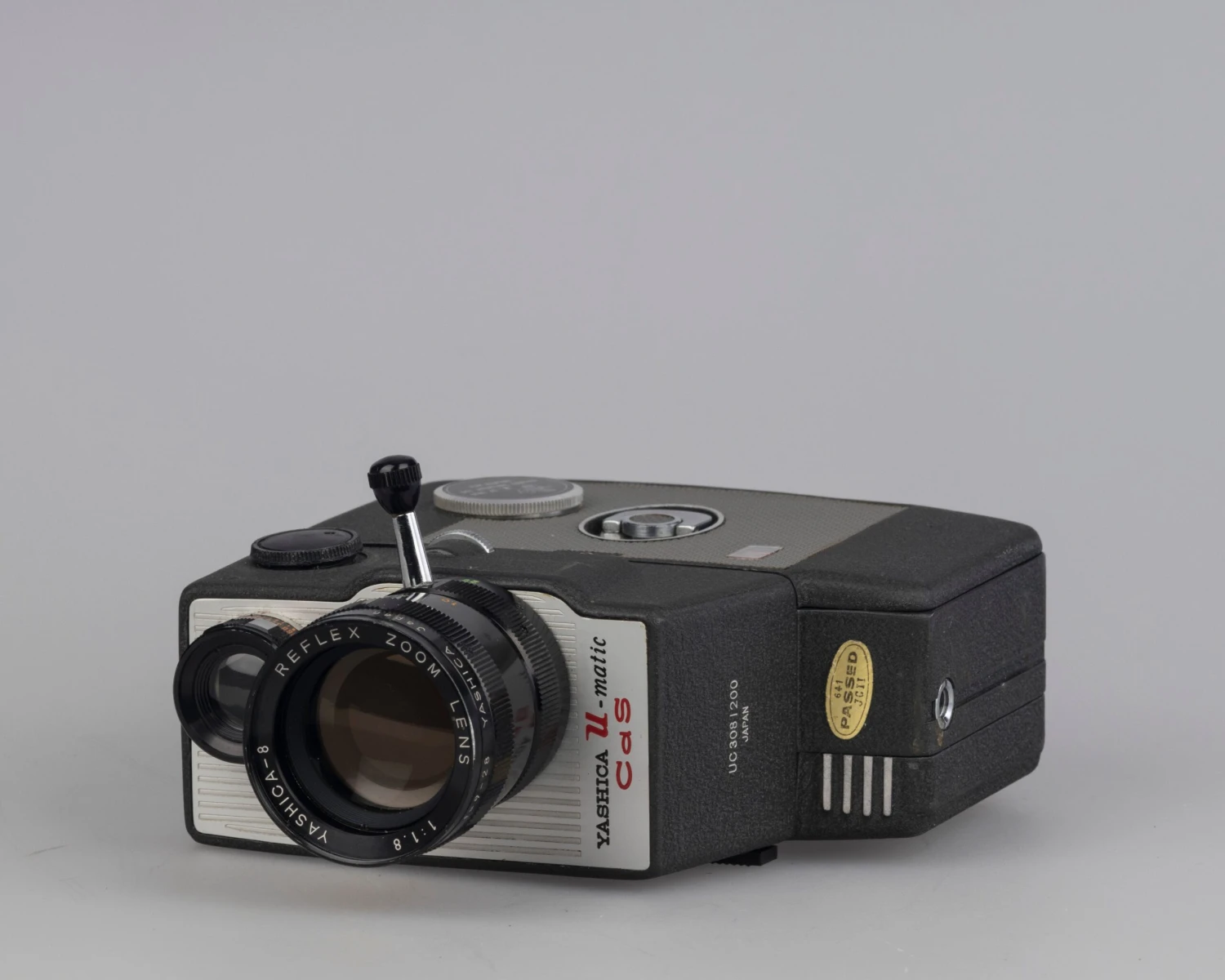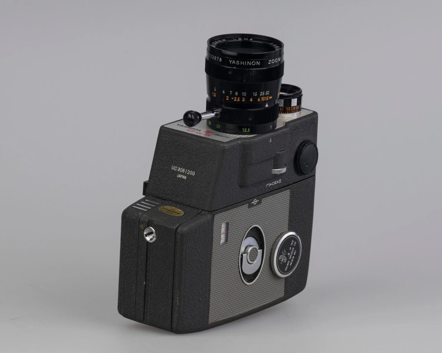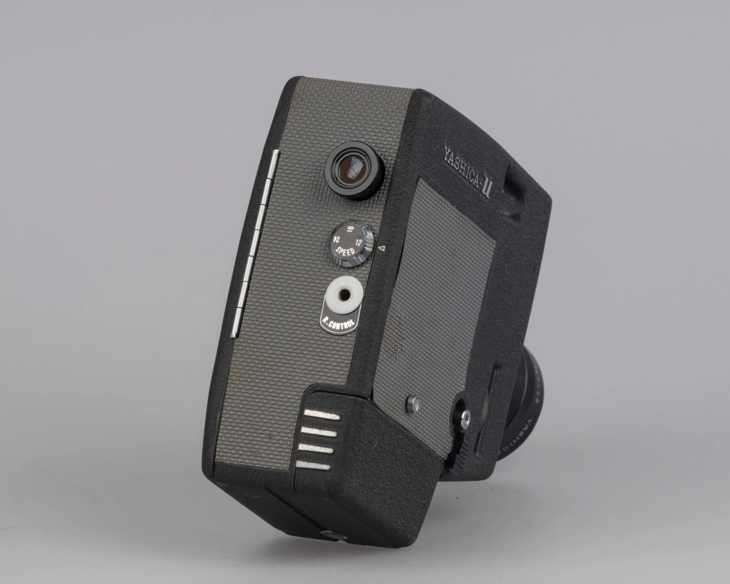 The Yashica 8 u-Matic II is an excellent quality motor drive regular 8mm movie camera from the 1960s. It improves on the original u-Matic in that it has a powered CdS light meter with a vastly expanded metering range (it covers ISO 10 – ISO 640–more than enough to meter even high speed films Kodak Vision 3 500T). The camera features reflex viewing/focusing. We recommend Fomapan R100 as an affordable, still-being-made double 8mm film for use this this camera. We recommend International Film Brokers for less common 8mm film types.