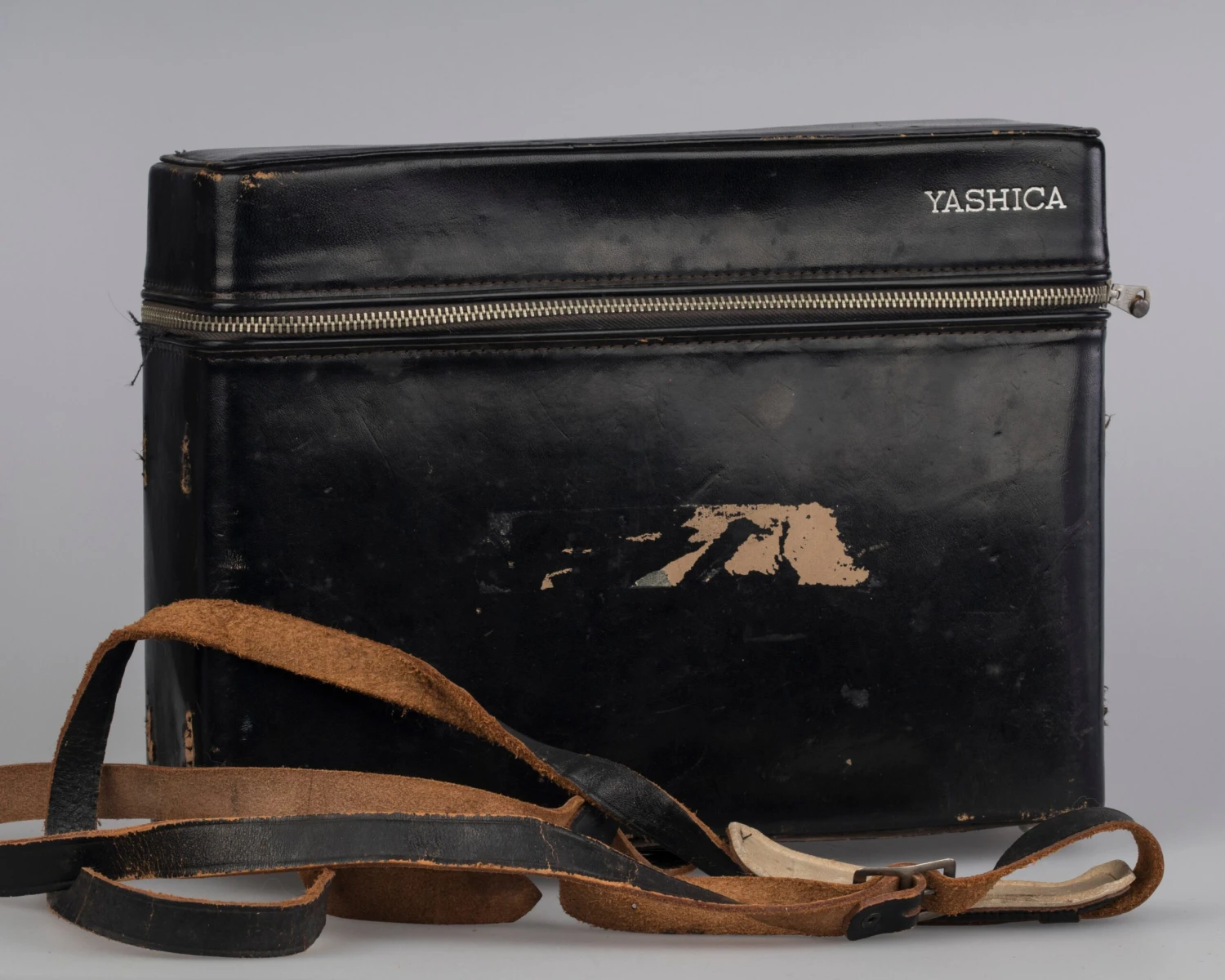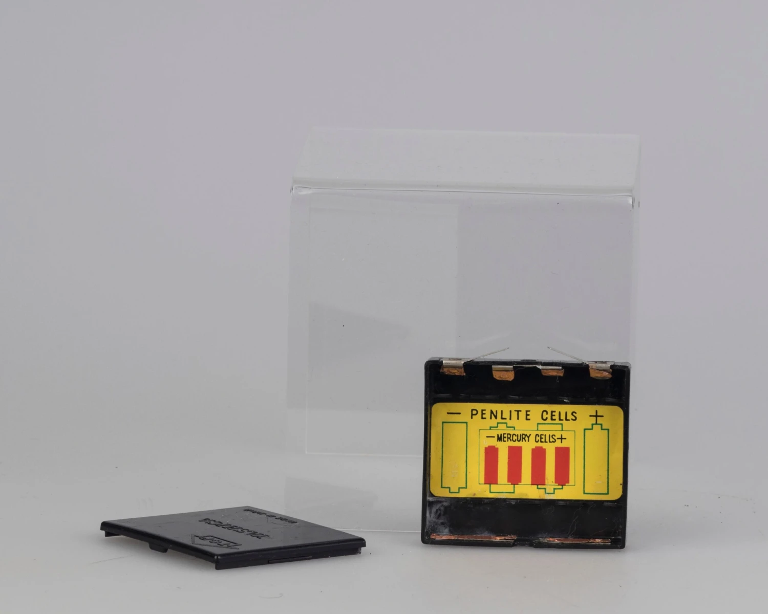 The camera was tested with film installed (the film was not developed); the motor is running smoothly. The light meter is responding to light and it appears to be accurate but we’re unable to guarantee its accuracy. There is some tarnish on in the light meter battery chamber but it doesn’t seem to affect conductivity. The motor battery holder also had a bit of tarnish, we added some copper tape to improve conductivity. The included original carrying case shows significant wear (See photos).