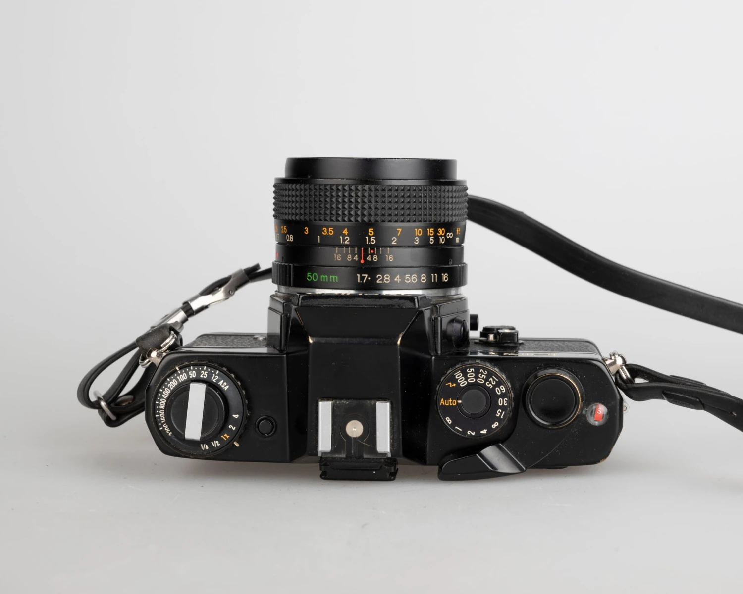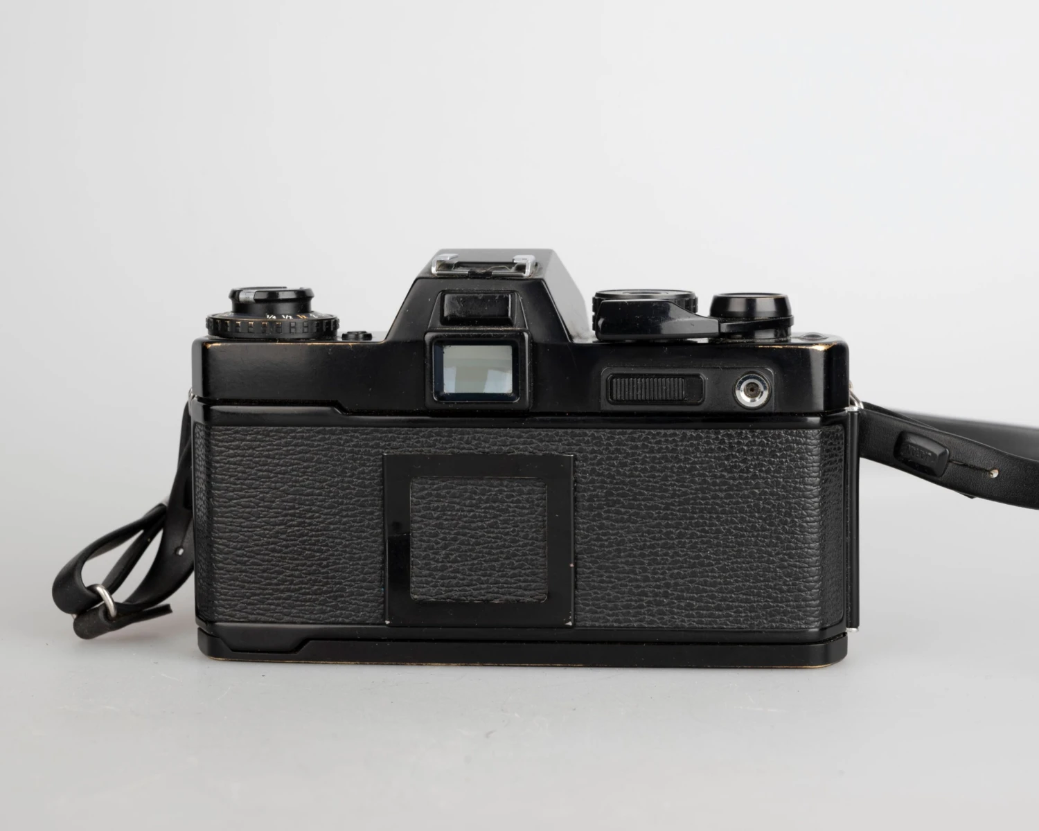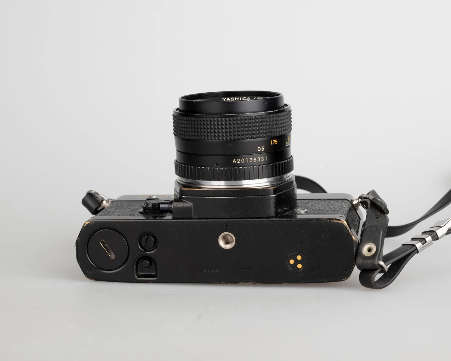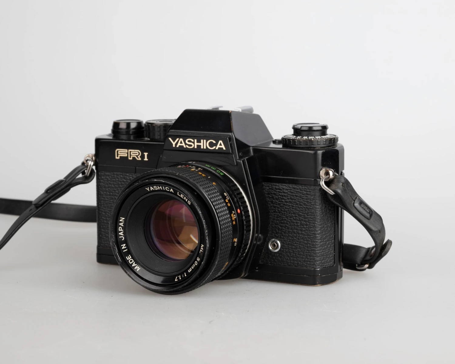 The Yashica FR-I is a sophisticated aperture-priority automatic exposure 35mm from the late 1970s. It shares many design elements with the professional Contax RTS, including the slick ‘feather touch’ shutter release and the C/Y lens mount (so it’s compatible with a wide library of lenses including the legendary Carl Zeiss T* series). The included lens is a very sharp Yashica ML 50mm f/1.7 (6 elements in 5 groups).