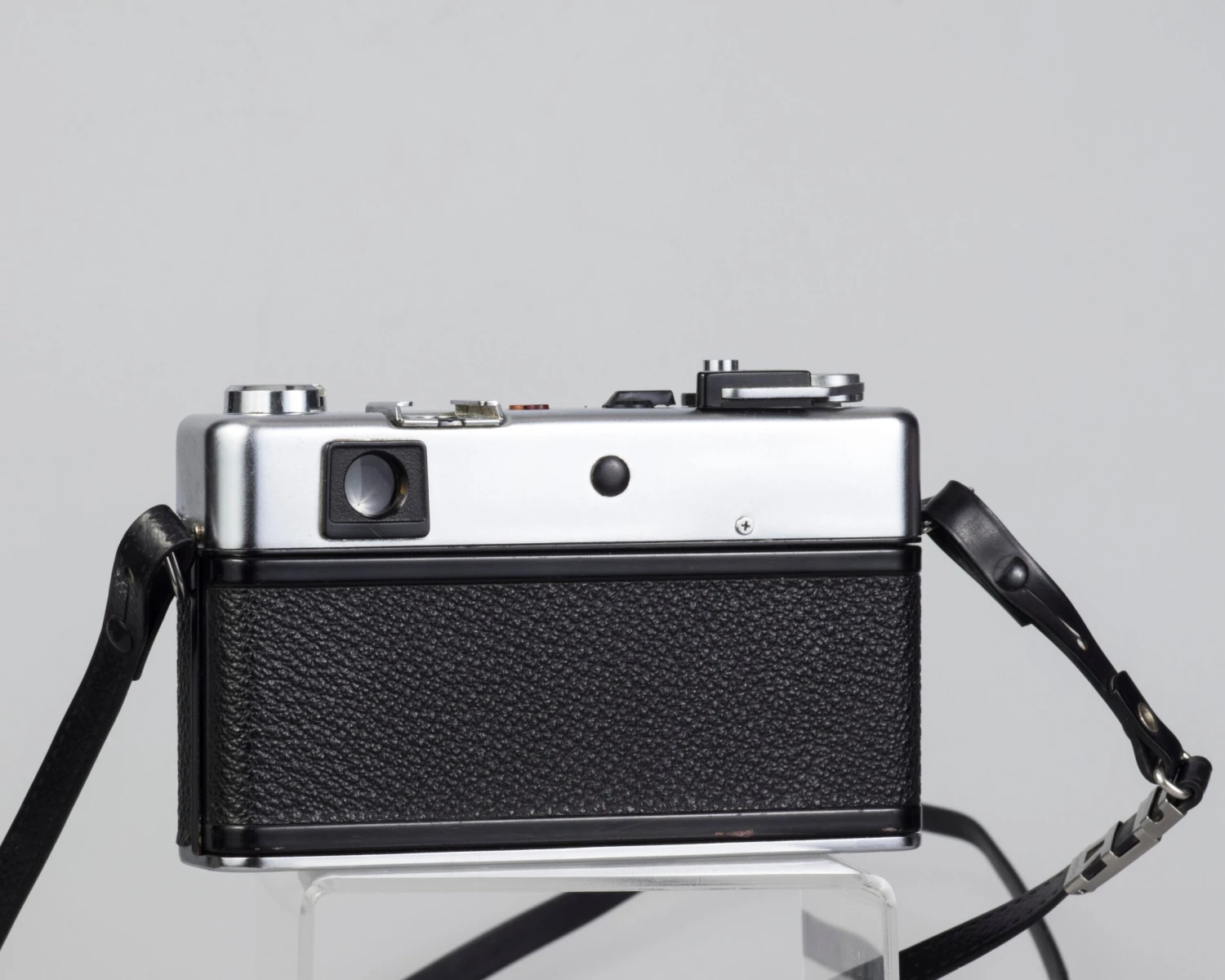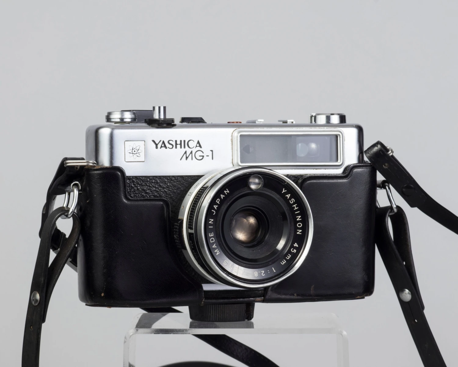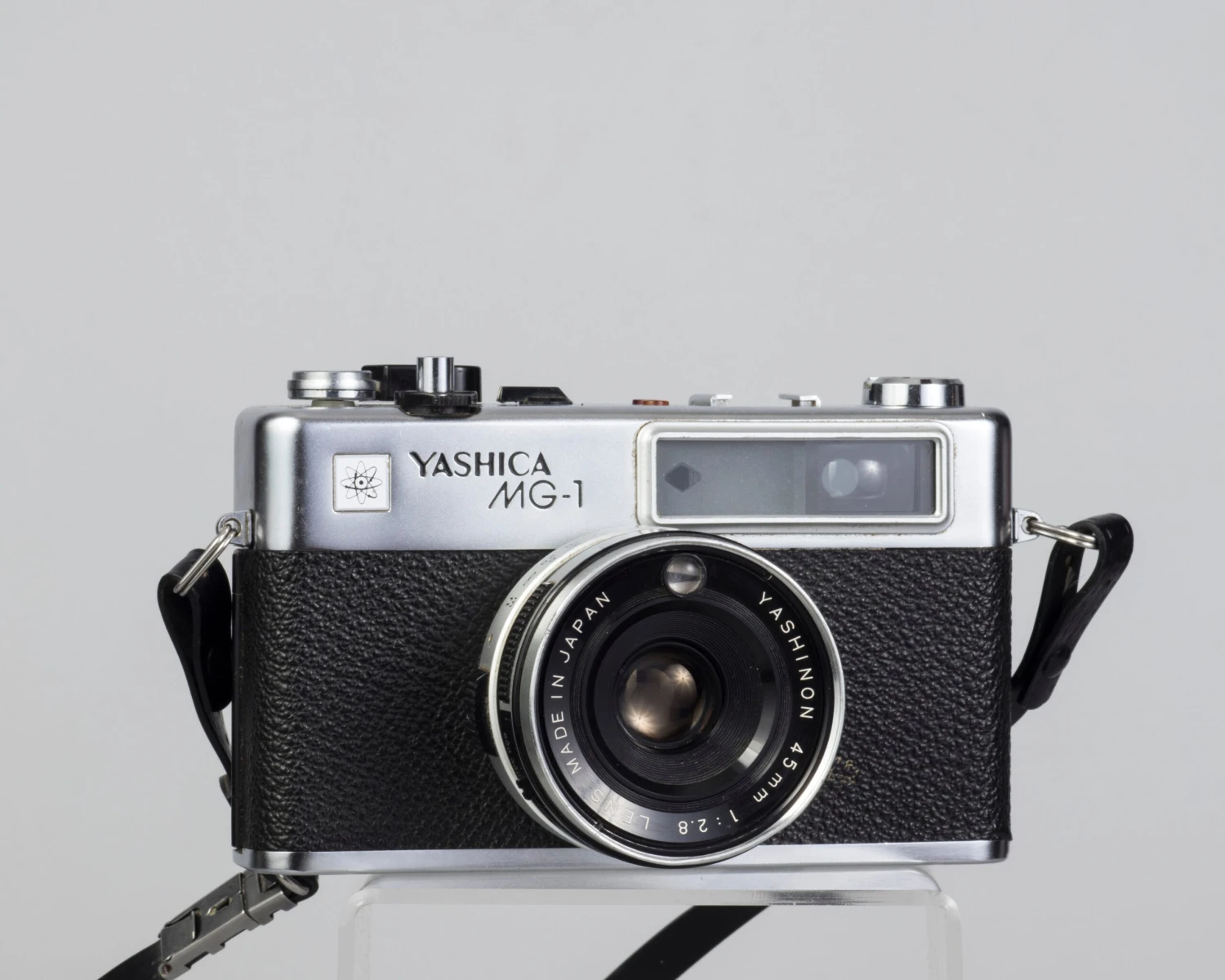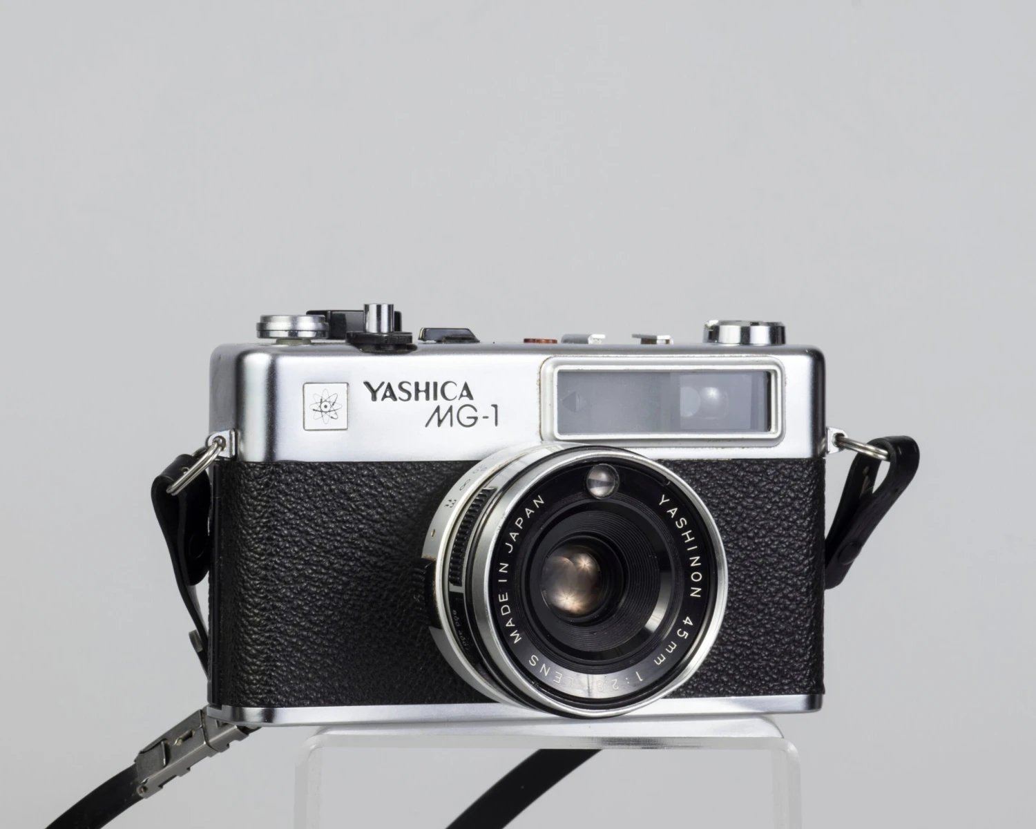 The Yashica MG-1 is a classic 35mm rangefinder camera from the 1970s. It’s sometimes described as a ‘simplified Electro 35’–the little brother to the famed ‘Spider-Man camera’. This camera features a sharp Yashinon 45 mm f/2.8 lens (4 elements in 3 groups), a coupled rangefinder with parallax correct marks, and aperture priority exposure.